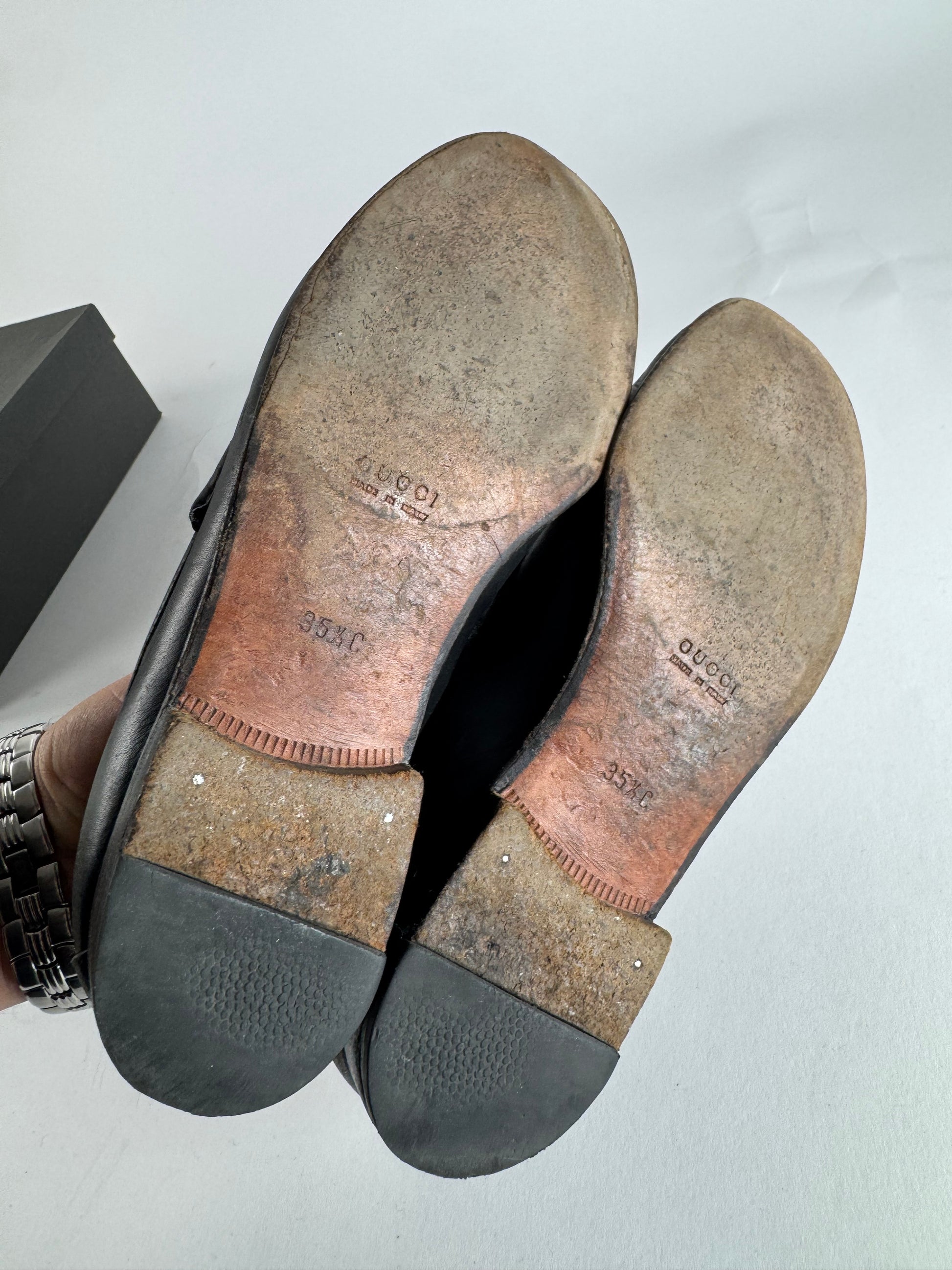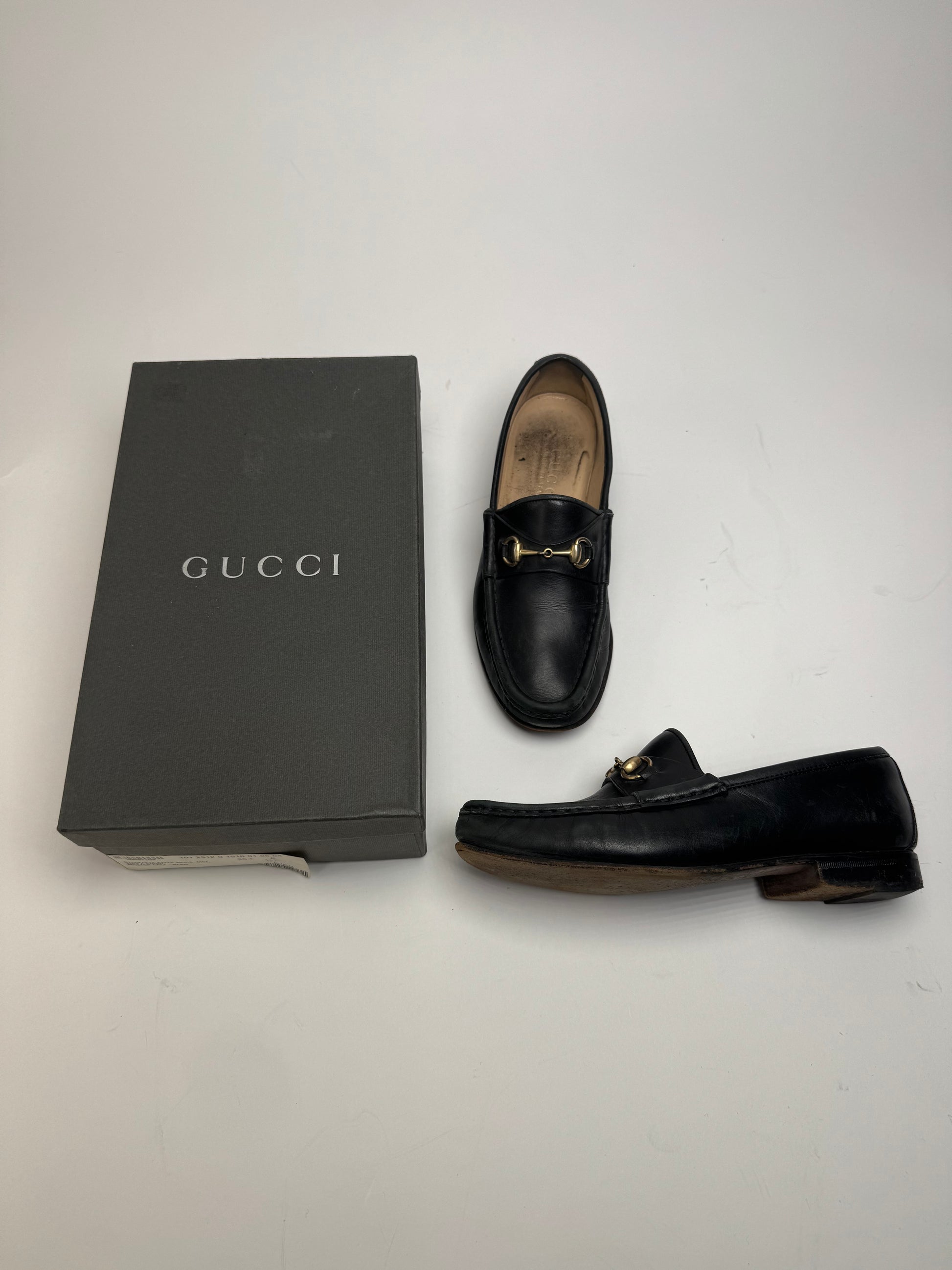 GUCCI Vintage Loafers. These classic loafers are finely crafted of black leather and feature the iconic horsebit detail across the vamp. Gucci is an iconic Italian luxury house founded in 1921, internationally recognized for its craftsmanship and signature heritage designs. The shoes feature a structured silhouette with a leather upper and a combined wood and plastic sole.