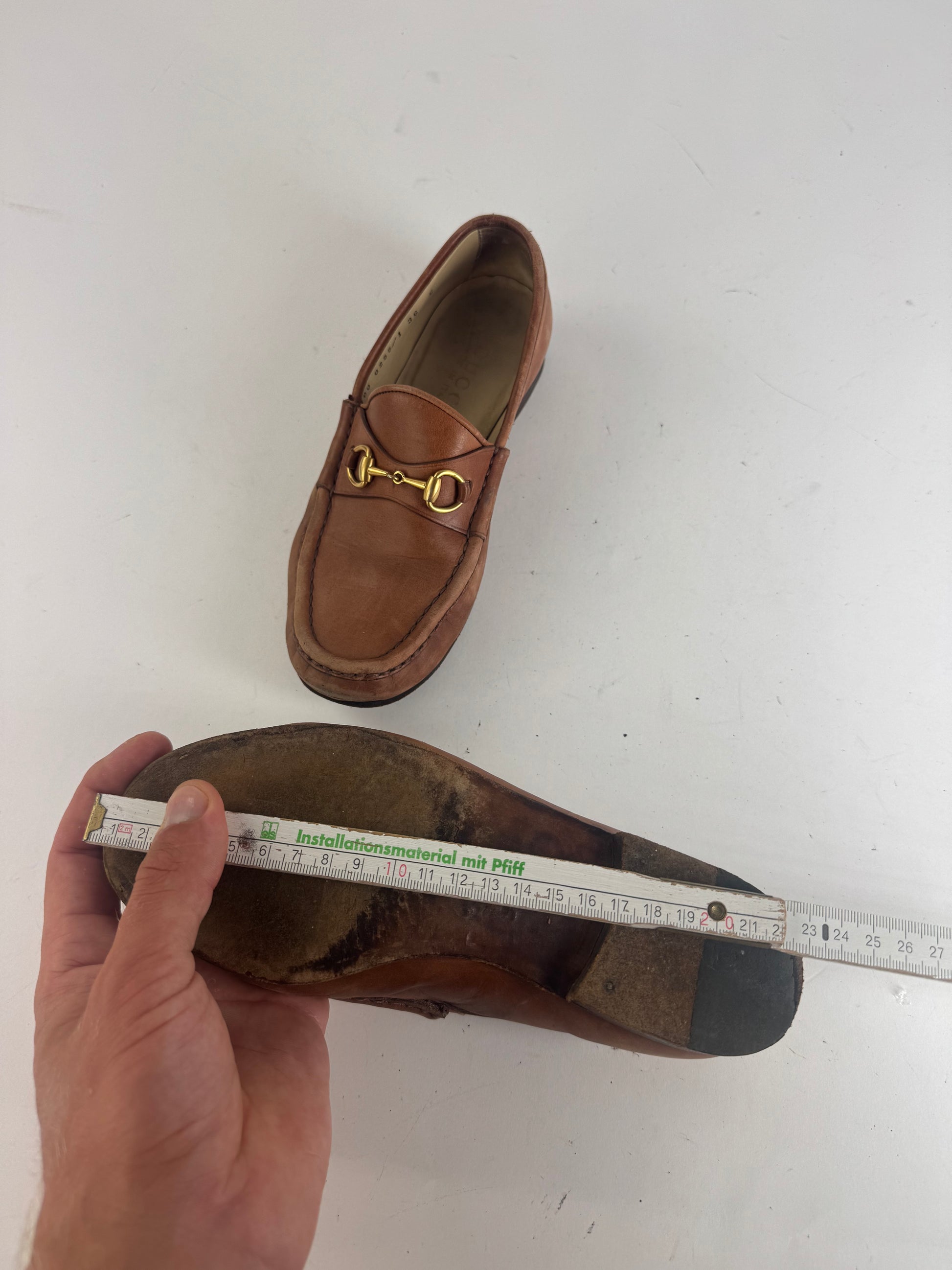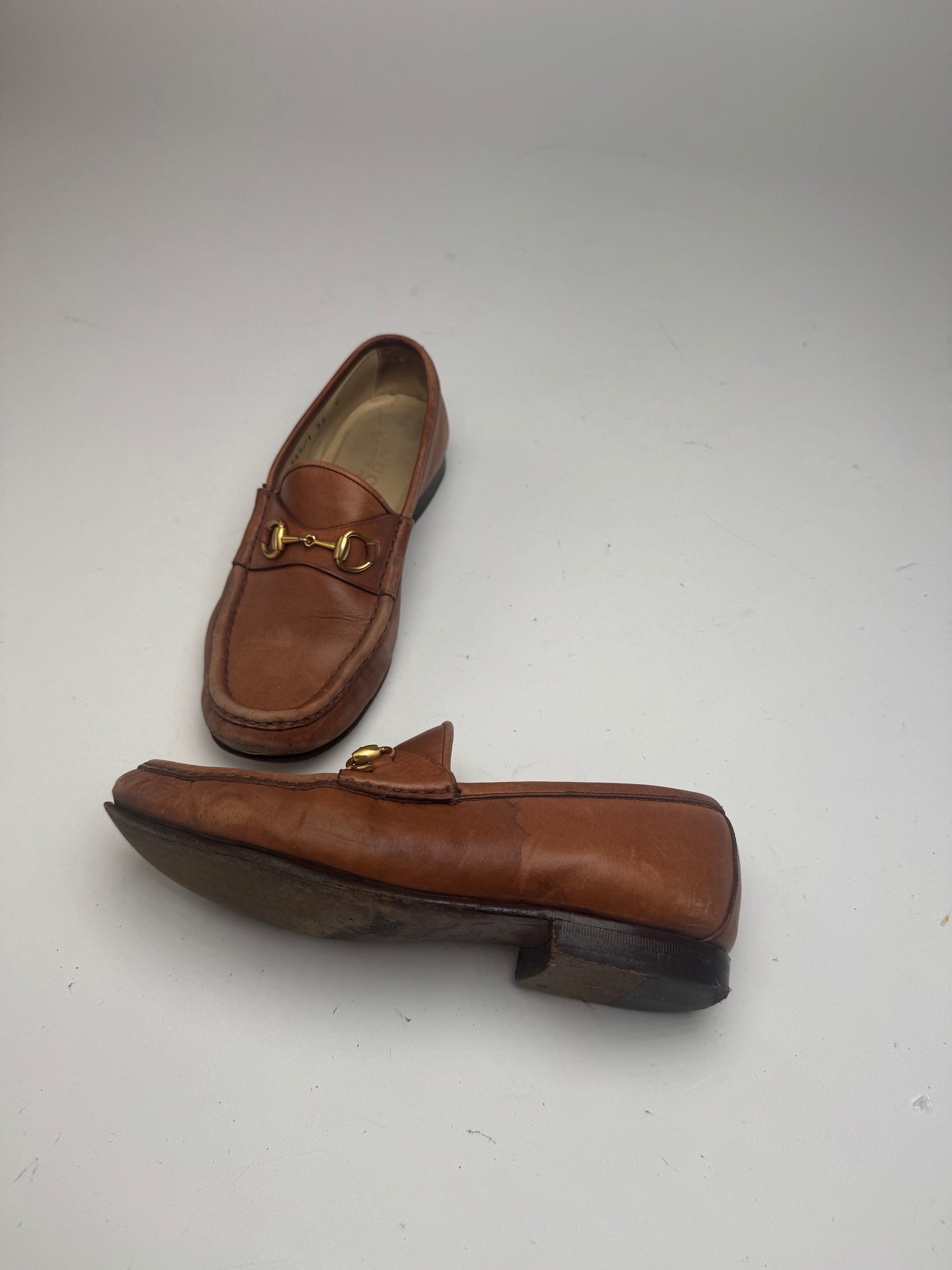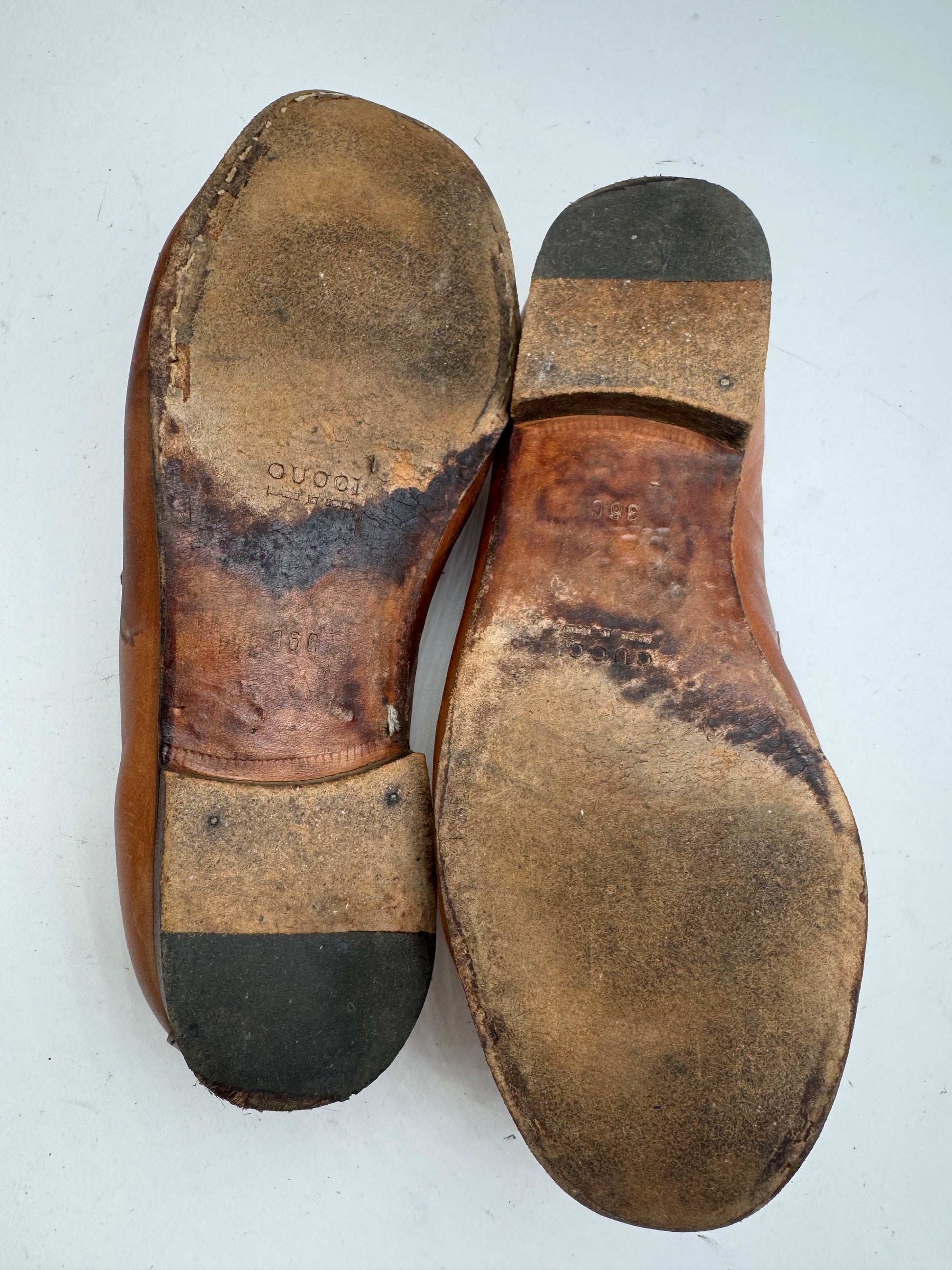 GUCCI Vintage Brown Leather Loafers. These classic loafers are finely crafted of brown leather with the iconic Gucci horsebit in gold-tone steel across the vamp. Introduced in 1953, the horsebit design has become one of Gucci’s most recognisable symbols, blending Italian craftsmanship with equestrian heritage. The shoes feature black wood and rubber soles.