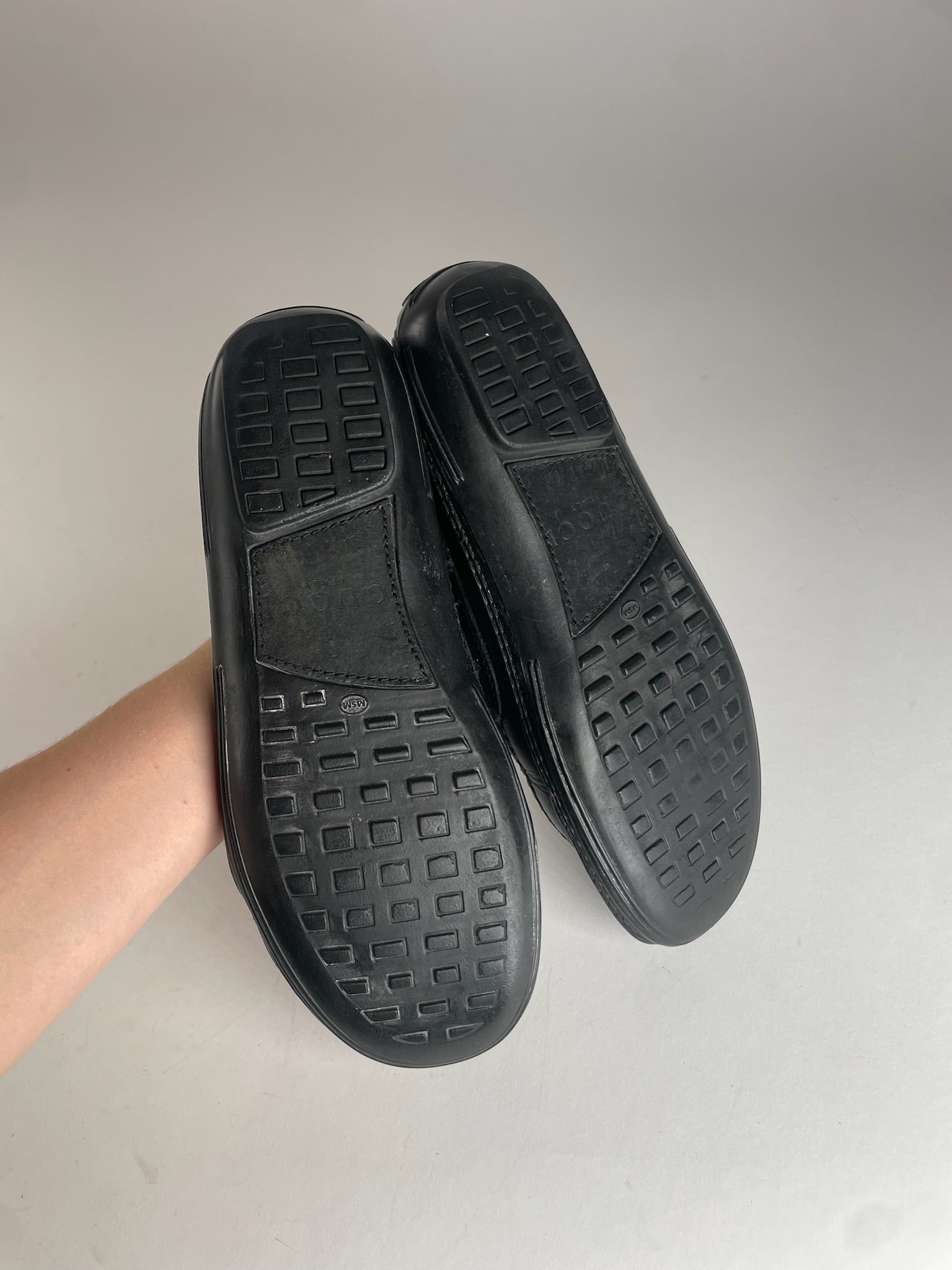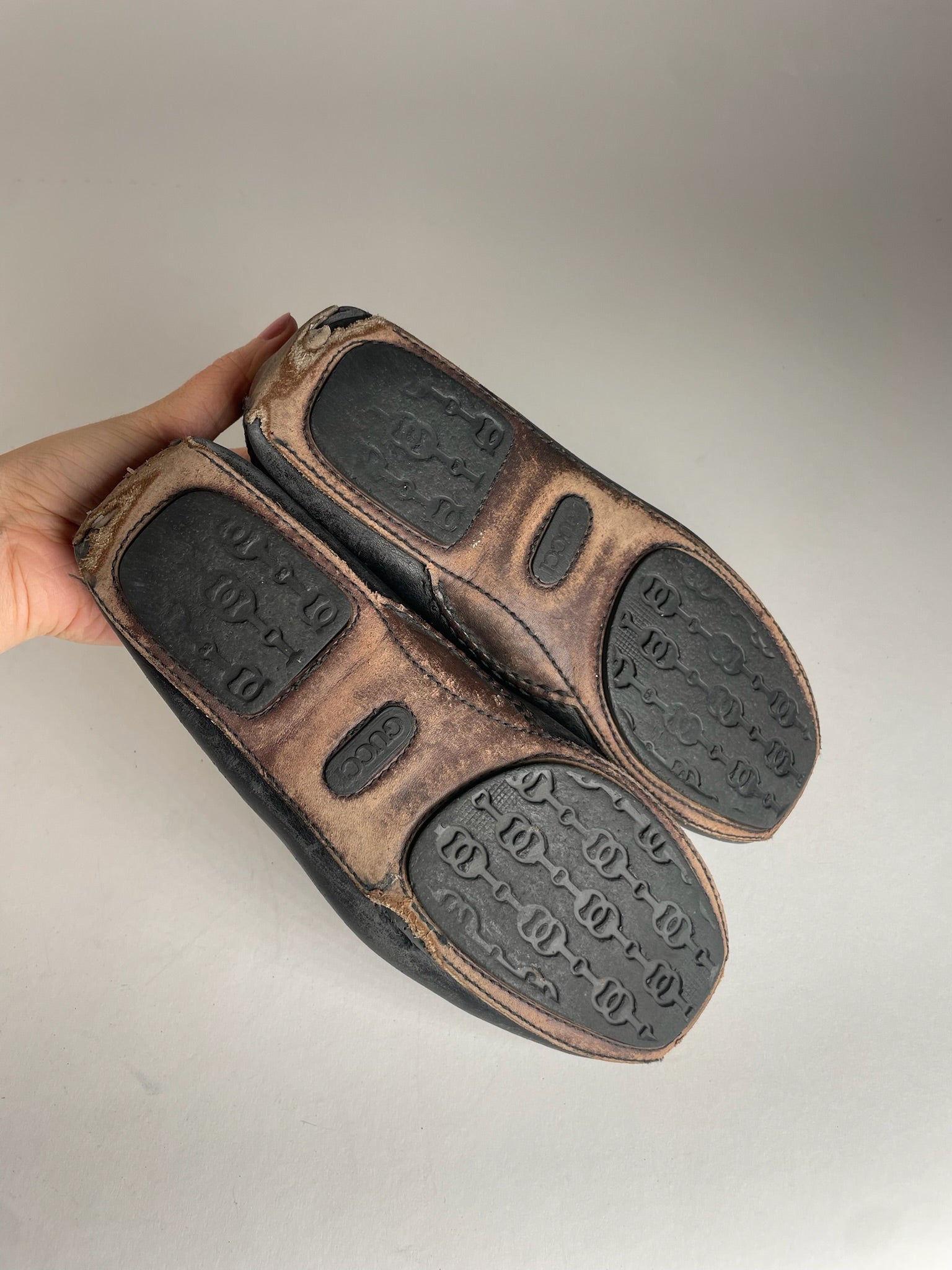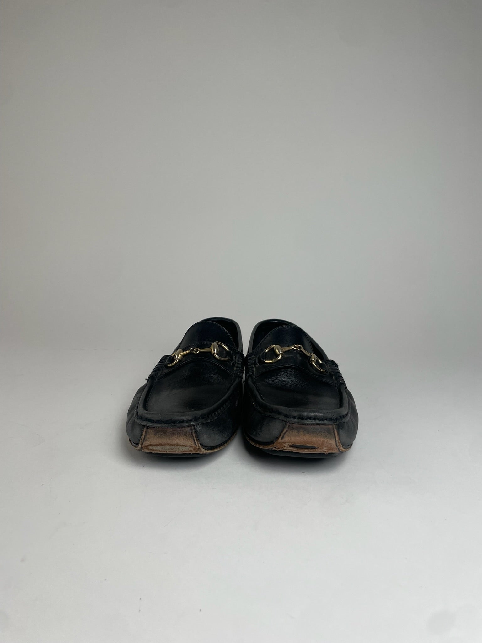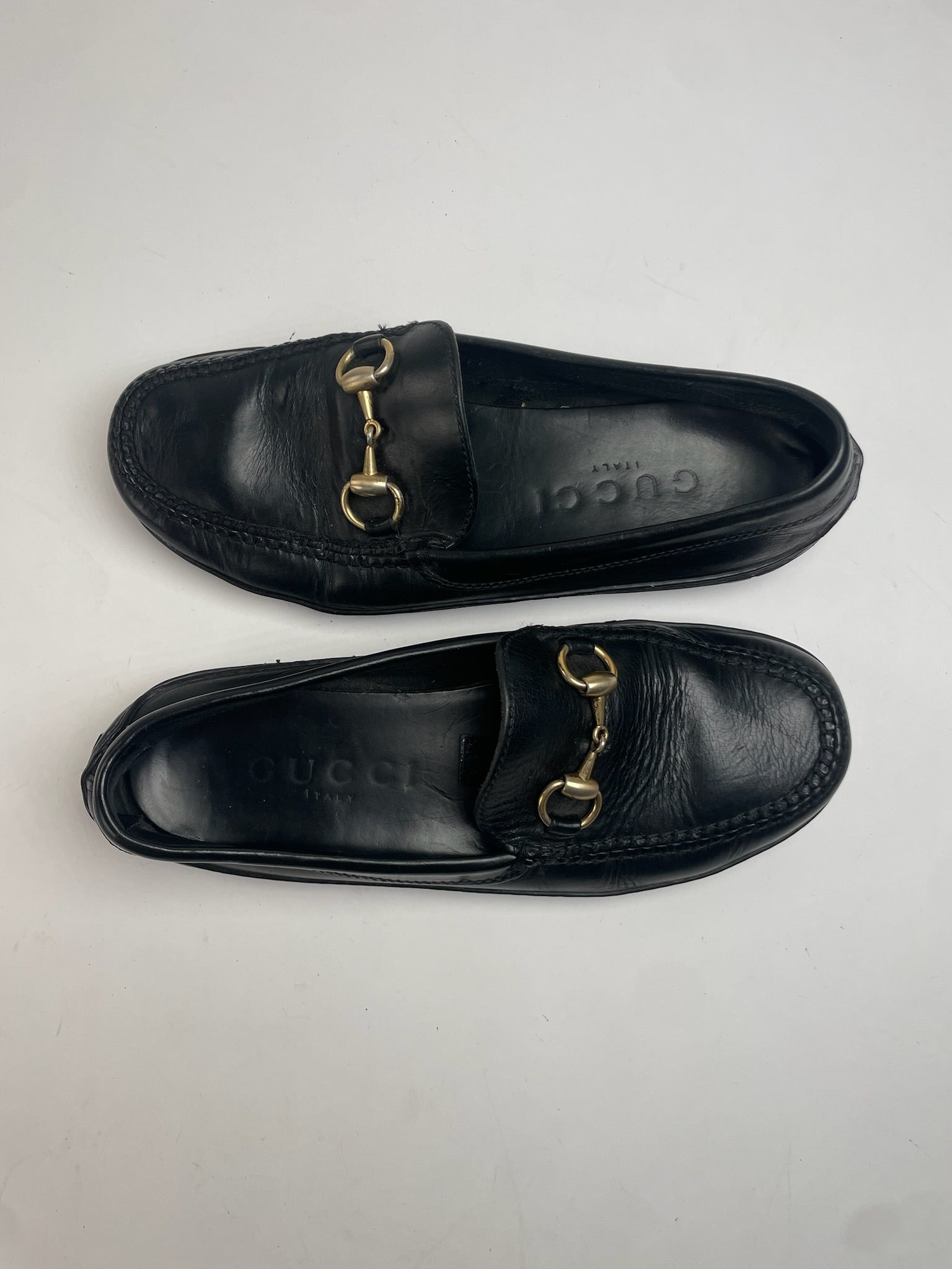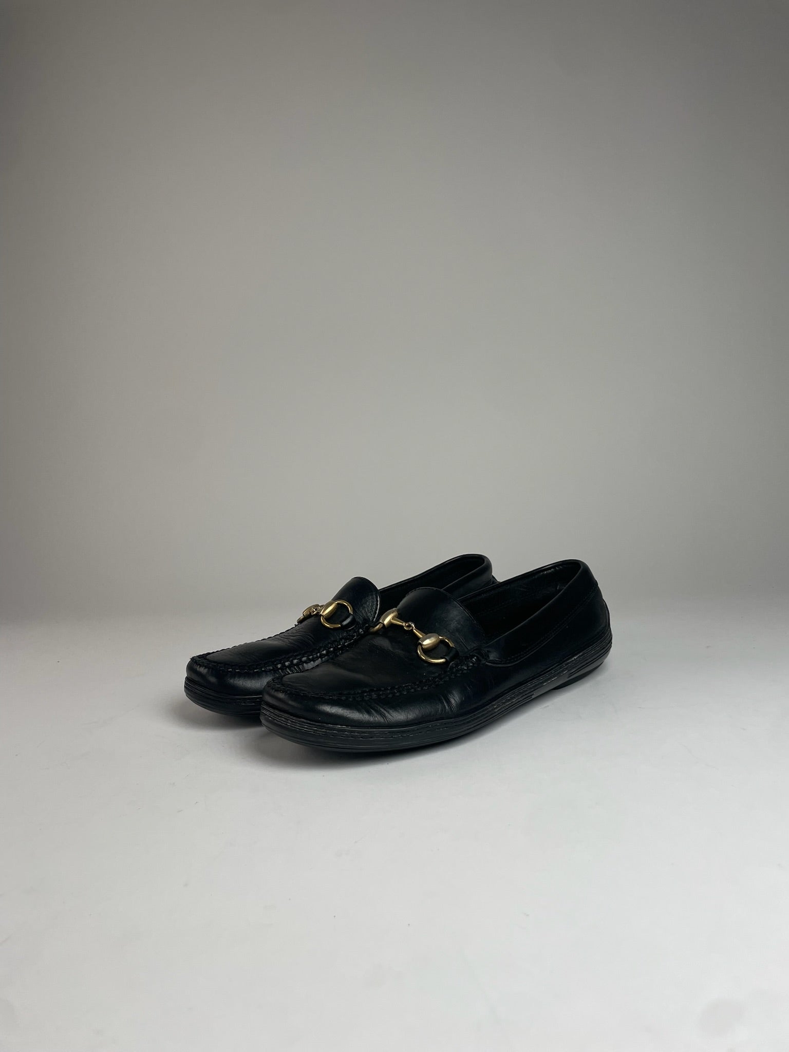 GUCCI Vintage Horsebit Loafers. These timeless loafers are crafted of black leather and feature the iconic Gucci Horsebit detail in gold-tone steel across the vamp. First introduced in 1953, the Horsebit loafer became one of Gucci’s most celebrated signatures, inspired by the world of equestrian hardware and remaining a classic symbol of the House’s heritage ever since. The interior is finished in black leather and the shoes feature a brown wooden sole with rubber detailing, embossed with a Horsebit monogram.