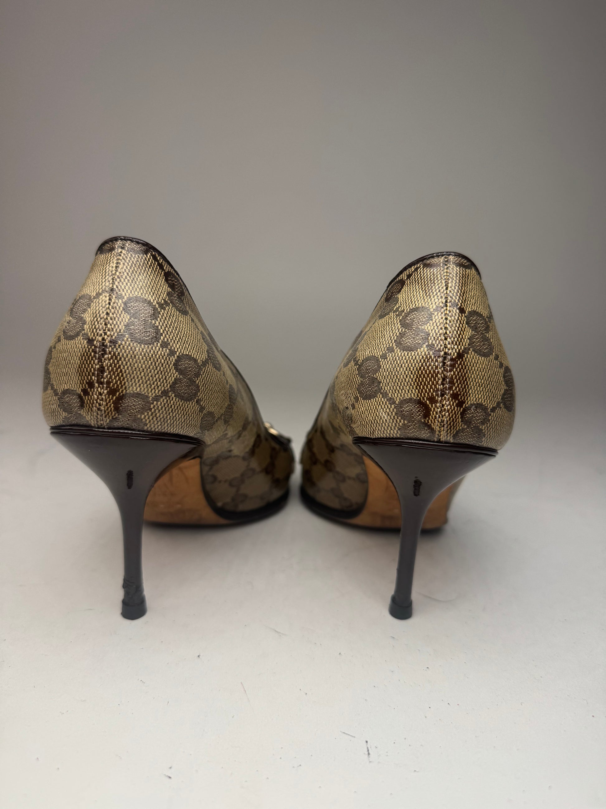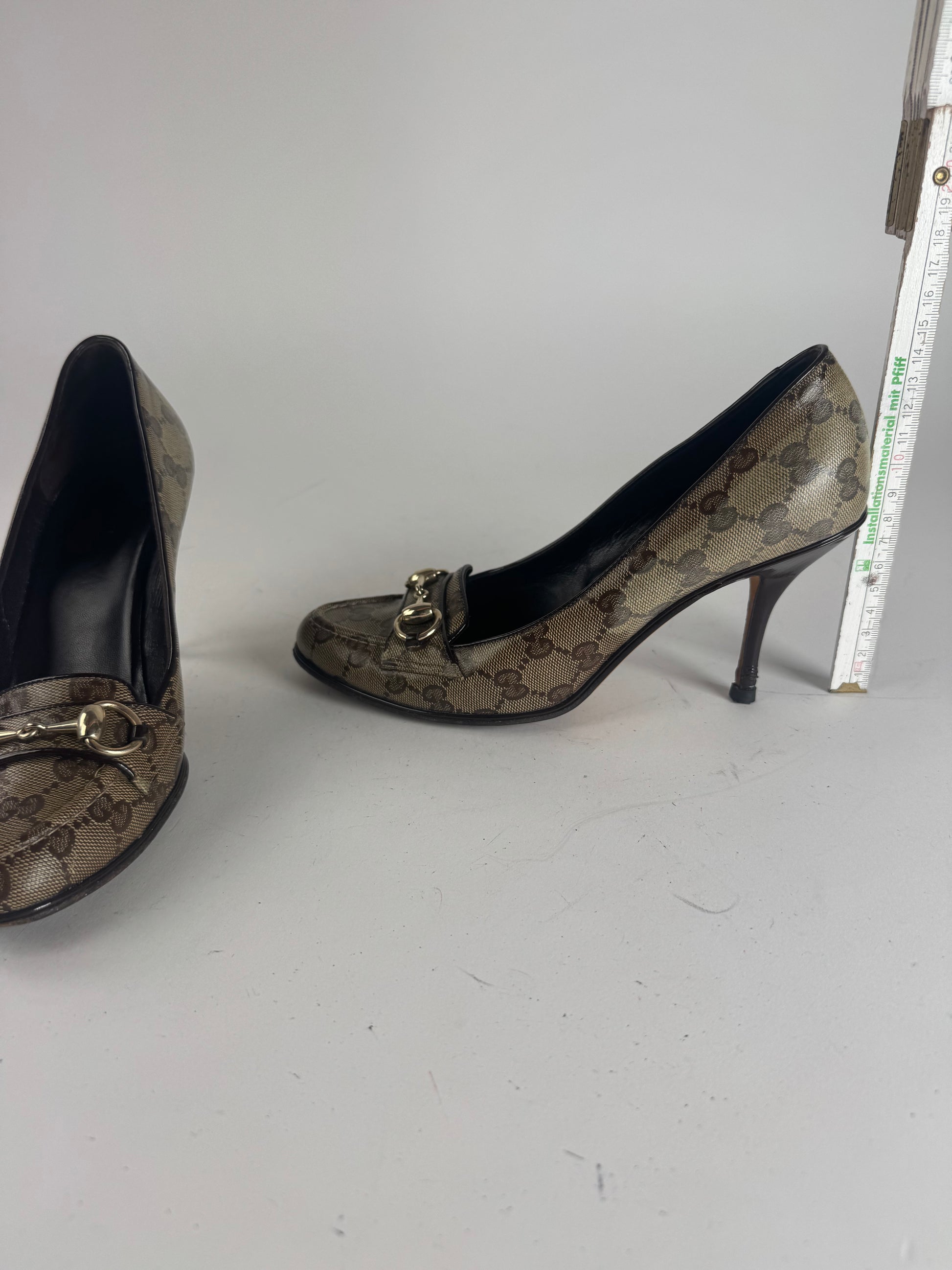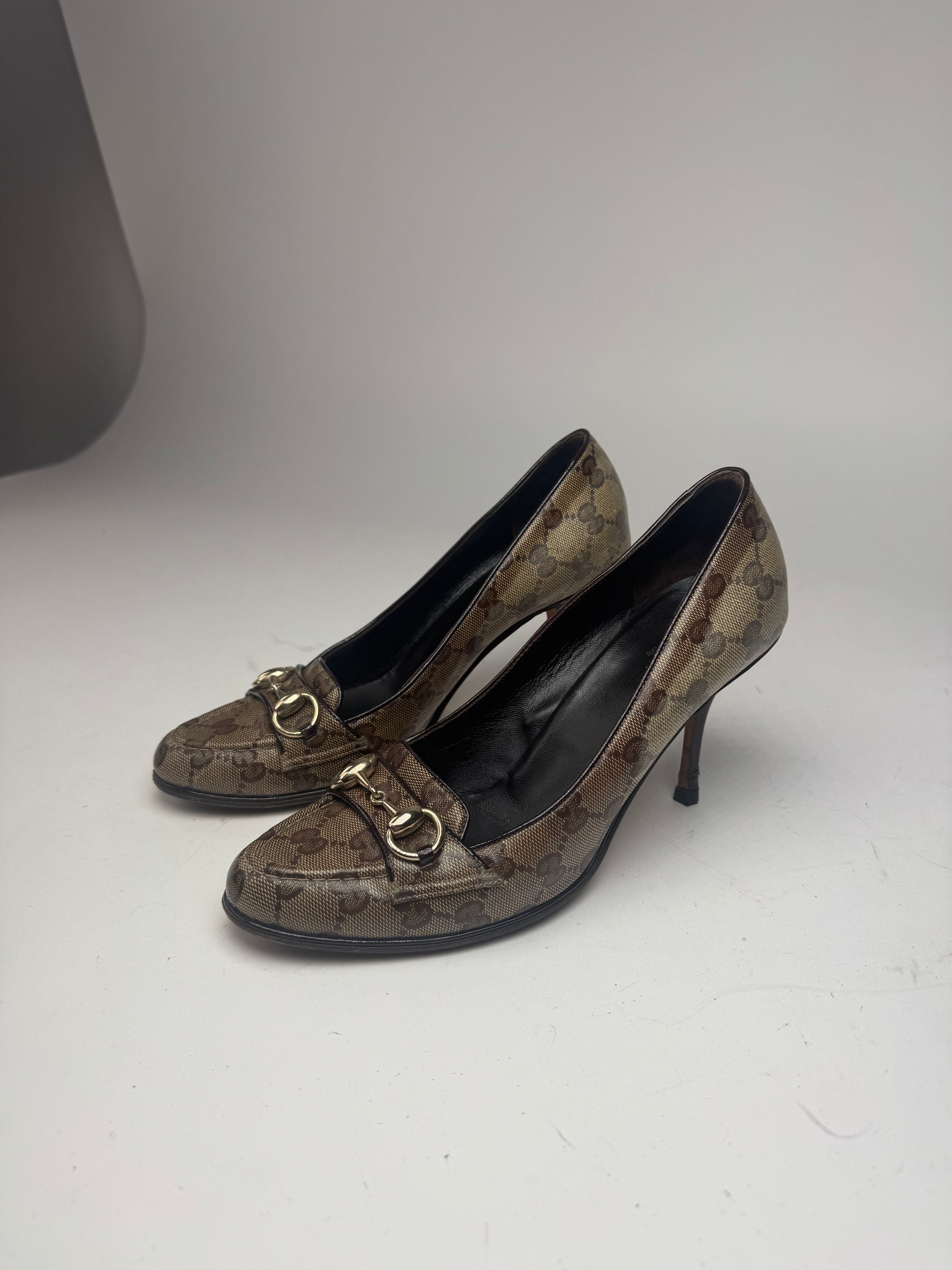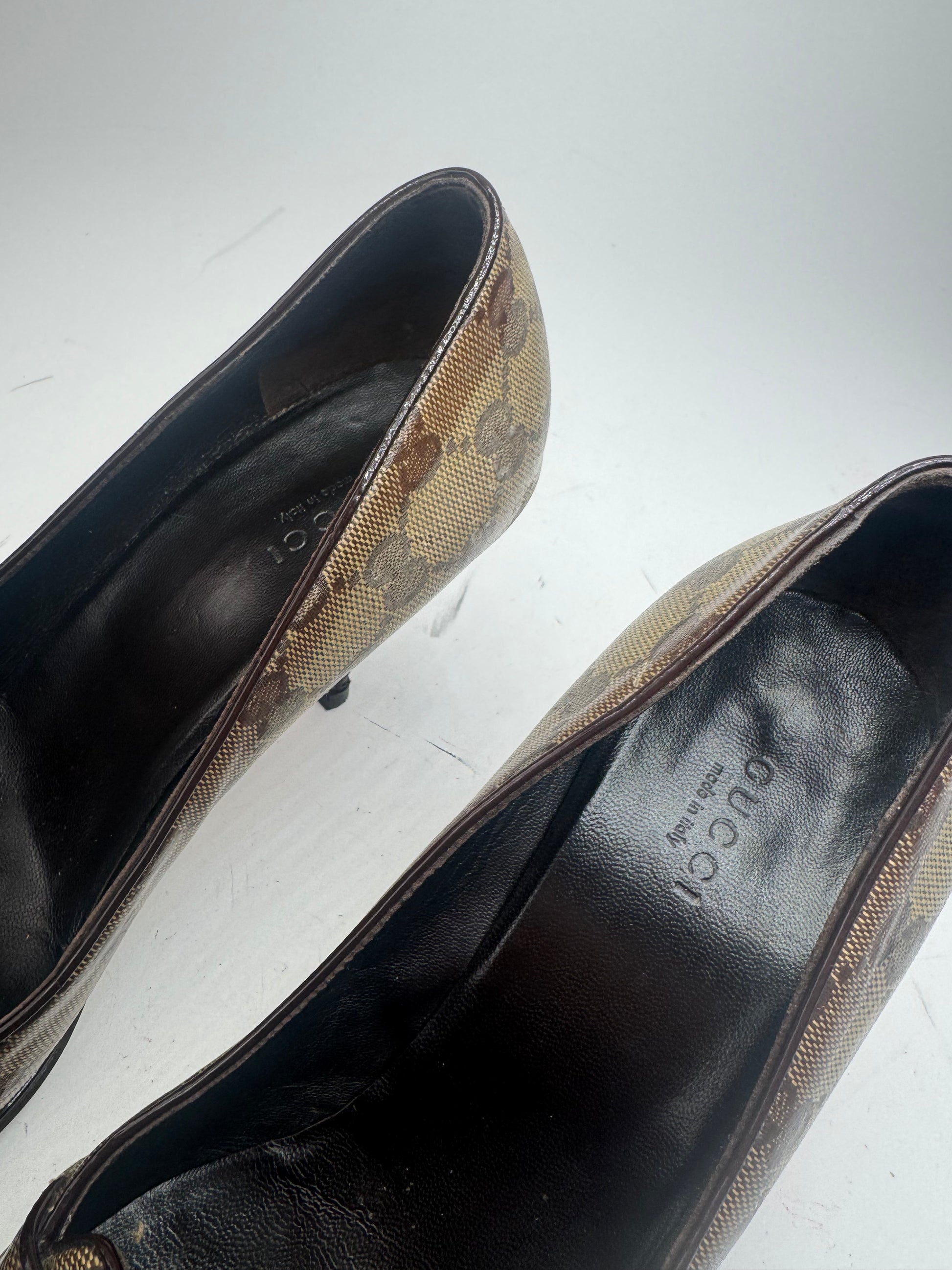 Vintage Gucci Horsebit Monogram Leather Pumps Beige Brown 37