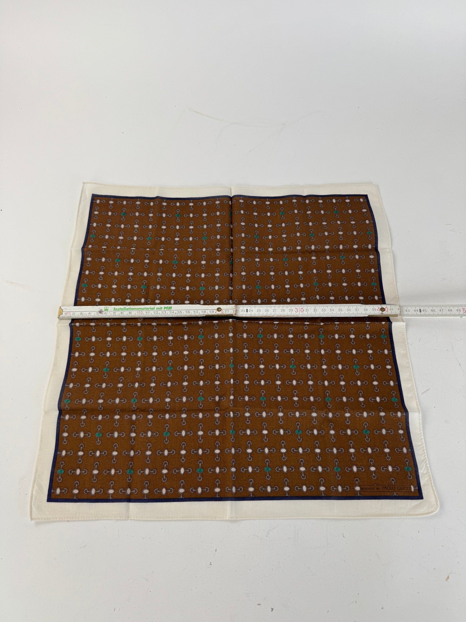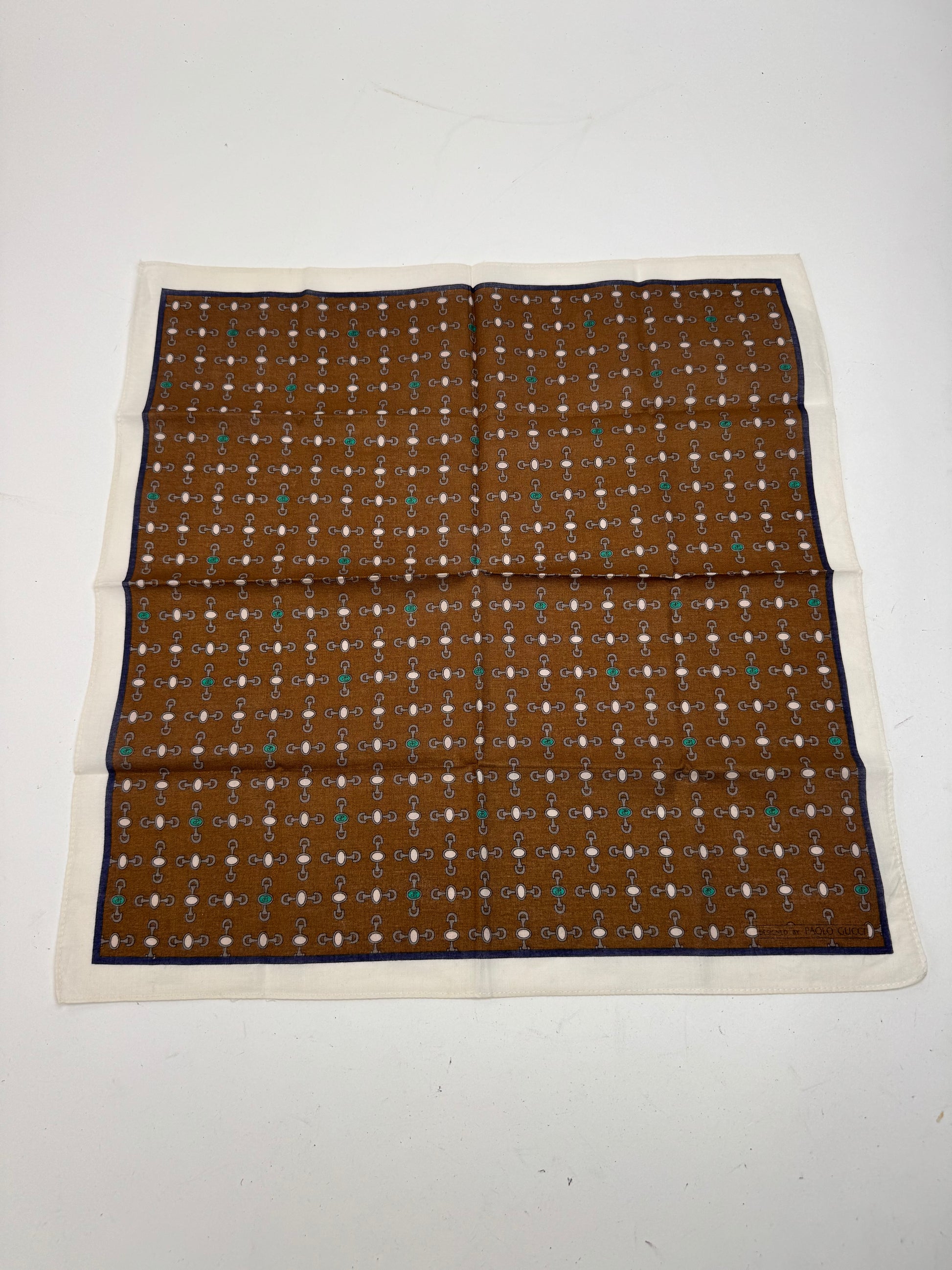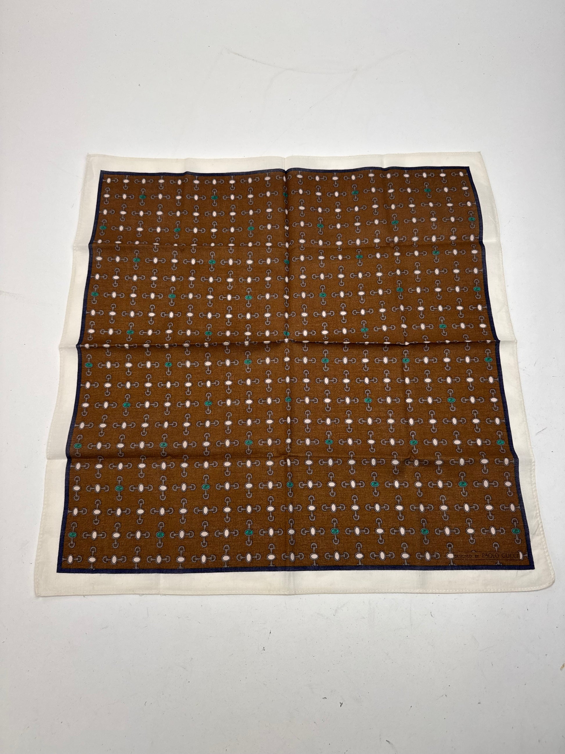 This chic scarf is finely crafted of canvas with a white border and a brown base decorated with silver, white, and turquoise horseshoe logos. The design stems from Paolo Gucci, grandson of the founder Guccio Gucci, who was known for his bold and innovative interpretations that carried the Gucci legacy forward in the 1970s and 1980s.