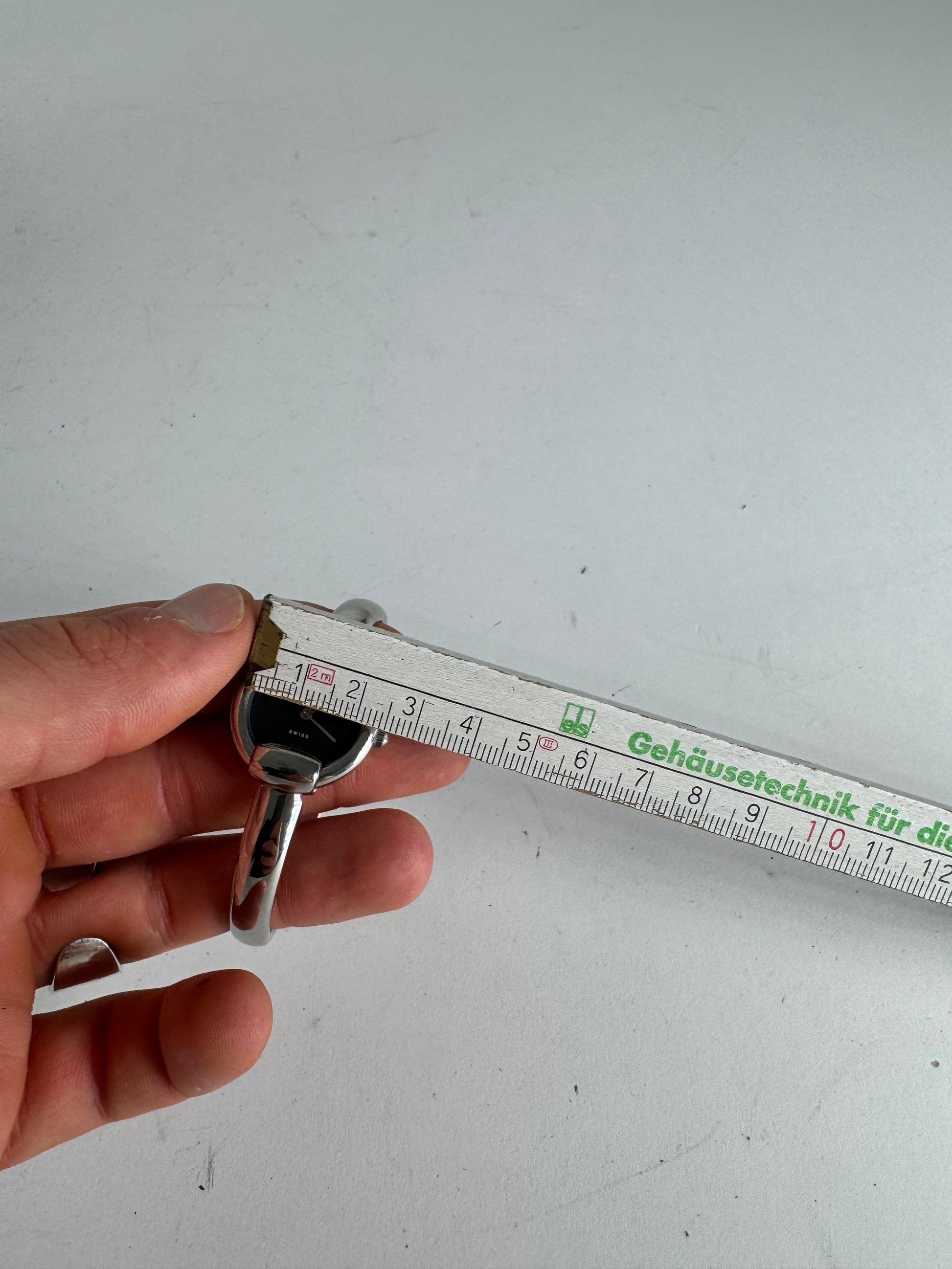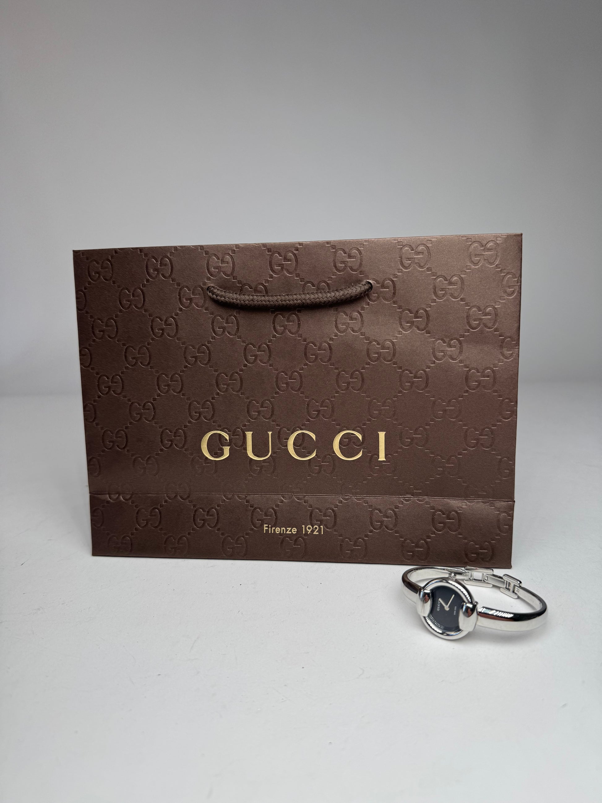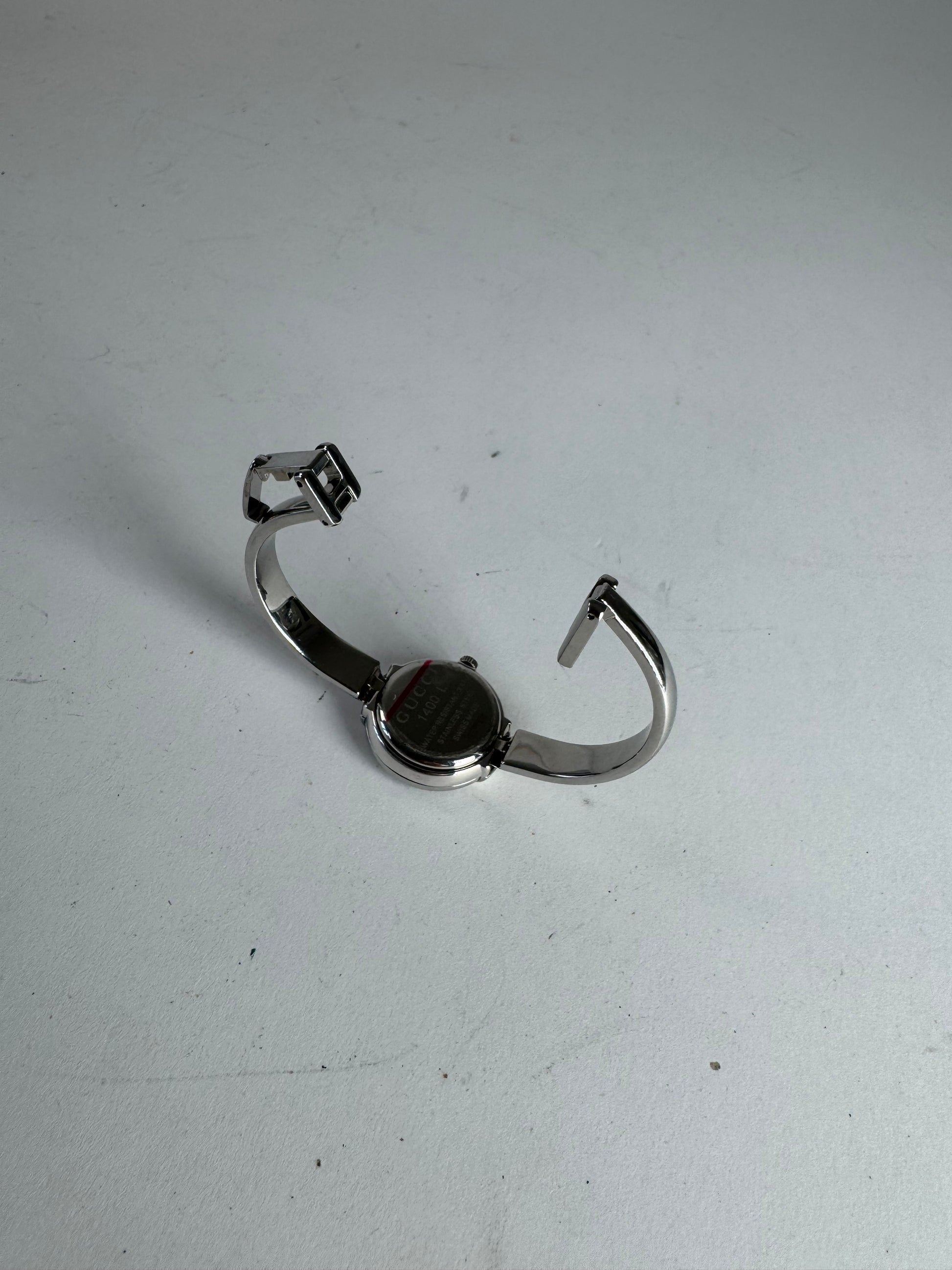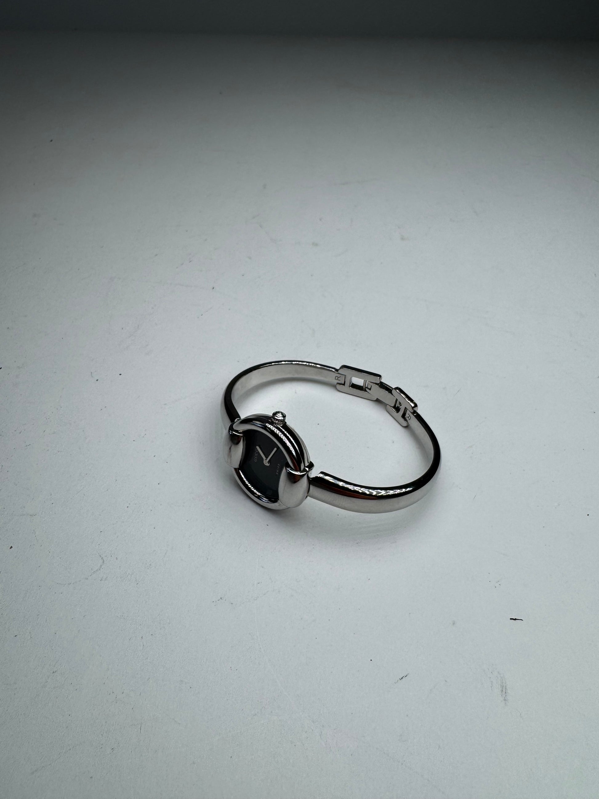 GUCCI Vintage Watch. This chic timepiece is finely crafted of silver-tone stainless steel with a black dial. It features a Swiss-made quartz movement and is water-resistant.