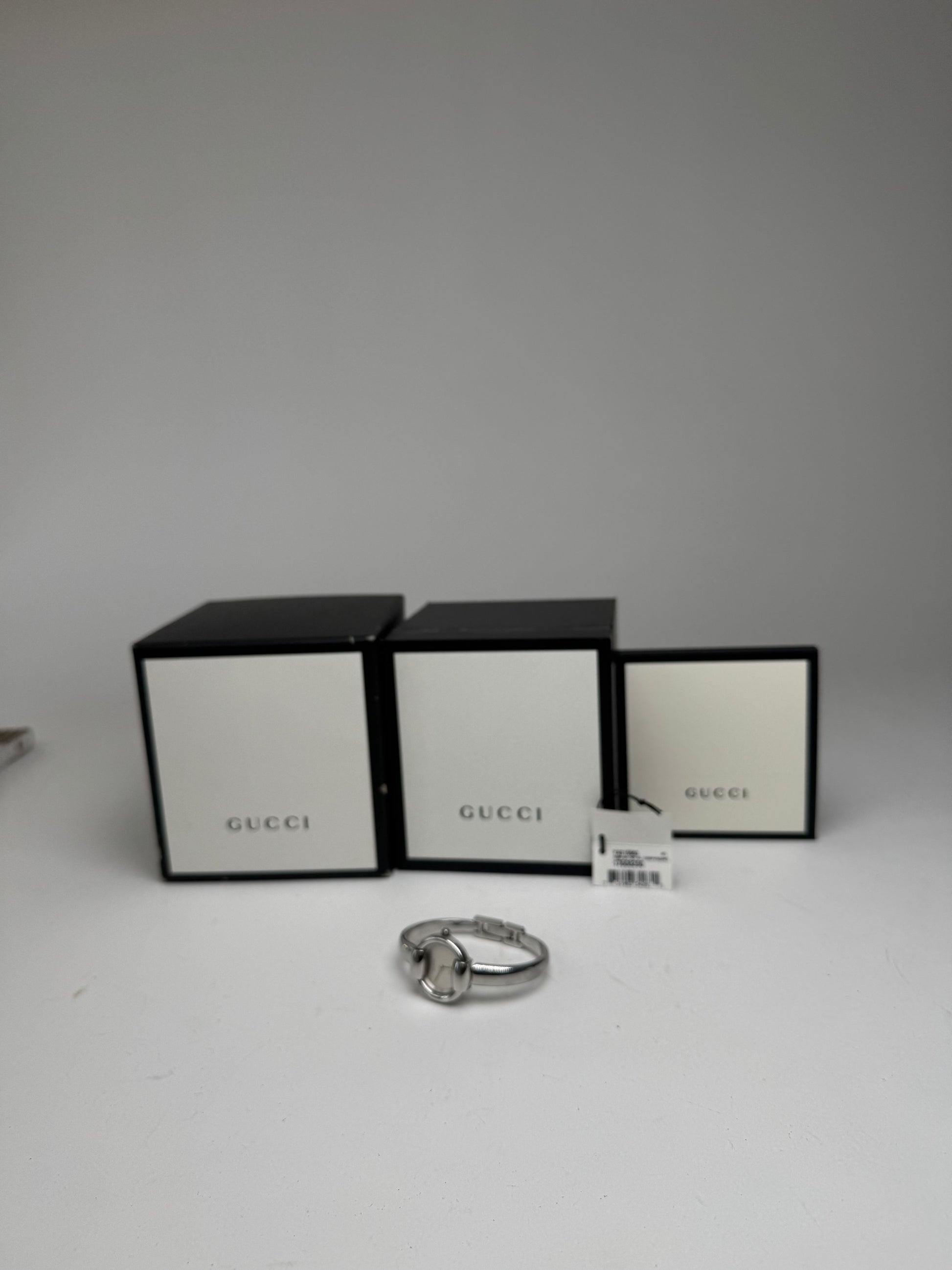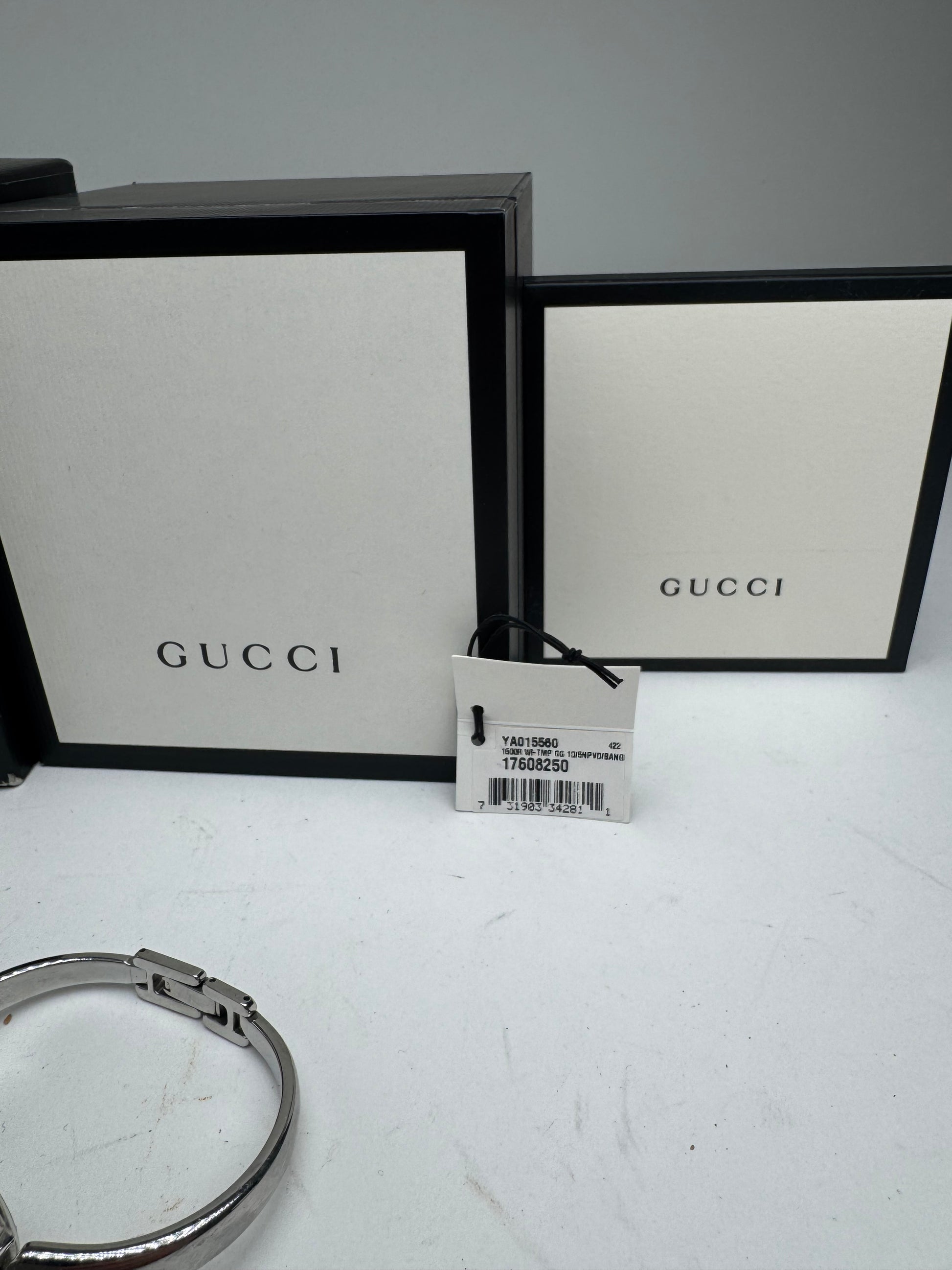 This elegant vintage watch by Gucci features a quartz movement with a new battery and is crafted entirely from silver-tone steel, including the case and the signature horsebit bracelet. The white dial adds a clean, timeless touch to the design.