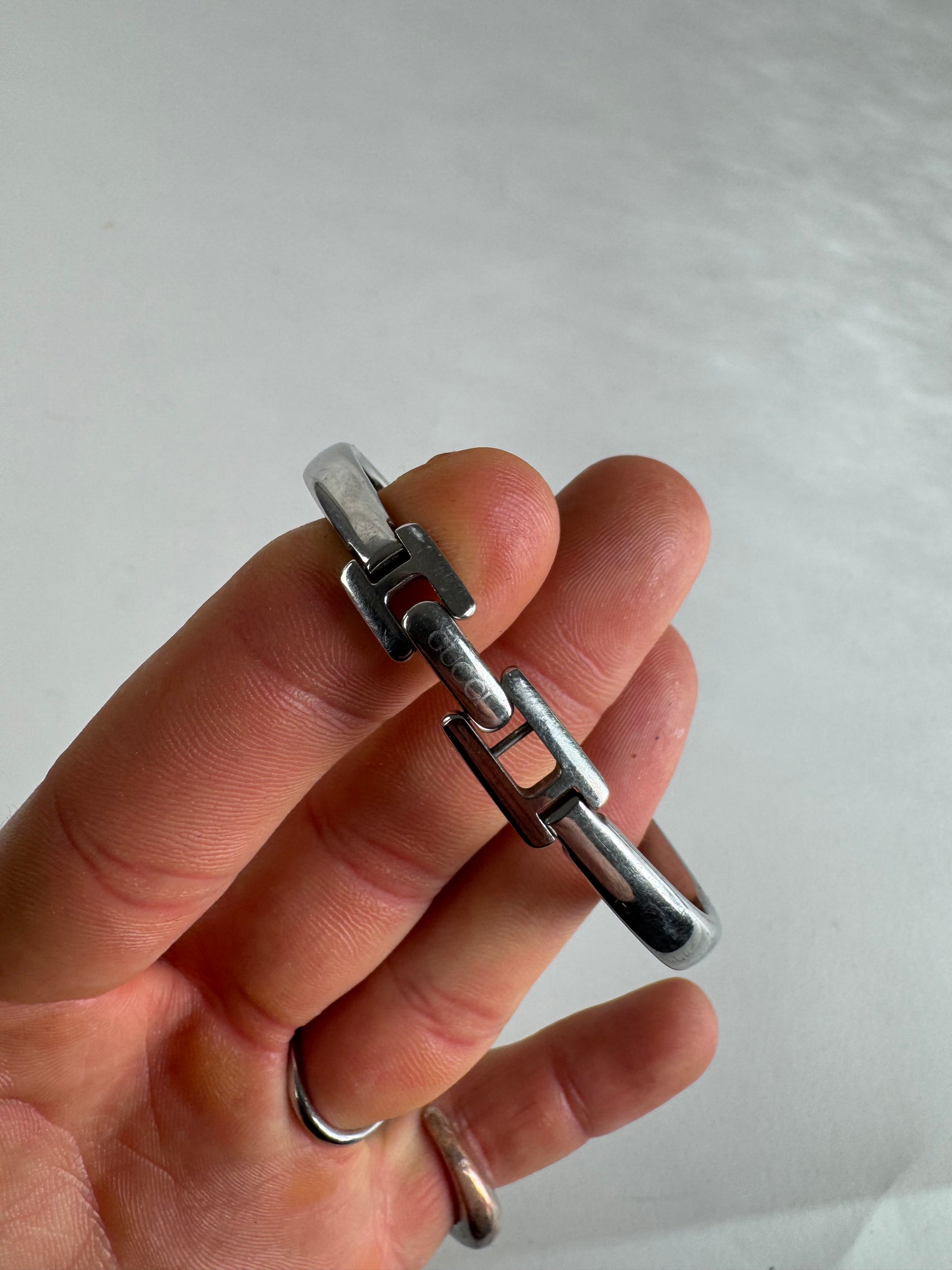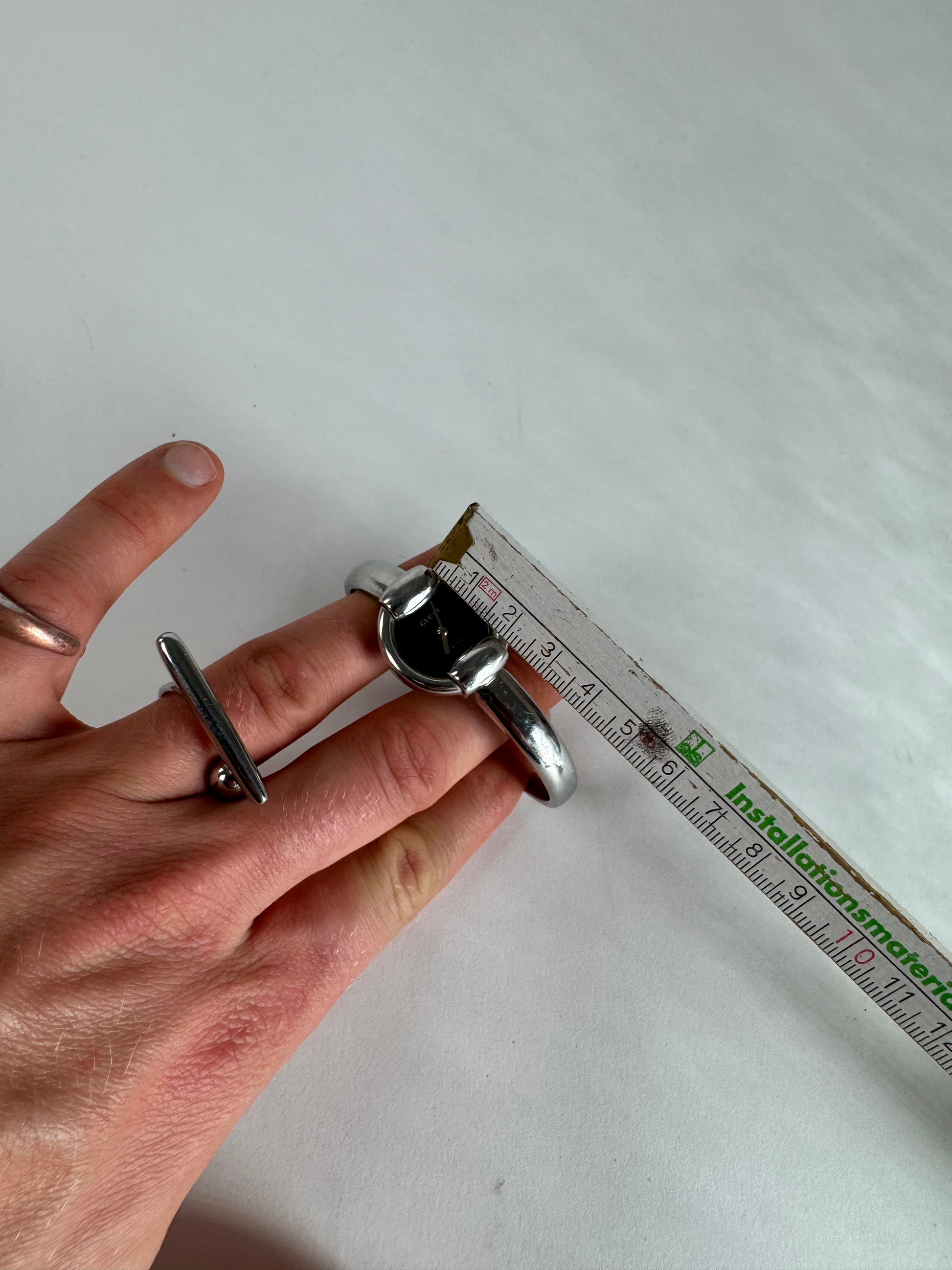 GUCCI Vintage Watch. This elegant vintage Gucci watch is crafted entirely from silver-toned stainless steel, including both the bracelet and case, ensuring durability and timeless sophistication. The black dial provides a sleek contrast, while the quartz movement ensures precision and reliability.