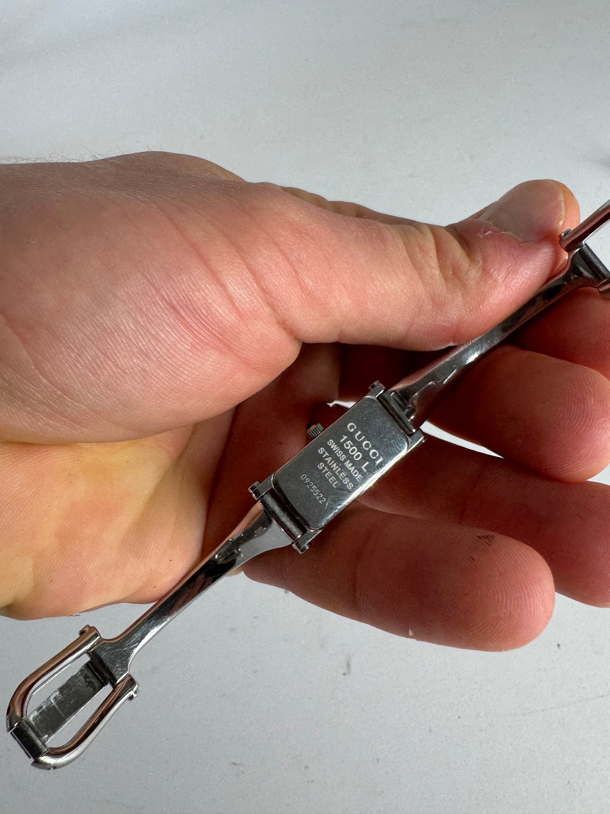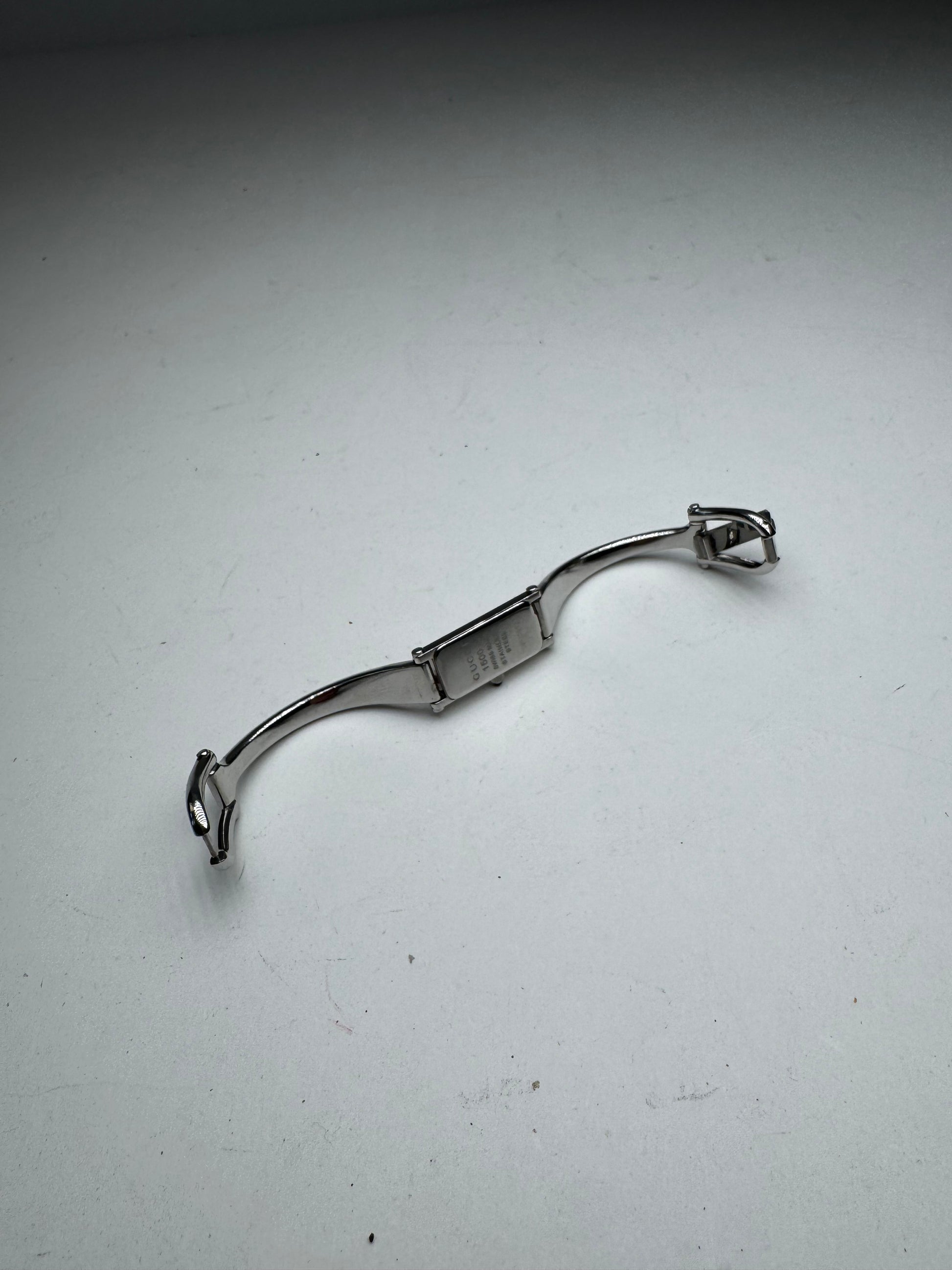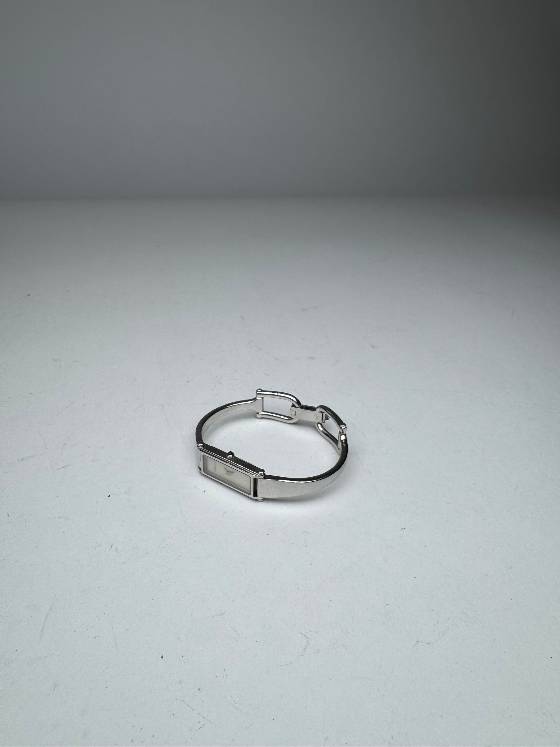 GUCCI Vintage Horsebit Watch. This chic timepiece is finely crafted of silver-tone stainless steel with a white dial and horsebit-style bracelet. It features a Swiss-made quartz movement with a replaced battery and is water-resistant.