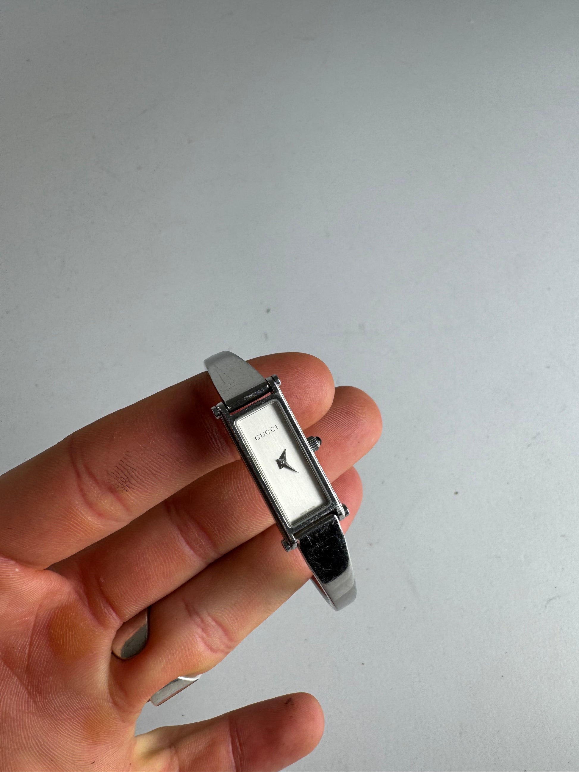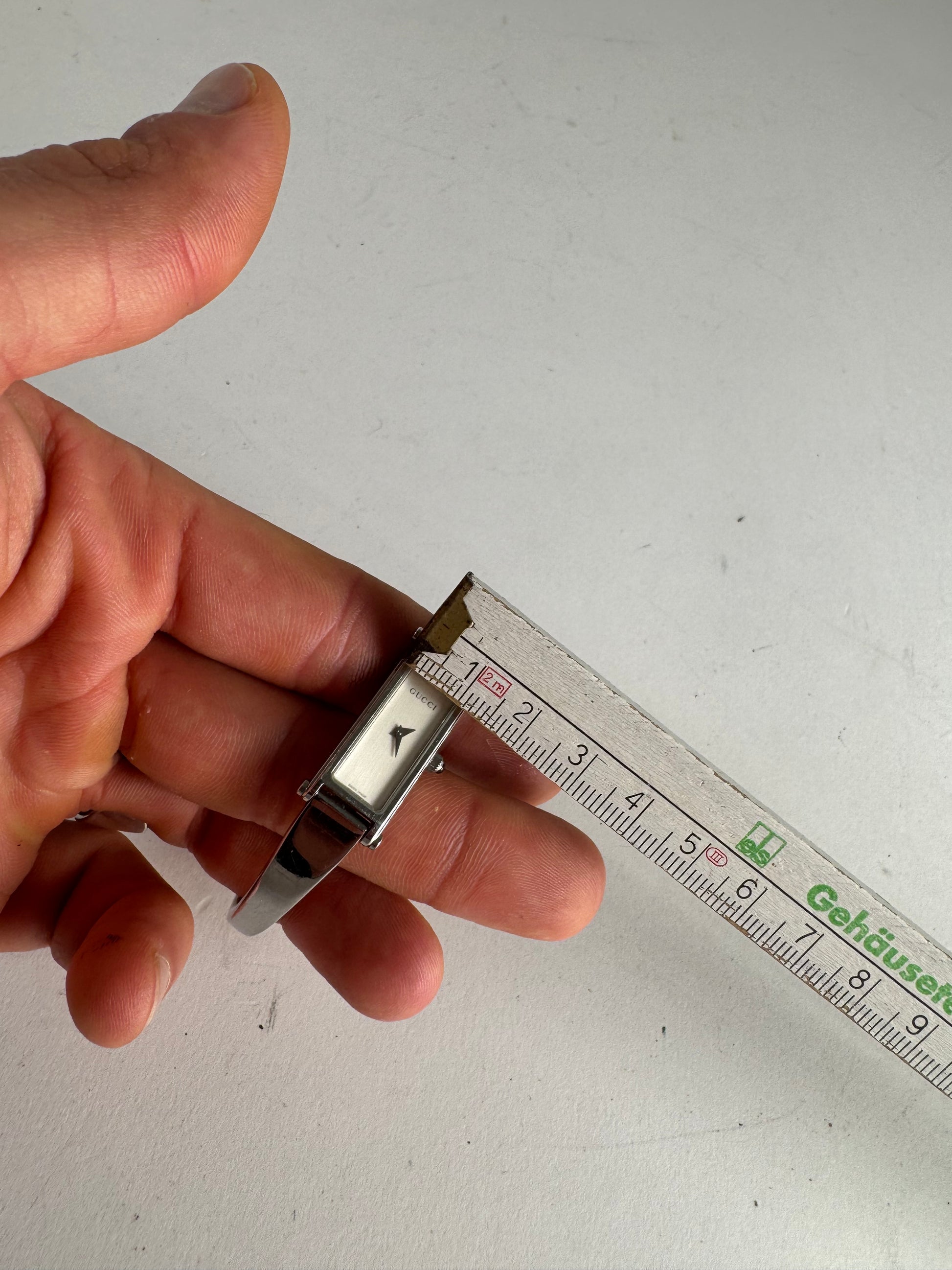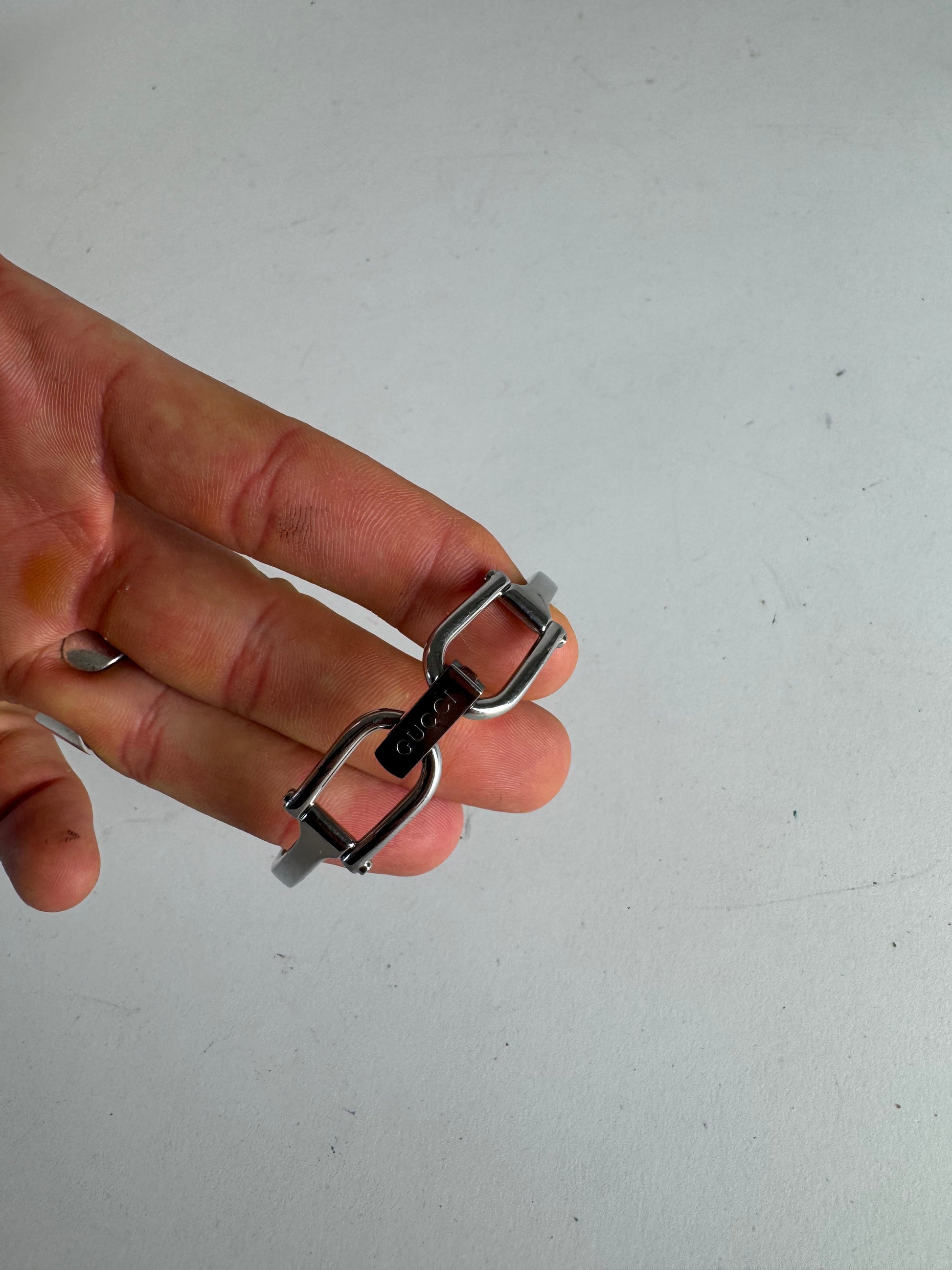 GUCCI Vintage Horsebit Watch. This chic timepiece is finely crafted of silver-tone stainless steel with a white dial and horsebit-style bracelet. It features a Swiss-made quartz movement with a replaced battery and is water-resistant.