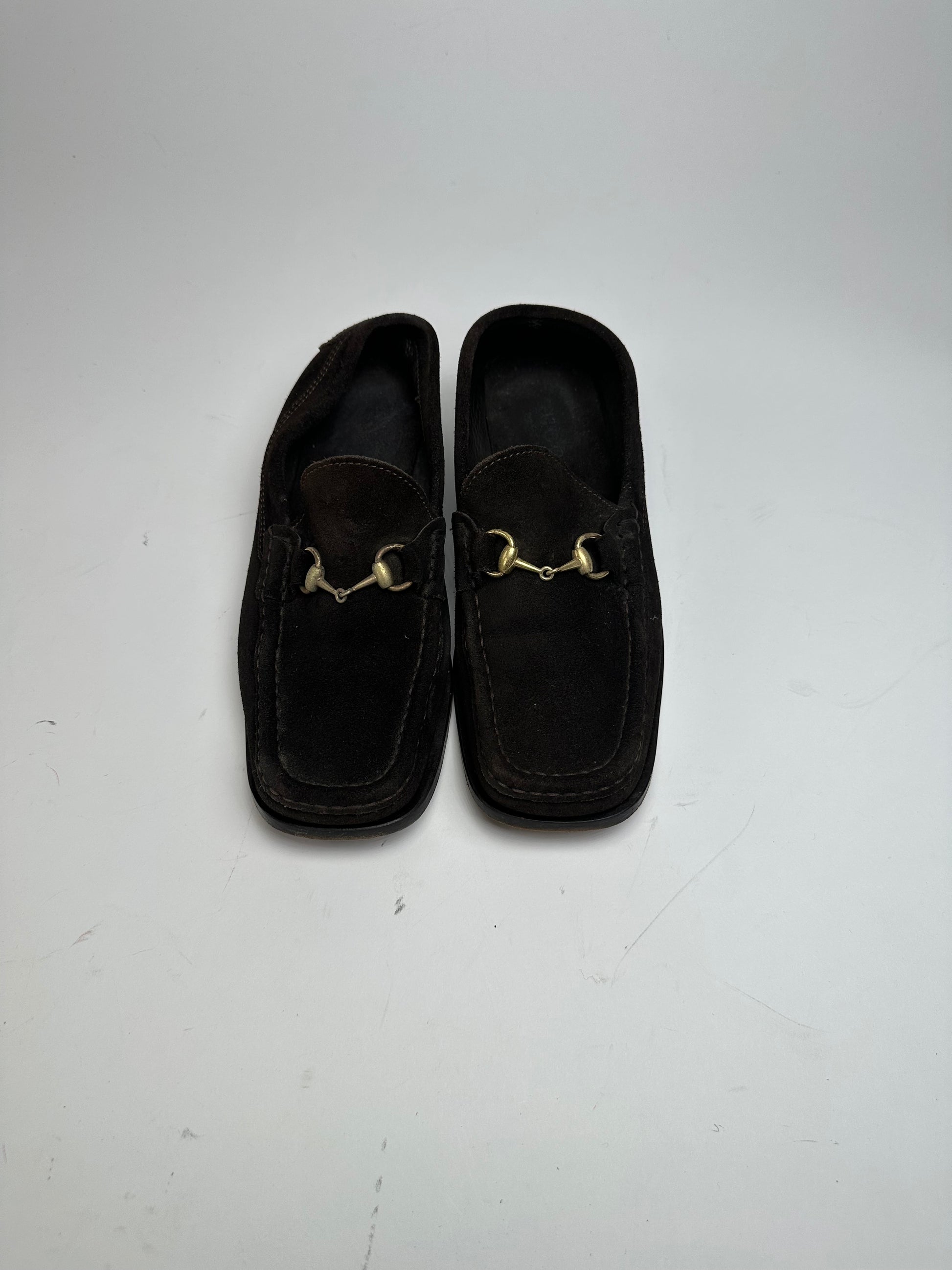 GUCCI Vintage Horsebit Loafers. The iconic Horsebit detail was introduced by Gucci in 1953, inspired by equestrian bridles, and has since become one of the house’s most recognizable and timeless design signatures. These elegant loafers are crafted of dark brown suede and feature the signature Horsebit application in gold-tone steel across the vamp. The interior is lined in dark brown suede. The sole is made of brown wood with black rubber studs. Made in Italy.