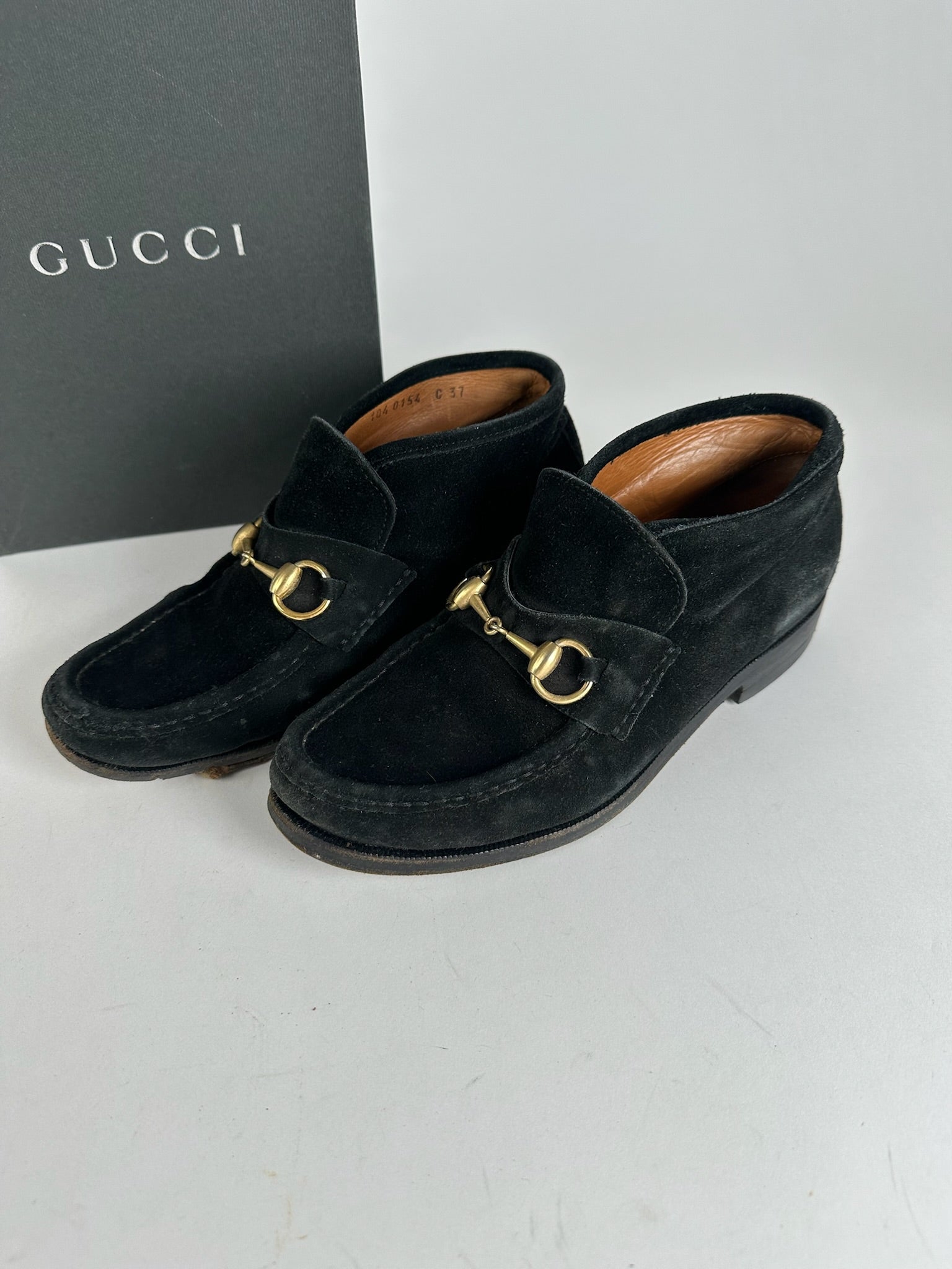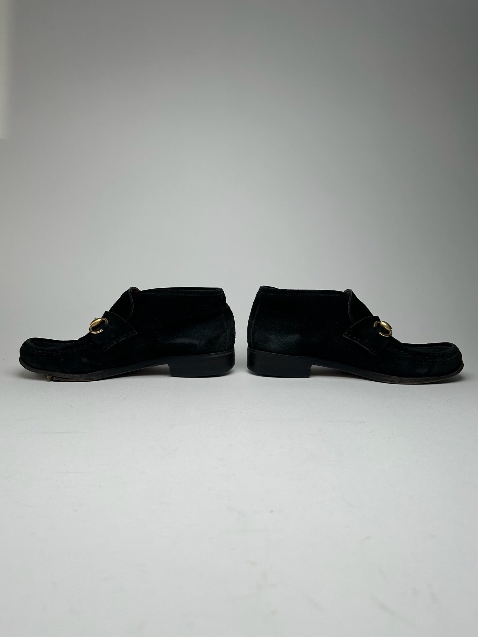 GUCCI Vintage Horsebit Loafers. These classic loafers are finely crafted of black suede with the signature horsebit detail on the front.