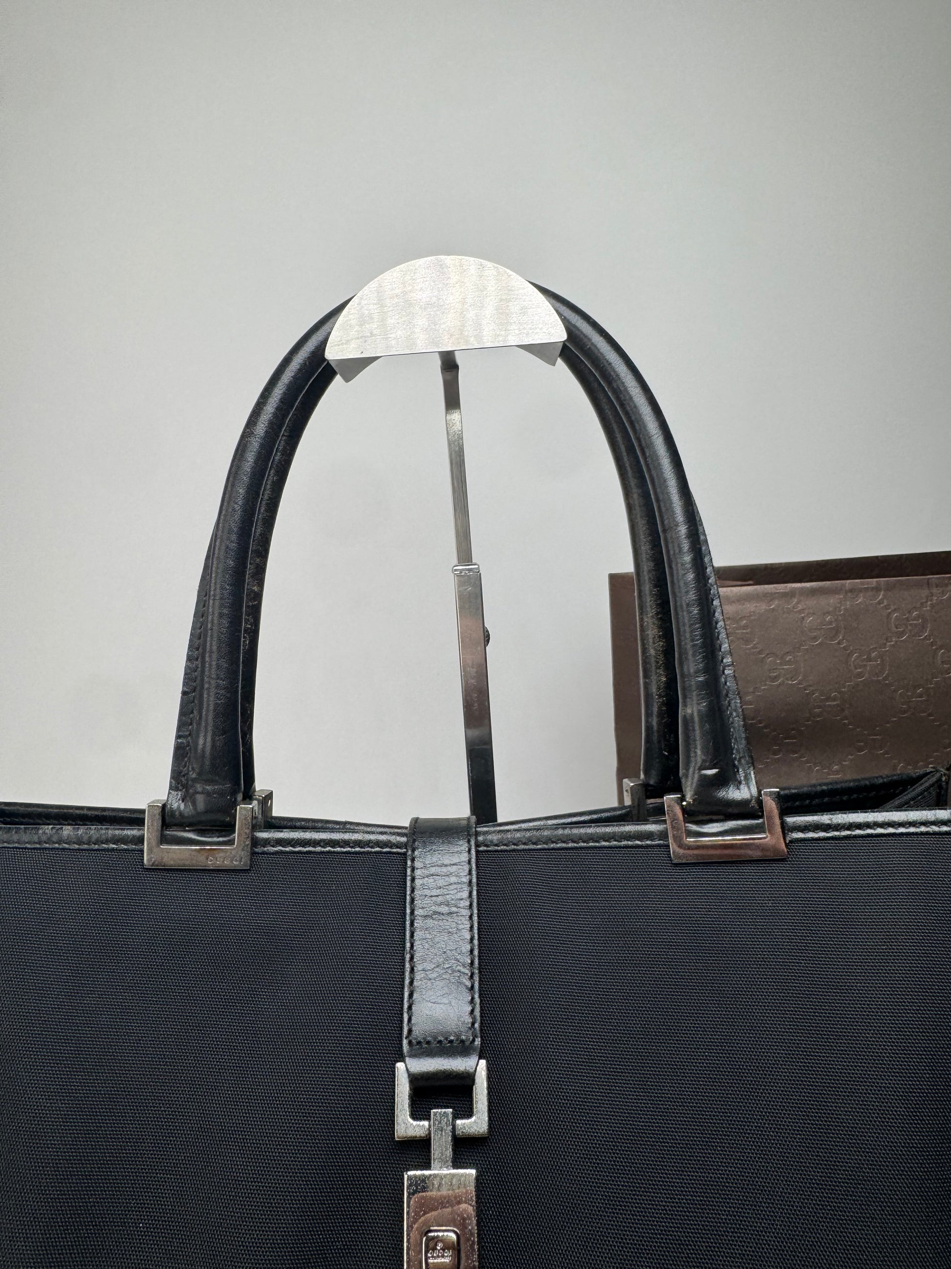 GUCCI Vintage Jackie Handbag. This chic handbag is finely crafted of black canvas and black leather. The Gucci Jackie model was named after Jacqueline Kennedy, who famously carried the silhouette in the 1960s, making it one of the house’s most iconic and enduring designs. The bag features two black leather handles and silver steel hardware. The interior is lined with black polyester featuring grey Gucci lettering.