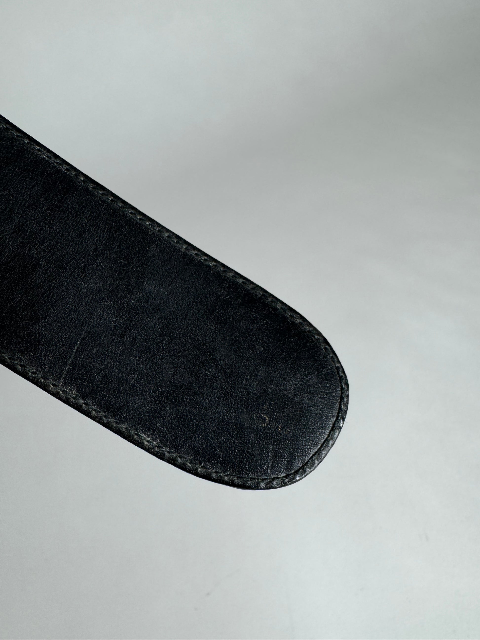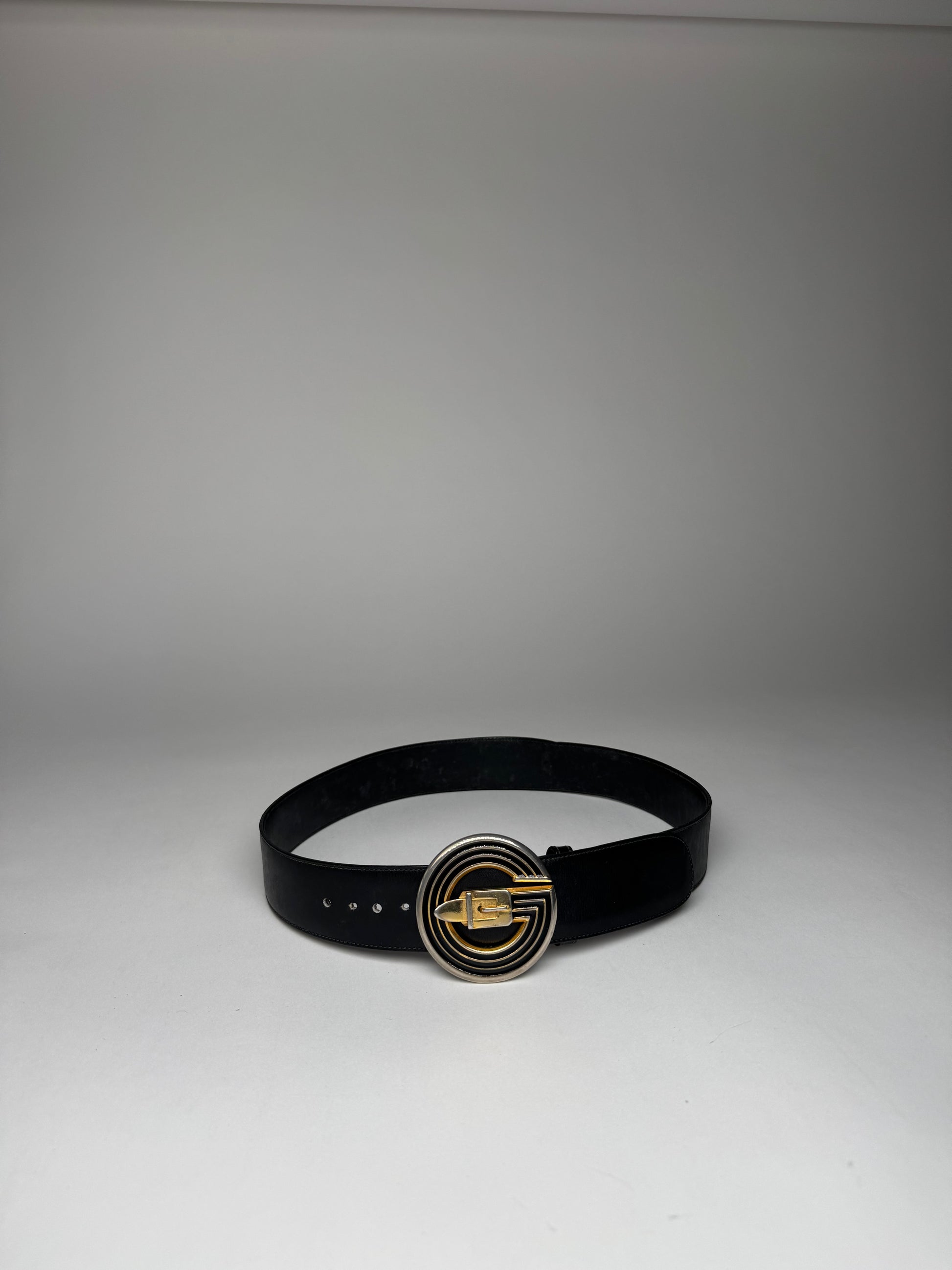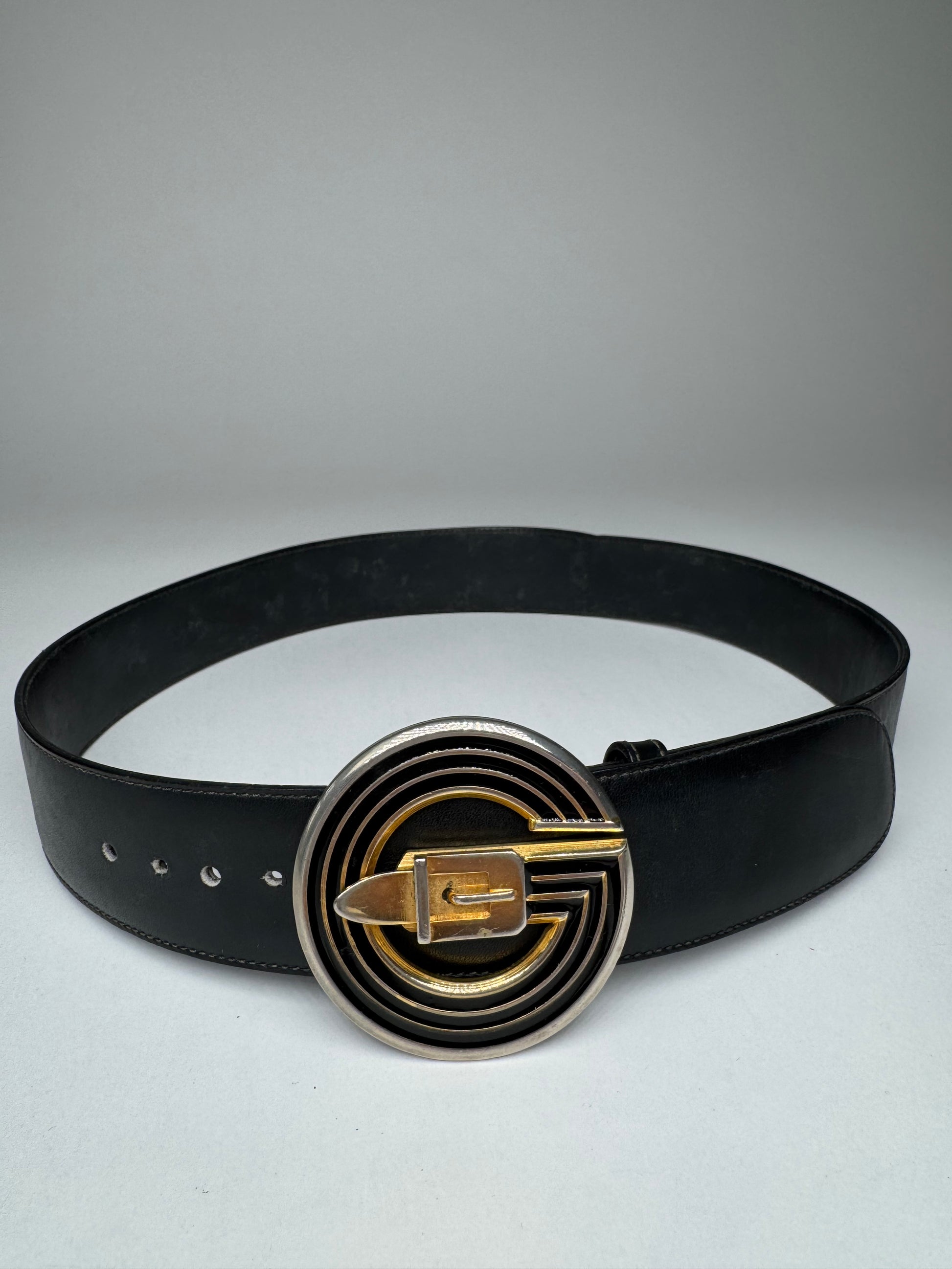GUCCI Vintage GG Buckle Belt. This sophisticated vintage GG Buckle belt from Gucci is crafted from black leather, offering a timeless and elegant design. The gold-toned steel buckle features an eye-catching and unique design, making it a standout piece.
