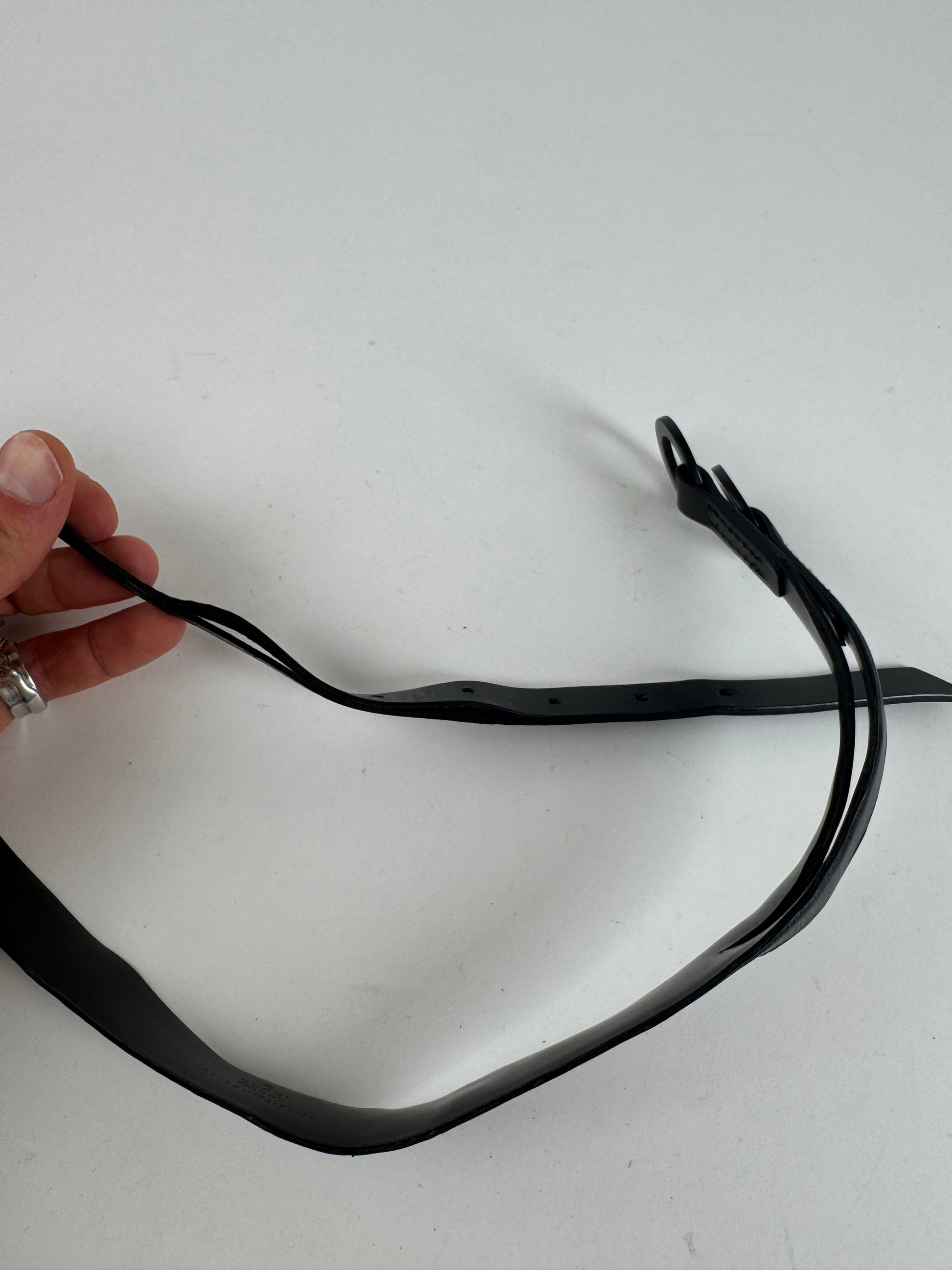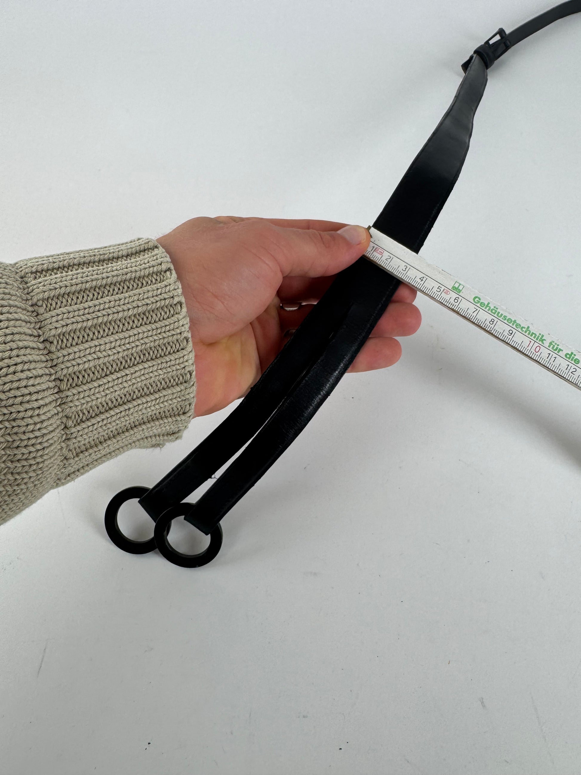 This stylish vintage belt is finely crafted from smooth black leather. It features a unique dual-ring closure, allowing for adjustable wear and a customizable fit. Its minimalist yet elegant design makes it a versatile unisex accessory. Proudly made in Italy, it showcases Gucci's signature craftsmanship and timeless appeal.