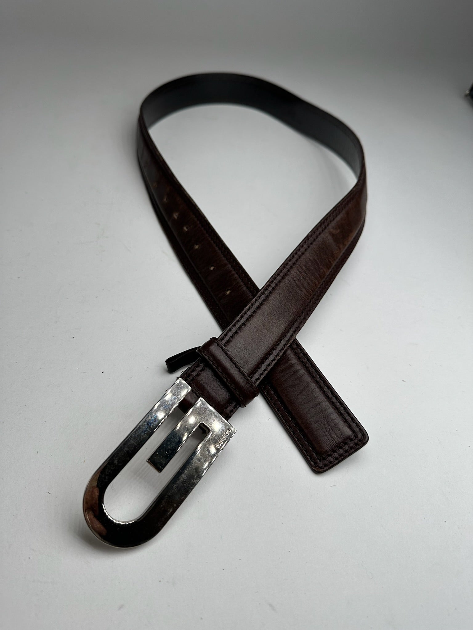 GUCCI Vintage GG Buckle Leather Belt. This chic belt is finely crafted of brown leather. It features a silver-tone steel GG buckle.