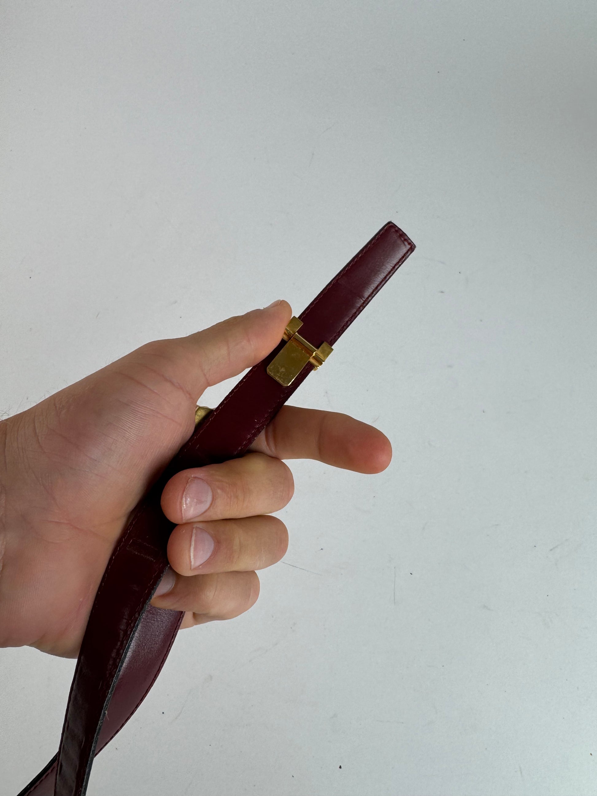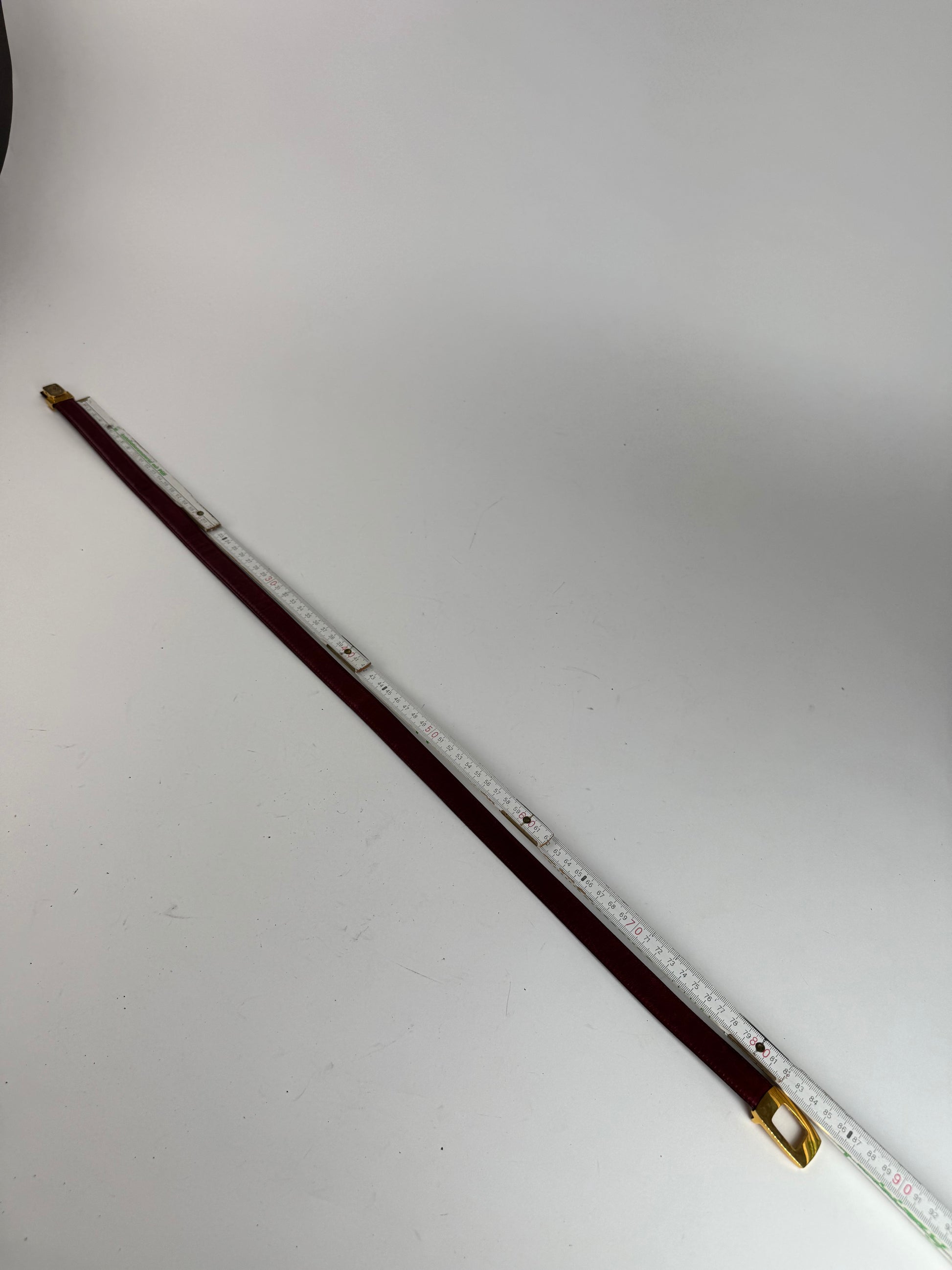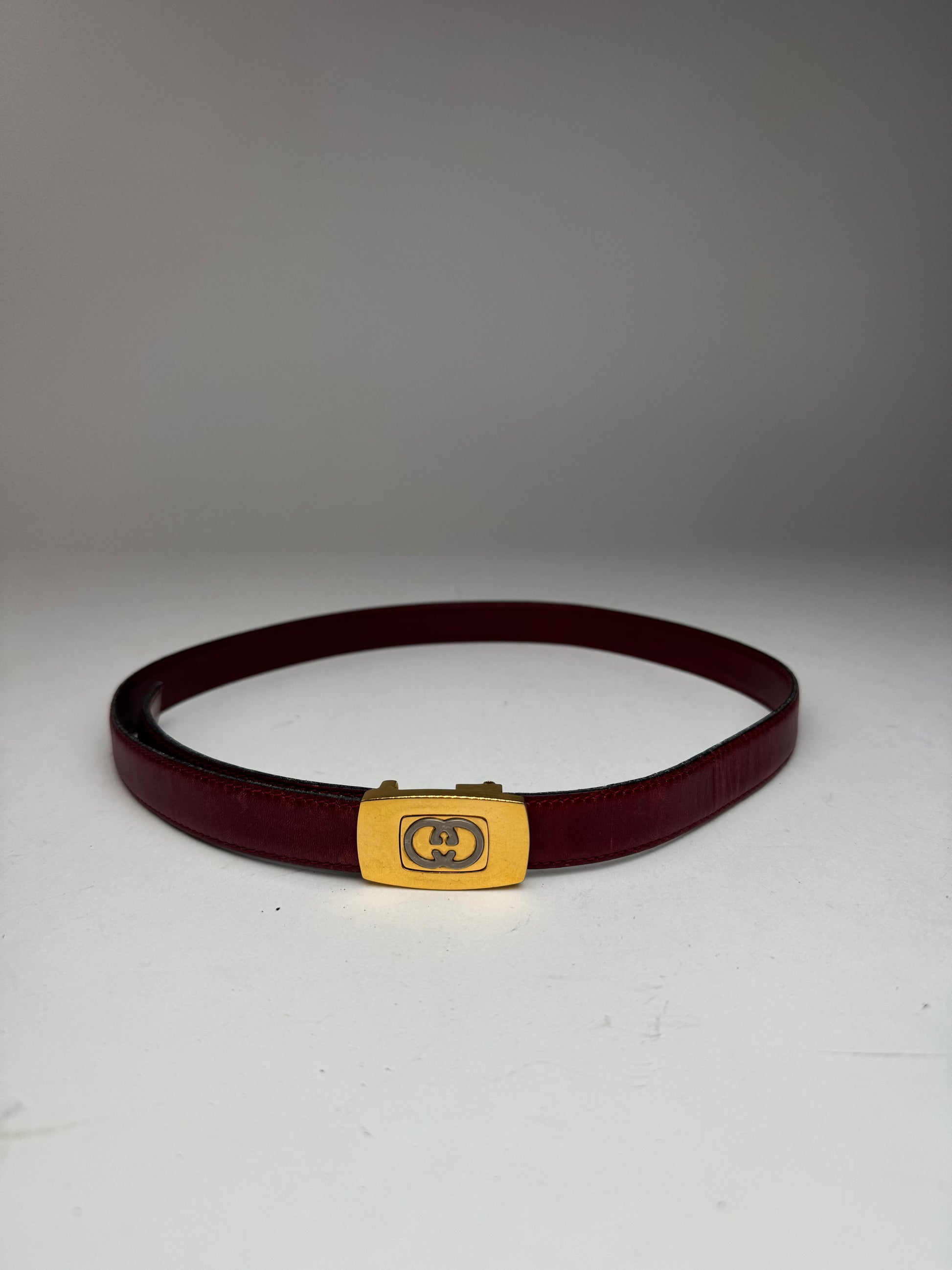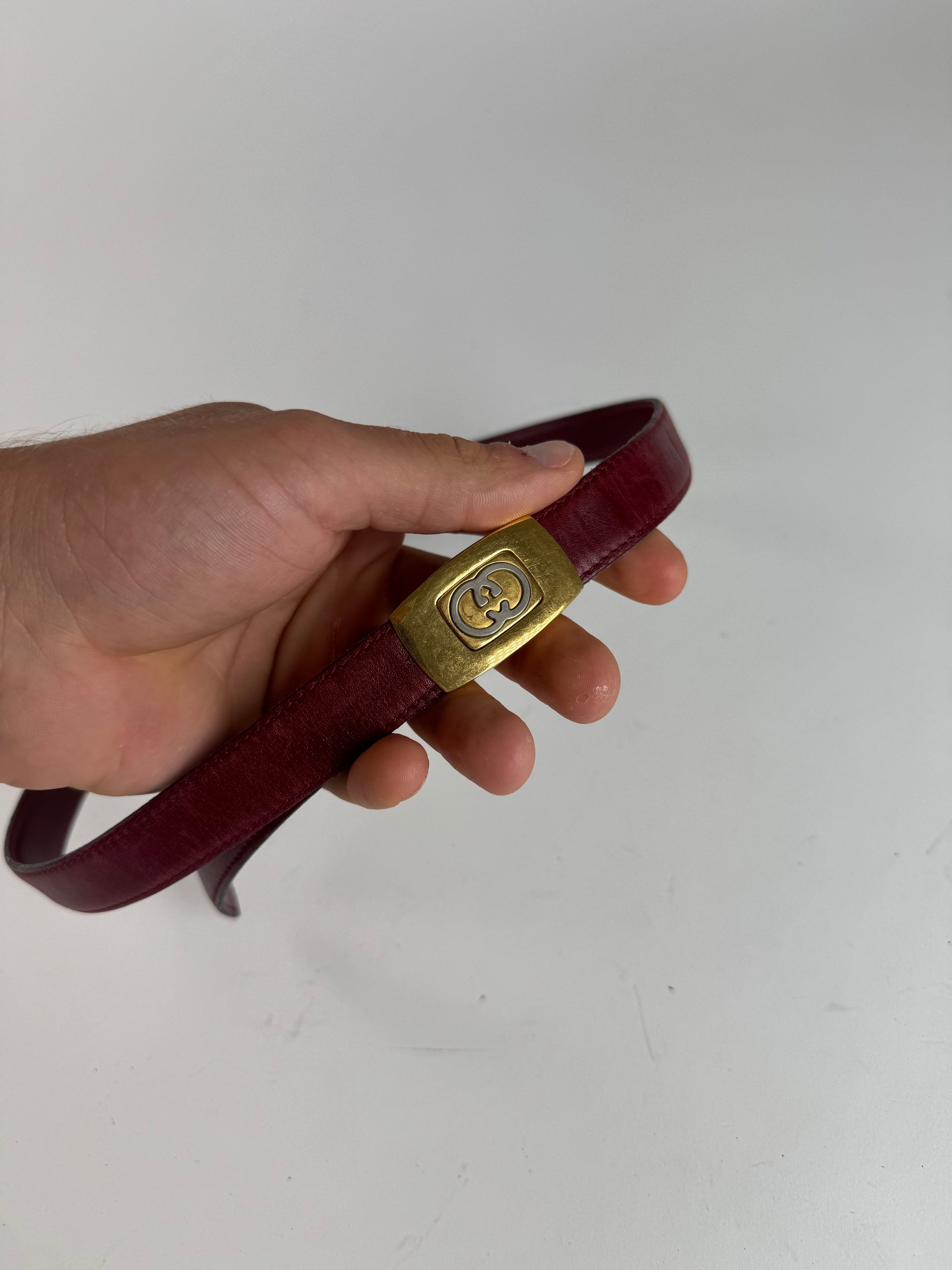 This rare vintage belt by Gucci is crafted from rich burgundy-toned leather and features a distinctive gold-tone steel clasp with a silver GG-logo—representing the initials of Guccio Gucci, the brand’s founder, and a symbol of the house’s legacy in luxury craftsmanship. The belt includes an uncommon sliding clasp mechanism that allows full length adjustment via a fold-over and snap system.