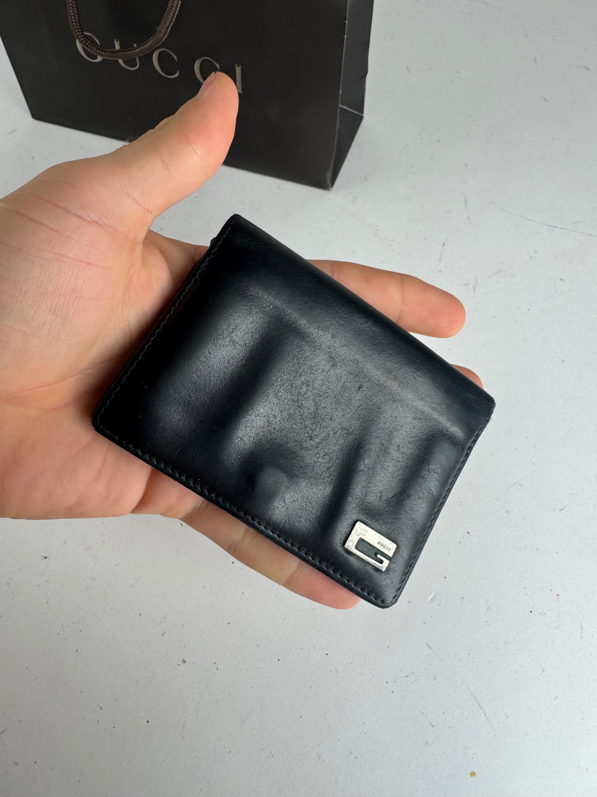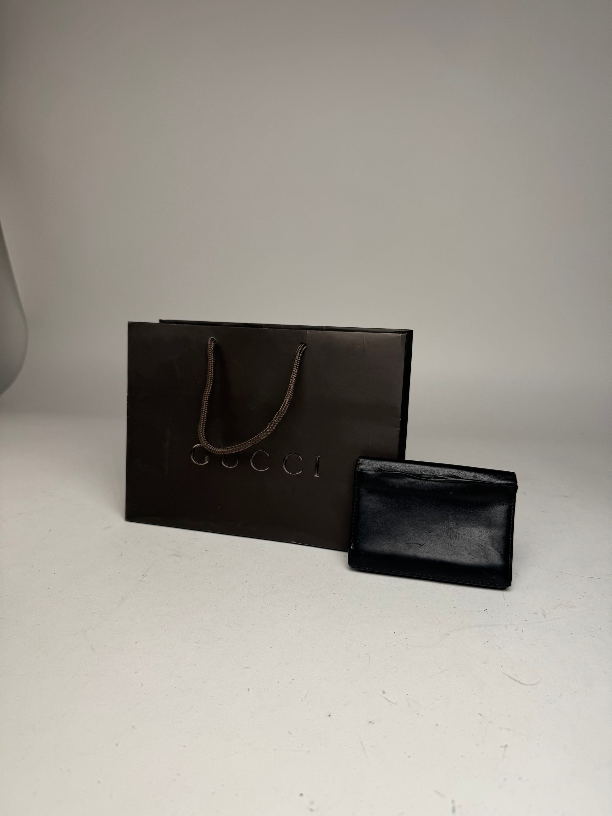 This elegant vintage card holder is finely crafted of smooth black leather. Gucci, founded in Florence in 1921, is renowned for its refined Italian craftsmanship and timeless luxury accessories. The front features a silver-tone steel Gucci “G” logo and a snap button closure.