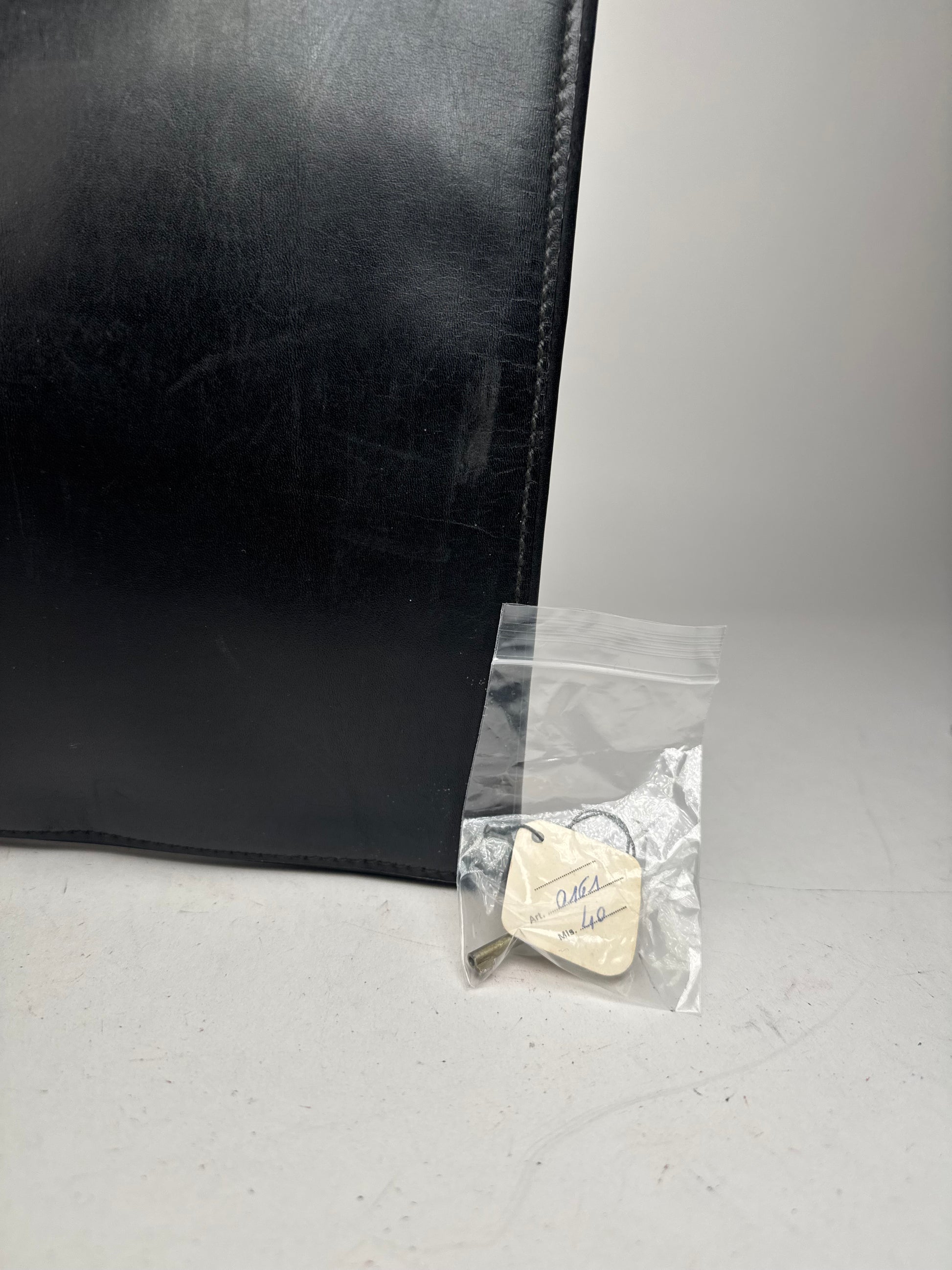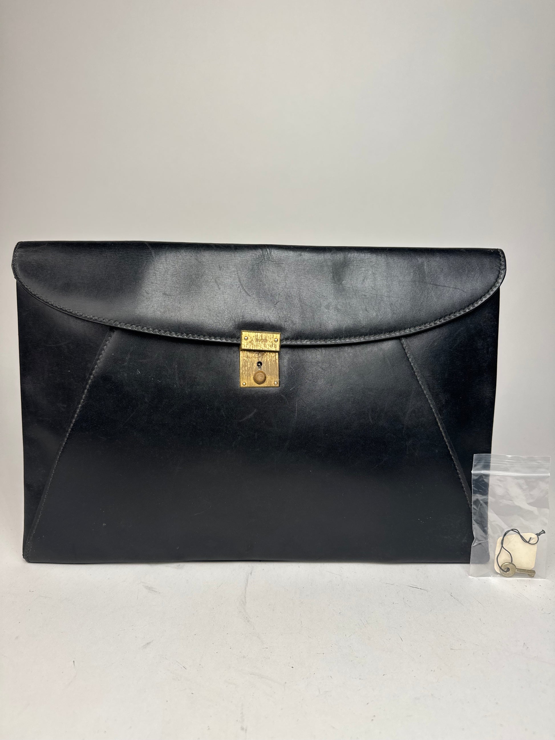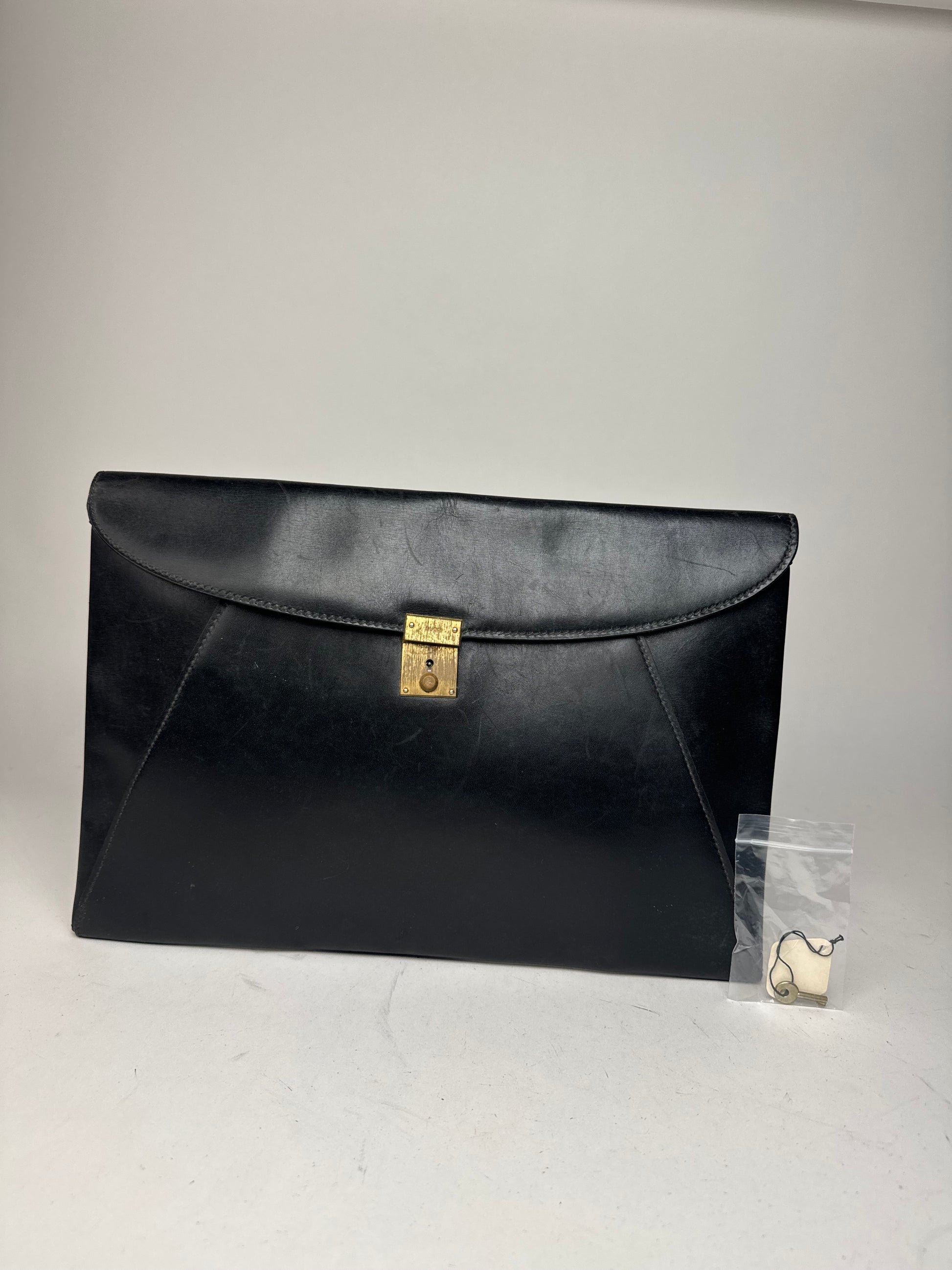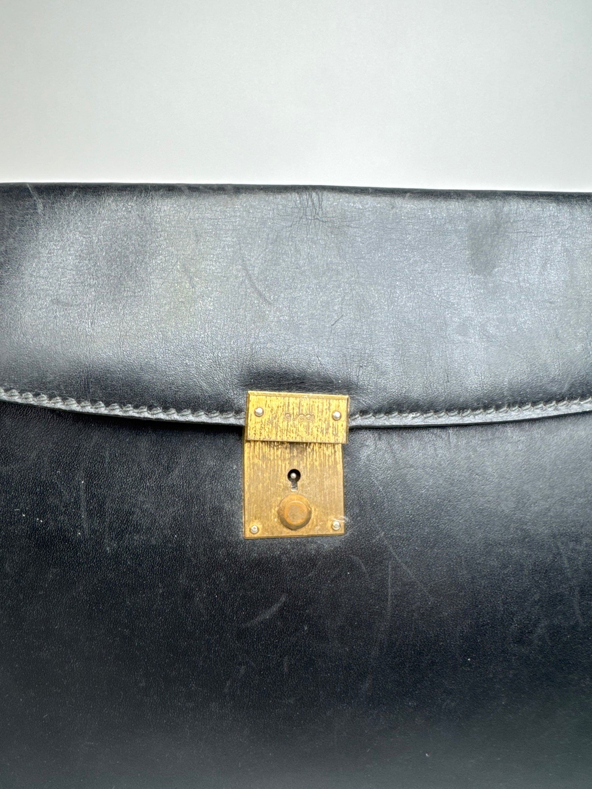This sophisticated vintage clutch is crafted from smooth black leather and features a sliding lock closure with an accompanying key — a hallmark of Gucci’s elegant craftsmanship. The interior is lined in beige leather and offers ample space, allowing the piece to be worn as both a clutch and a slim briefcase. Made in Italy and likely dating back to the 1980s, it represents the brand’s timeless blend of luxury and functionality. Authenticity code reads: 0150960161.