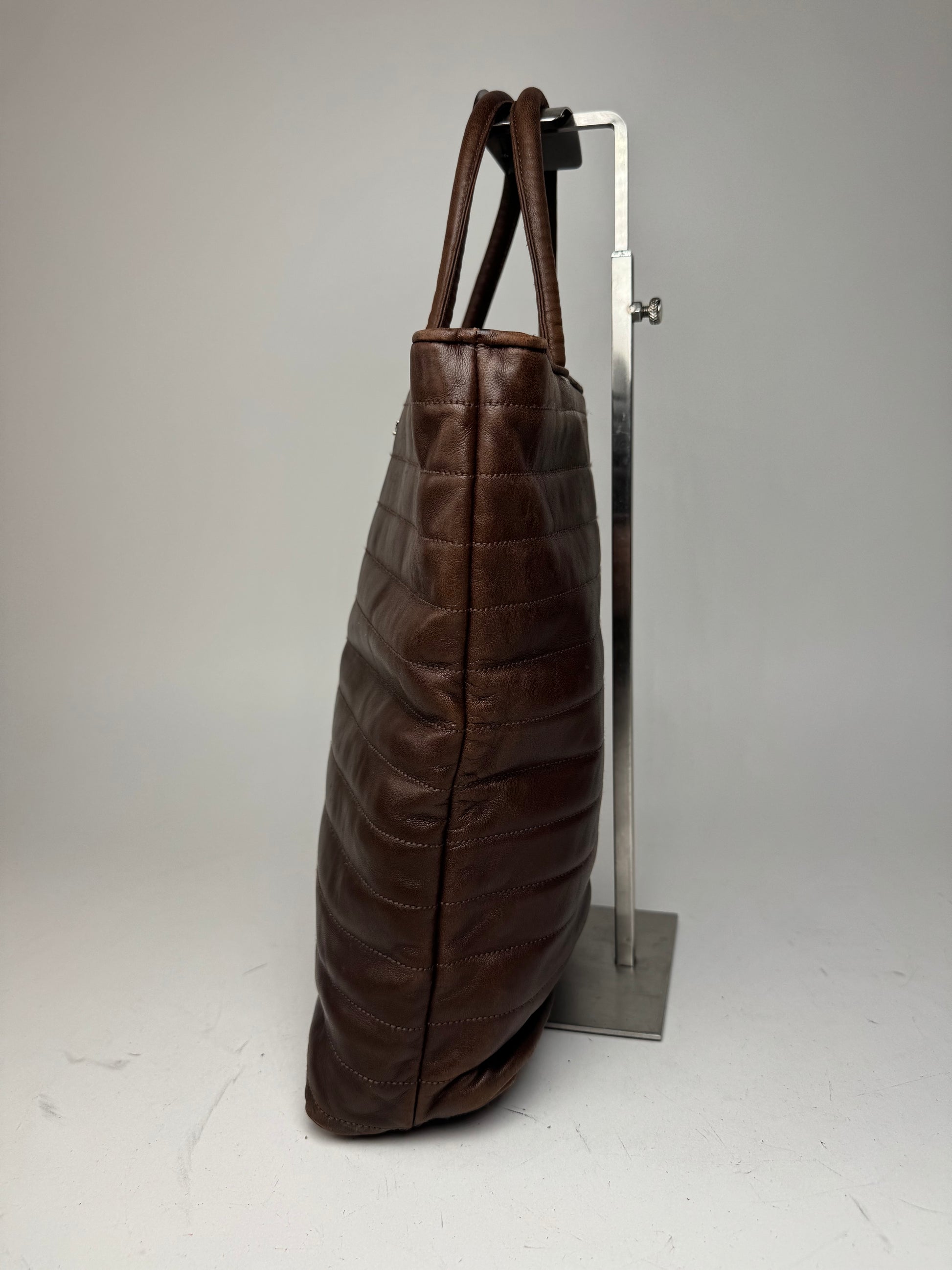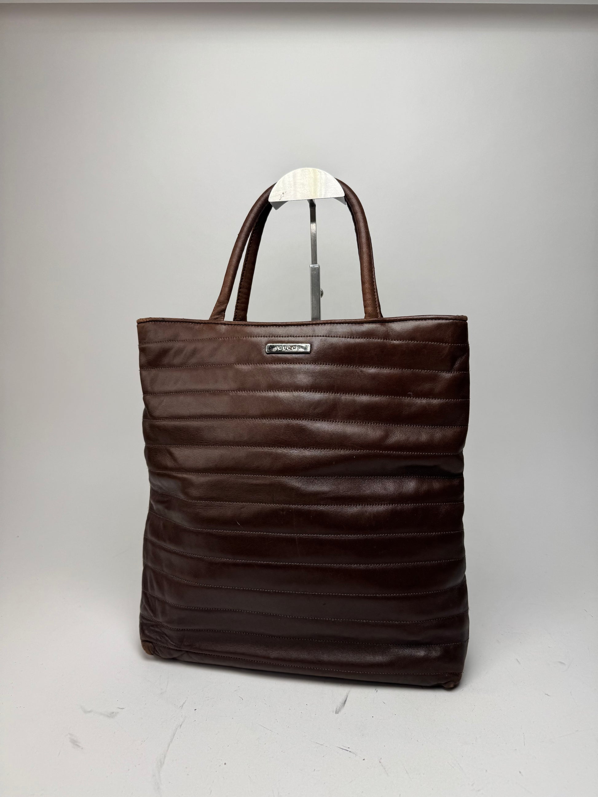 This classic vintage handbag is finely crafted of ribbed brown leather and features silver-tone steel hardware. The design includes three spacious compartments, two of which close with zippers, offering both elegance and functionality. Made in Italy.