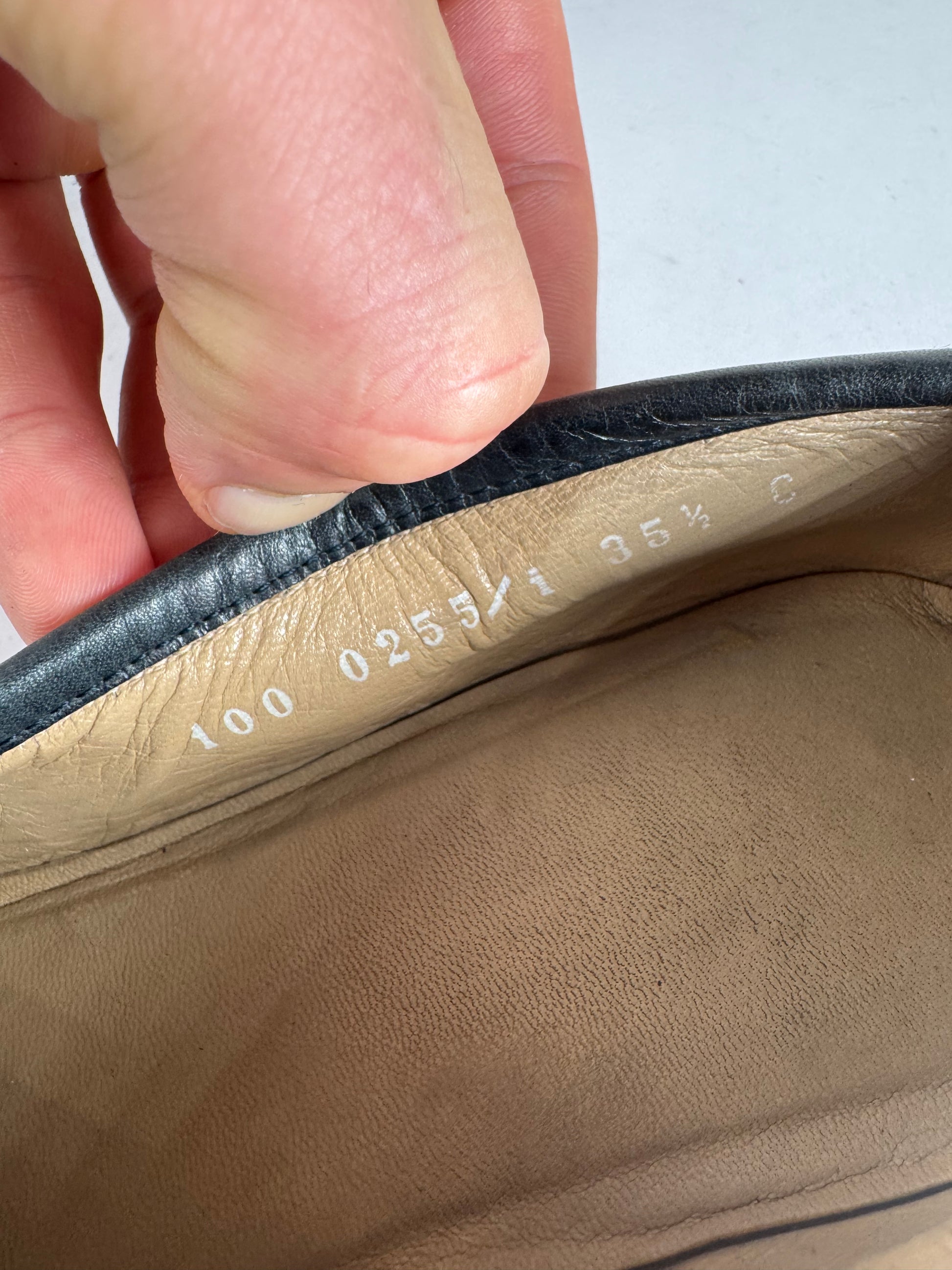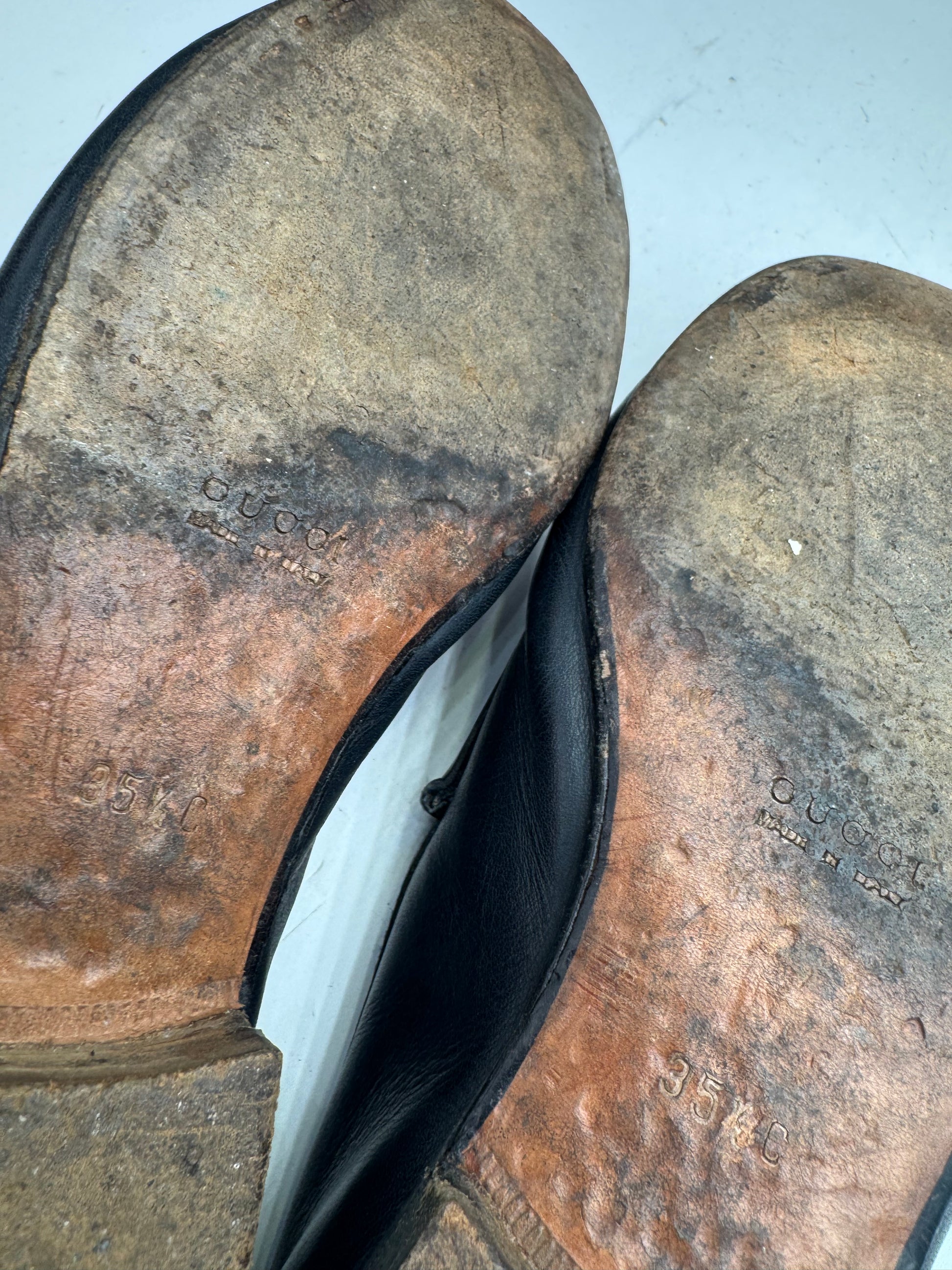 These classic vintage loafers from Gucci are crafted in black leather and feature the iconic gold-tone Horsebit detail across the instep — a house signature introduced in the 1950s, inspired by equestrian heritage and cemented as a timeless symbol of Gucci sophistication. The shoes are lined in soft beige leather and finished with a brown wooden-and-rubber sole. Made in Italy.