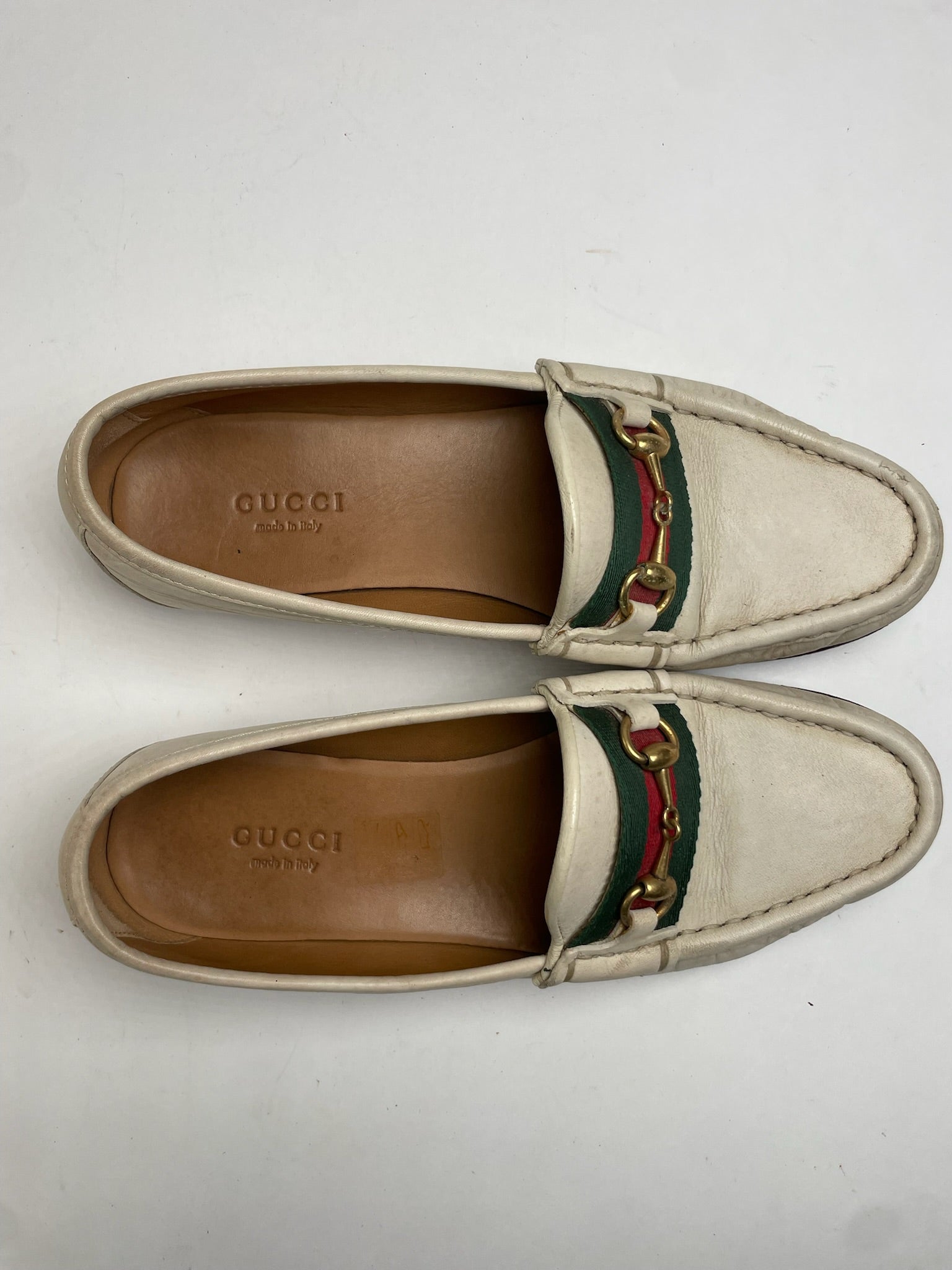 GUCCI Vintage Horsebit Loafers. Gucci’s iconic Horsebit detail was introduced in 1953 and remains one of the House’s most recognizable heritage symbols, while the signature red-green web stripe is a timeless nod to Gucci’s equestrian-inspired roots. These chic loafers are crafted of white leather and feature a horizontal red-green canvas band across the vamp, finished with a gold-tone steel Horsebit application. They have a caramel brown leather interior and are made in Italy.