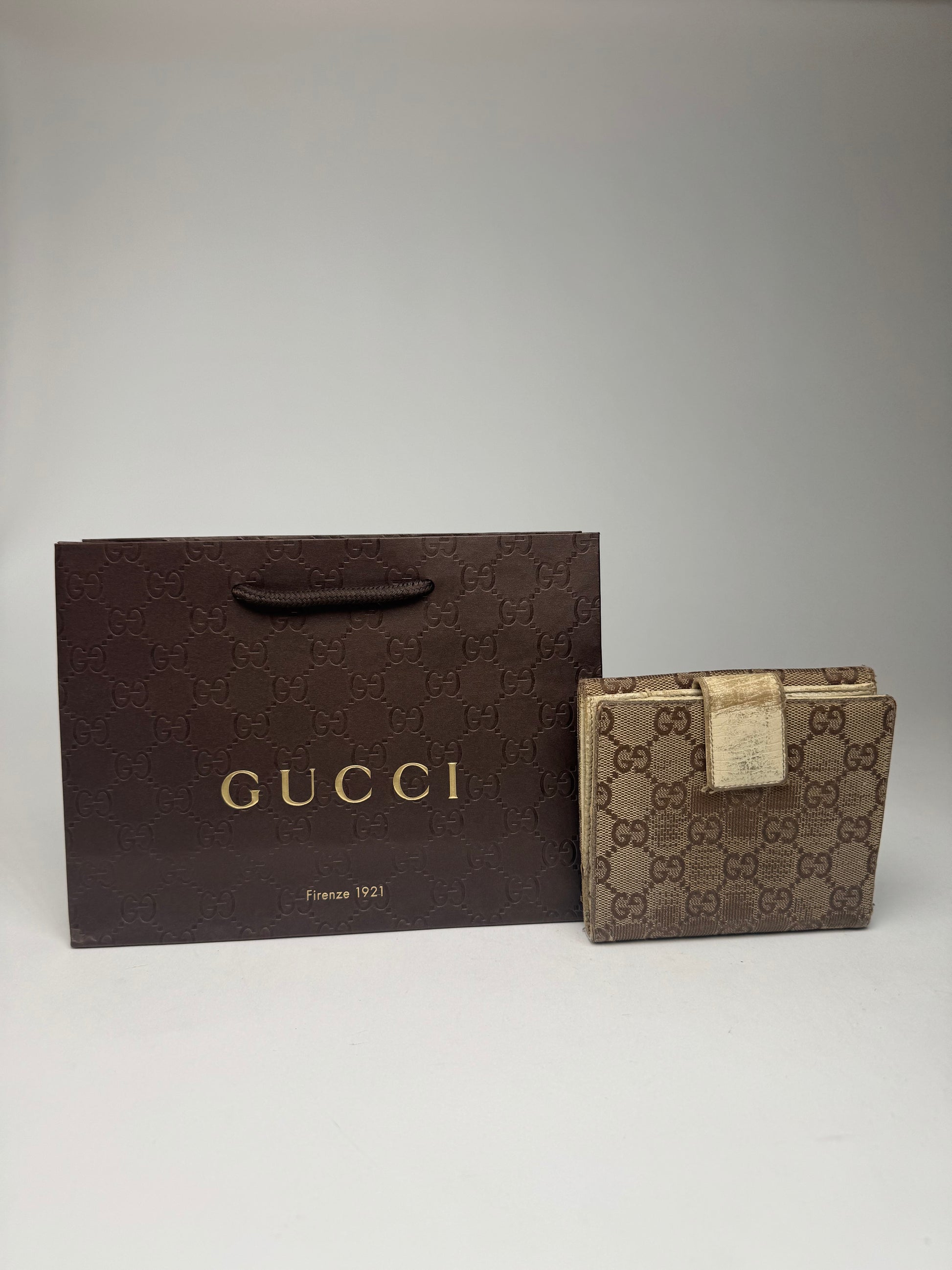 This stylish vintage wallet is finely crafted from beige-brown Gucci Monogram canvas, complemented by white leather accents. It features a signature gold-toned Horsebit appliqué on the front, along with an eye-catching orange stripe. The wallet opens to a white leather-lined interior, offering a sleek and refined look. Proudly made in Italy, this unisex accessory comes with an original Gucci shopping bag.