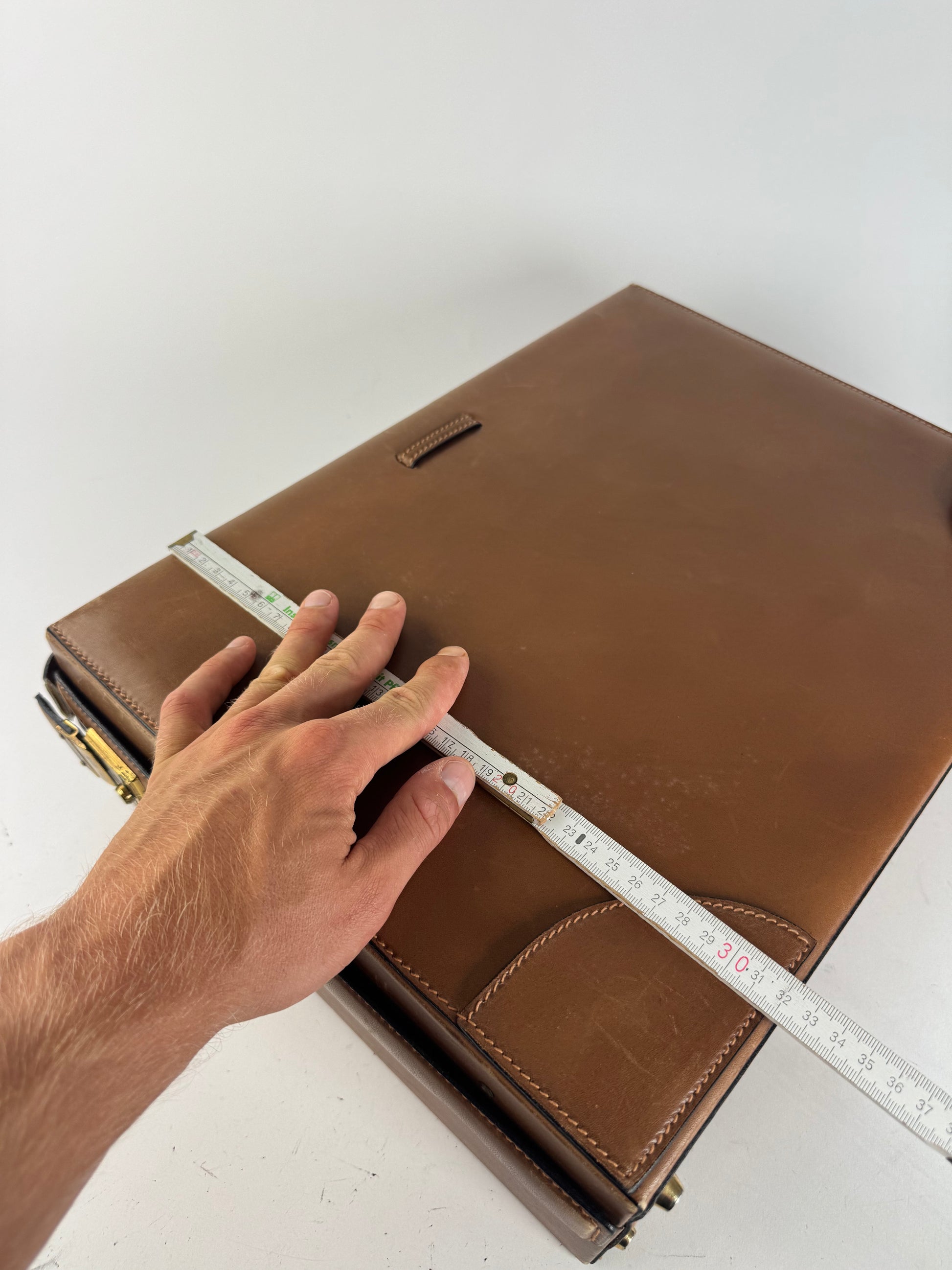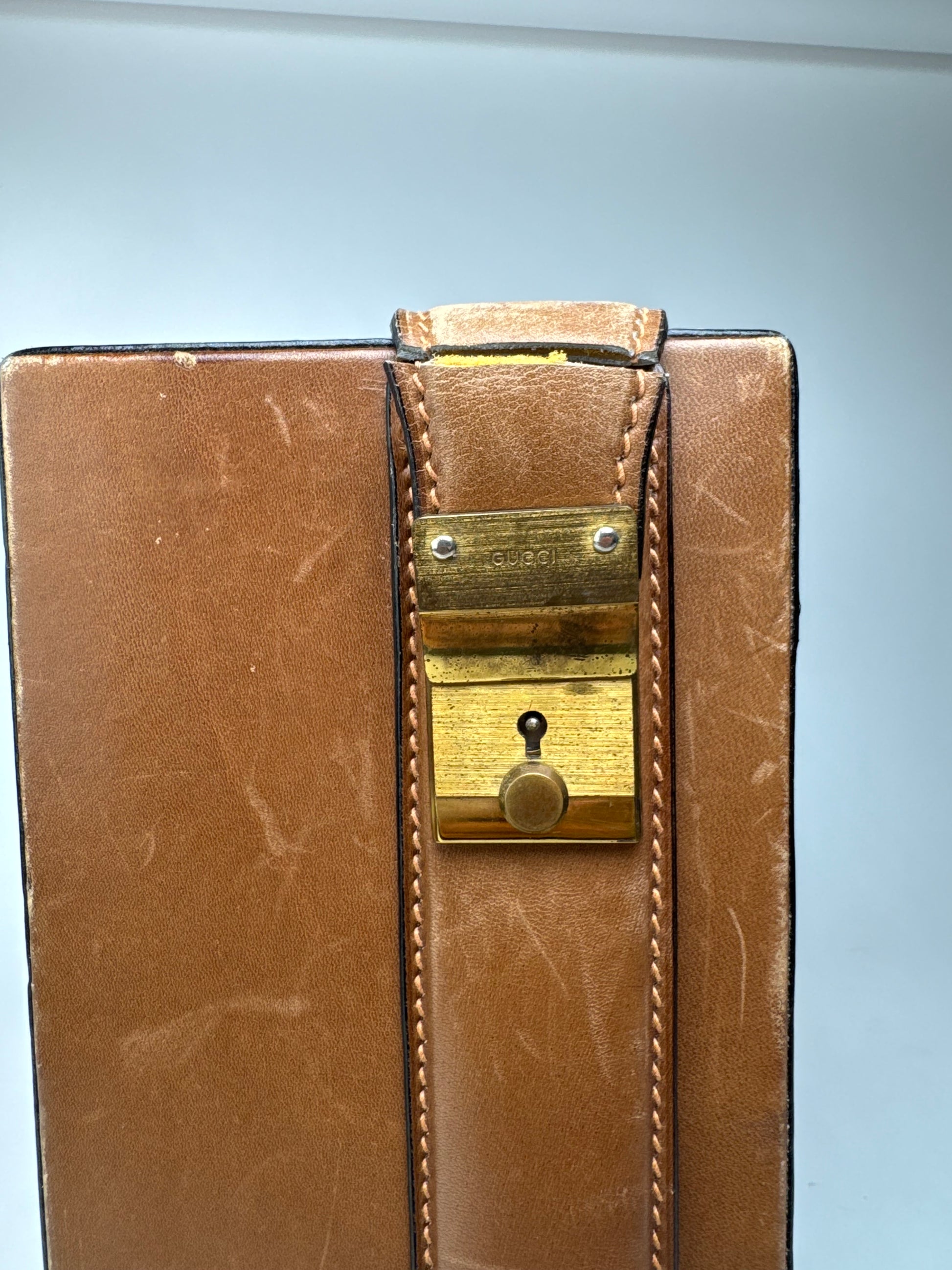 GUCCI Vintage Leather Suitcase. This classic suitcase is crafted from brown leather and features a matching brown leather handle. The case showcases vintage styling with gold-tone steel hardware and a beige interior lining.