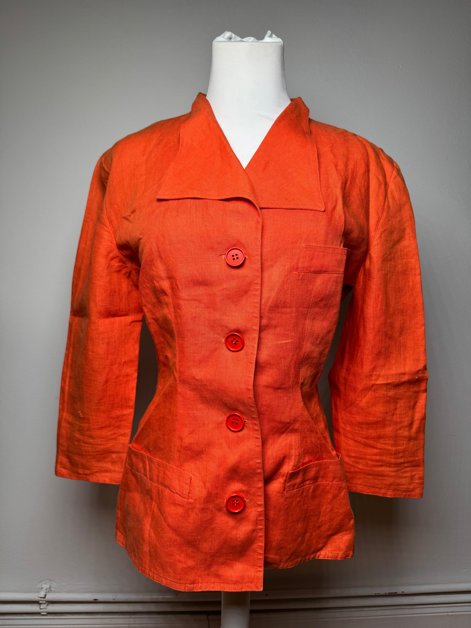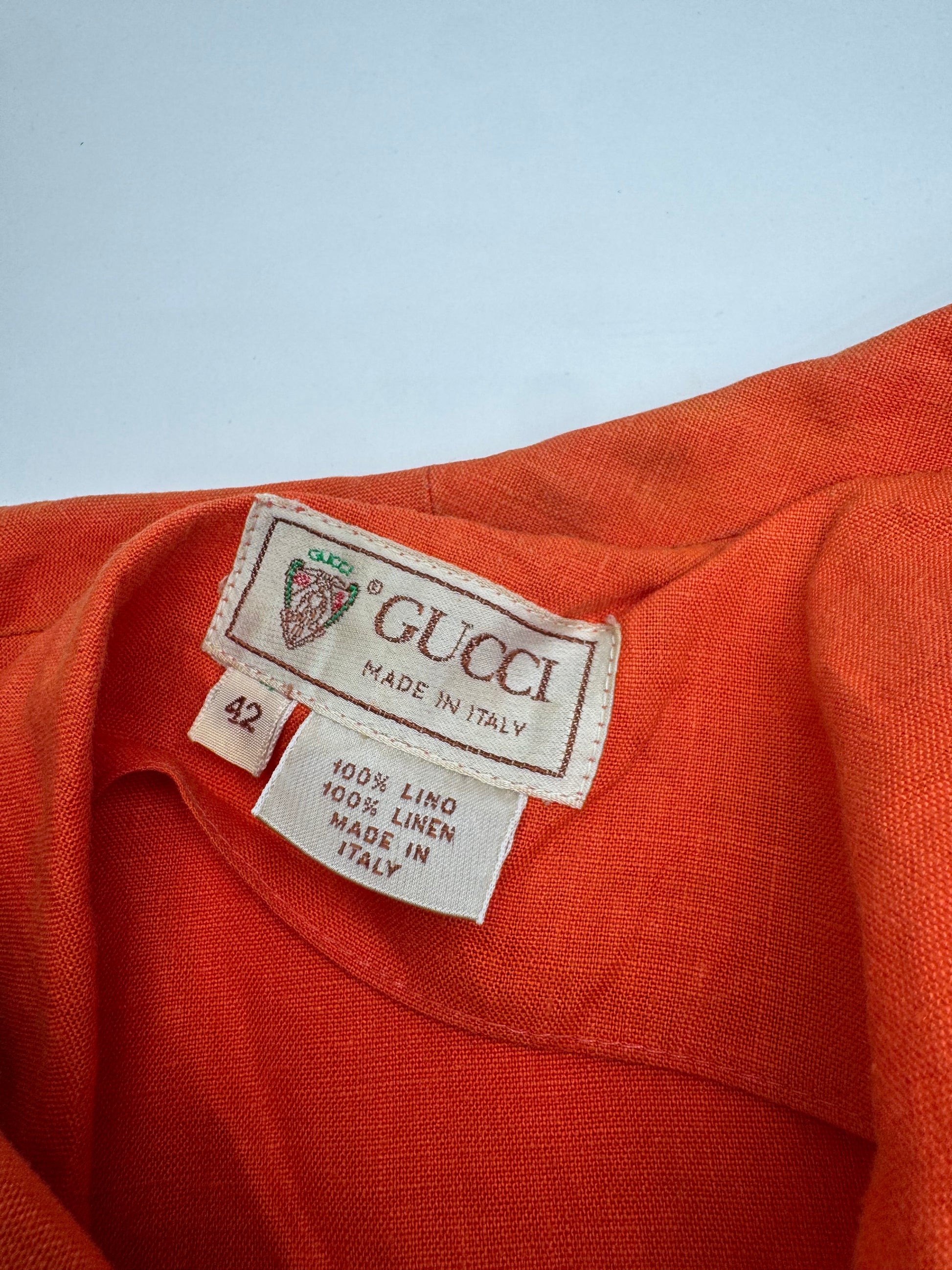 GUCCI Vintage Linen Short Coat. This rare vintage short coat dates back to the 1970s and is crafted from 100% linen in a vibrant orange hue, capturing the bold spirit of the era. Finished with matching orange plastic buttons, the design reflects Gucci’s expressive approach to color and effortless Italian tailoring during this period.