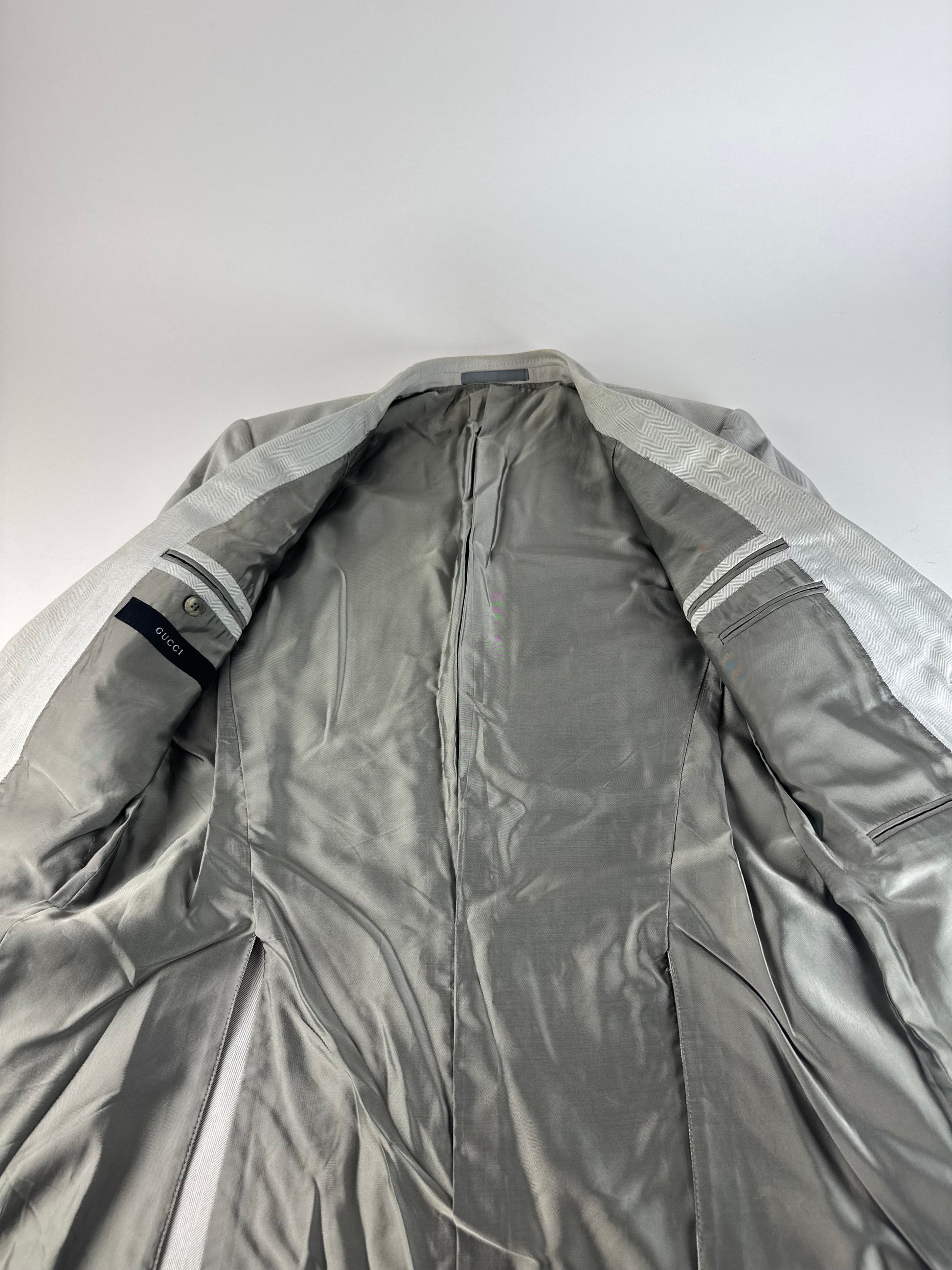 GUCCI Vintage Suit. This elegant vintage suit is crafted in a light grey fabric, offering a timeless and refined silhouette typical of classic Gucci tailoring. A versatile two-piece set suitable for both formal and elevated everyday wear.
