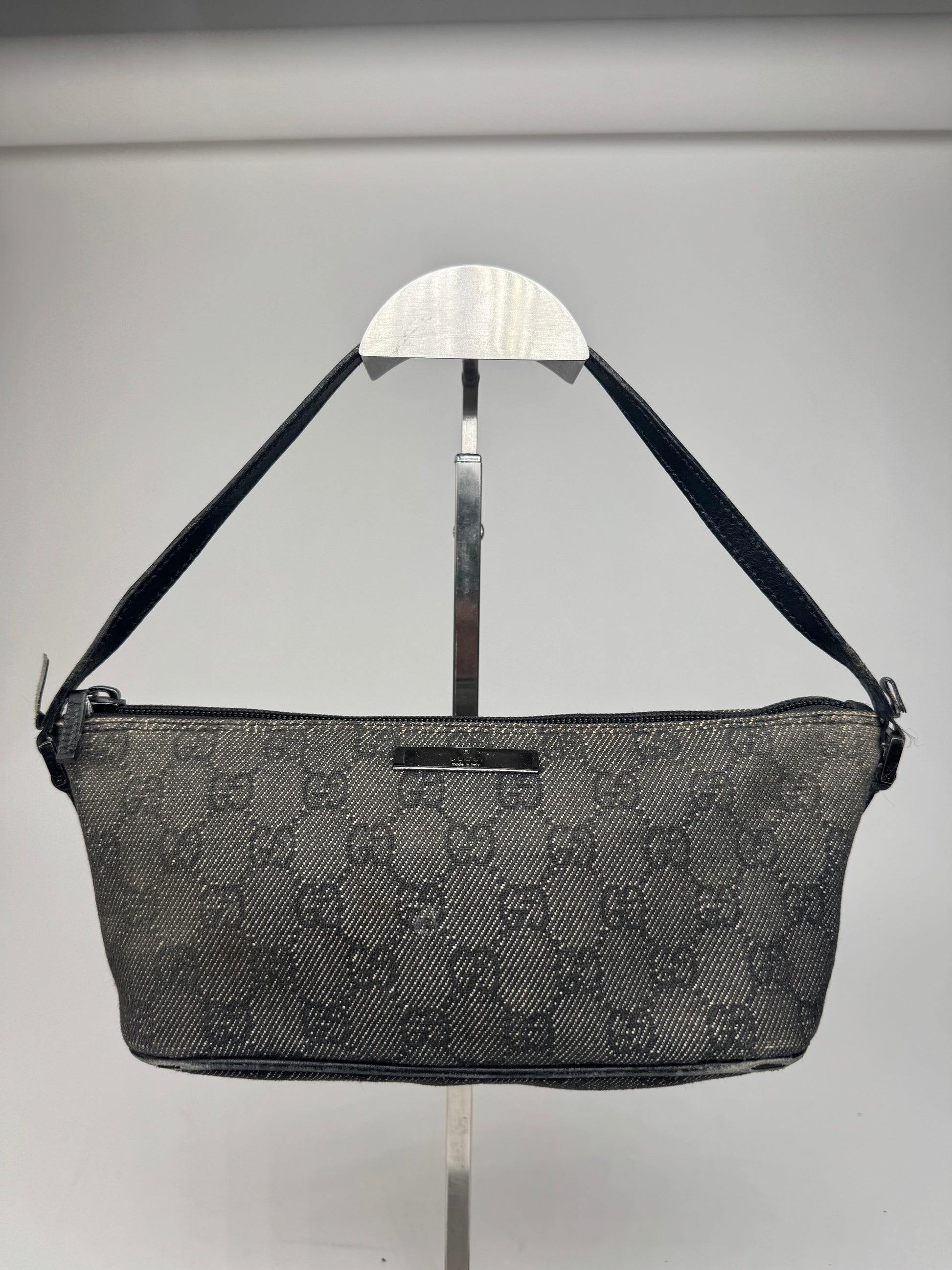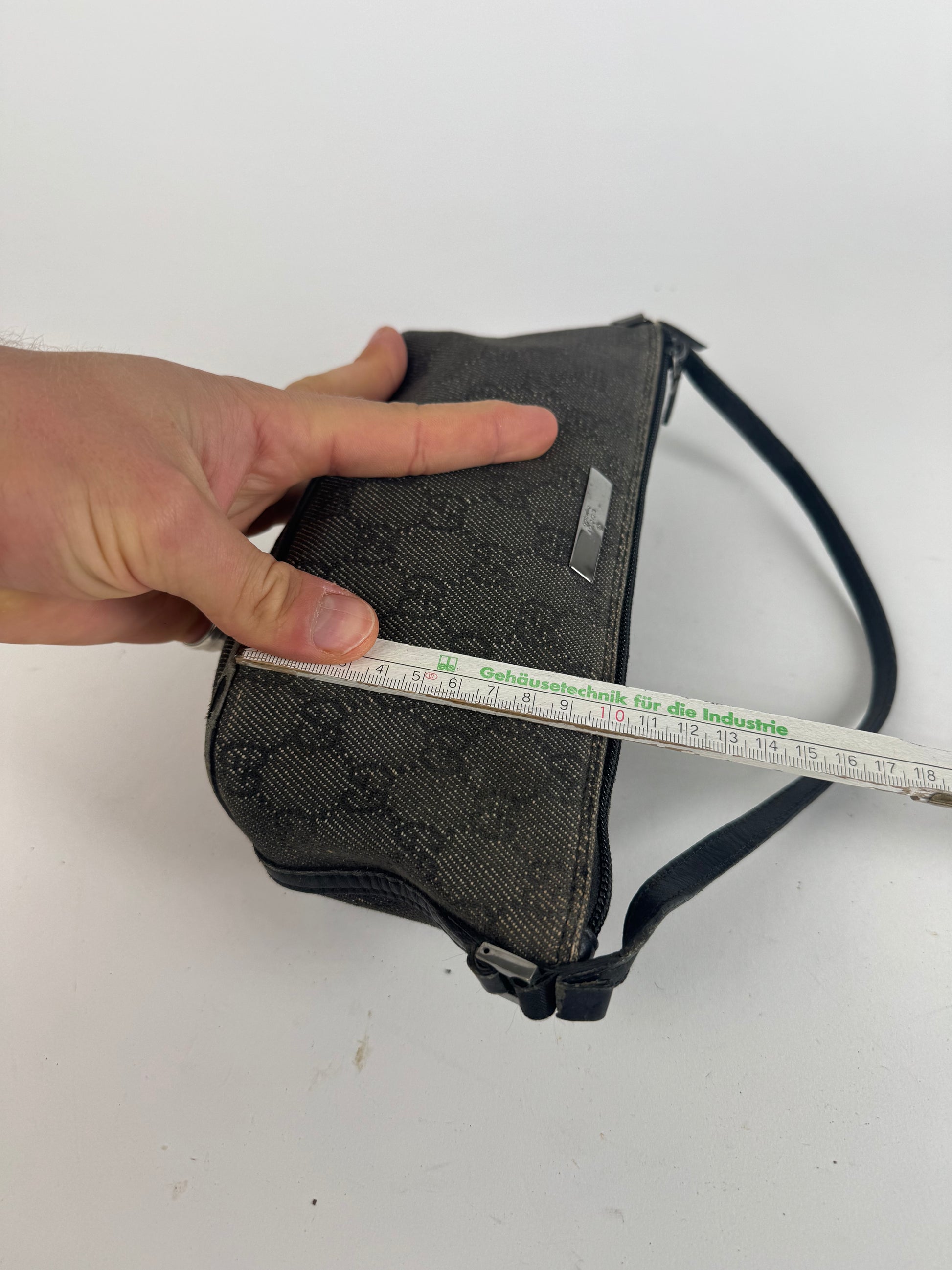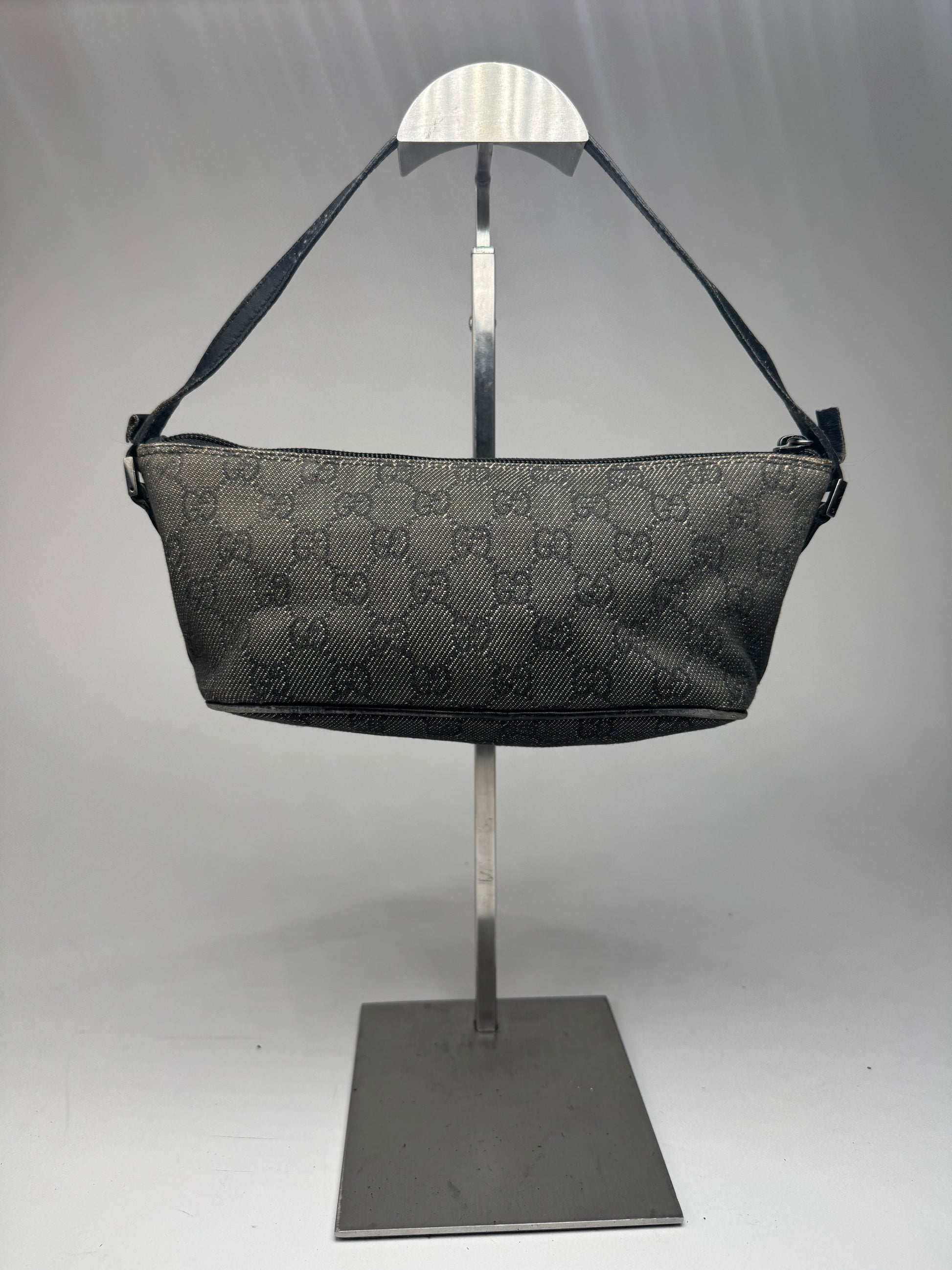 This elegant vintage baguette handbag is finely crafted from black Gucci Monogram canvas. It features a black leather handle and a matching leather base, adding a touch of sophistication to its design. The hardware is silver-toned steel, perfectly complementing the dark tones. The interior is lined with black canvas and offers a compact yet practical space. Proudly made in Italy.