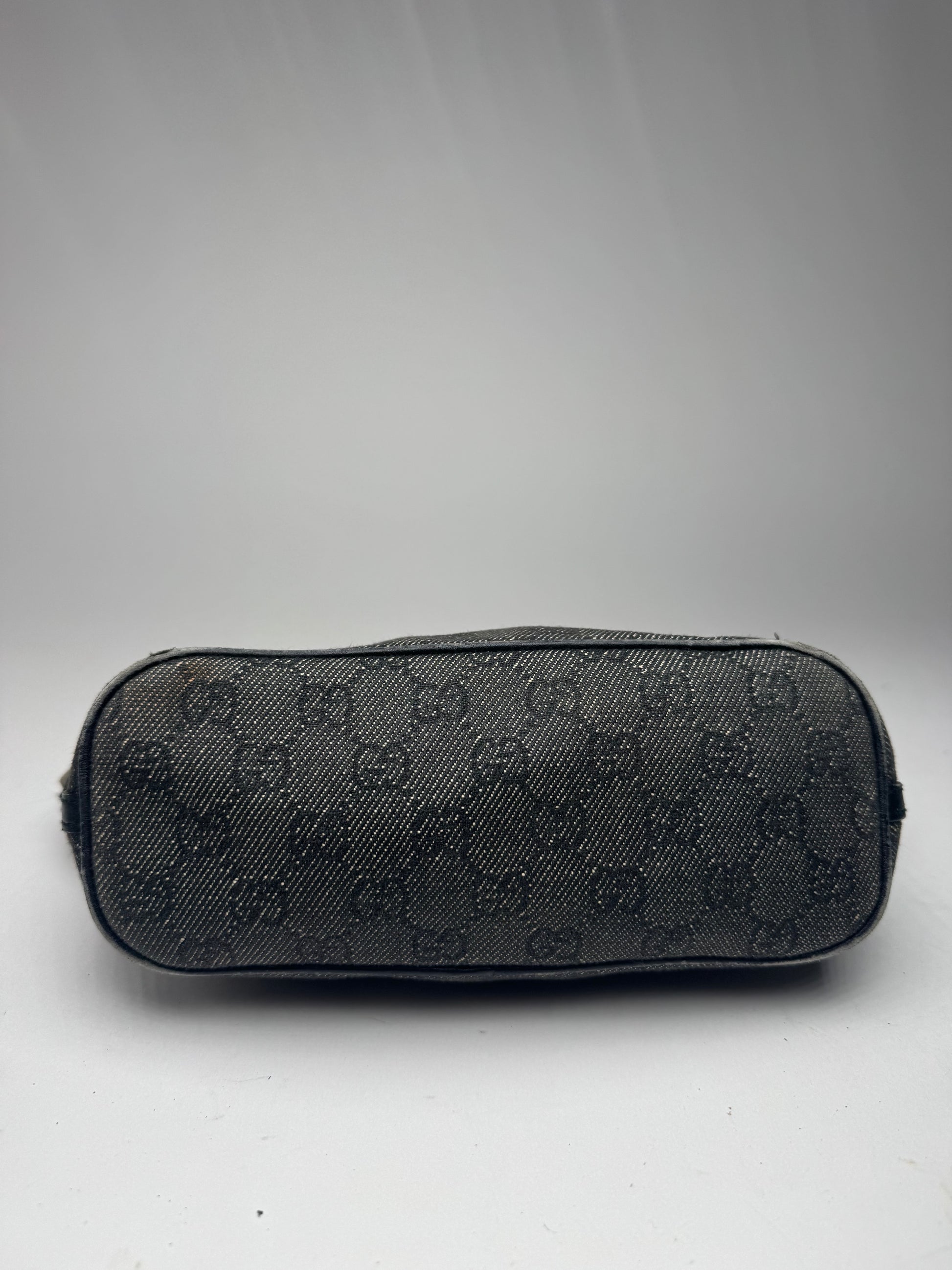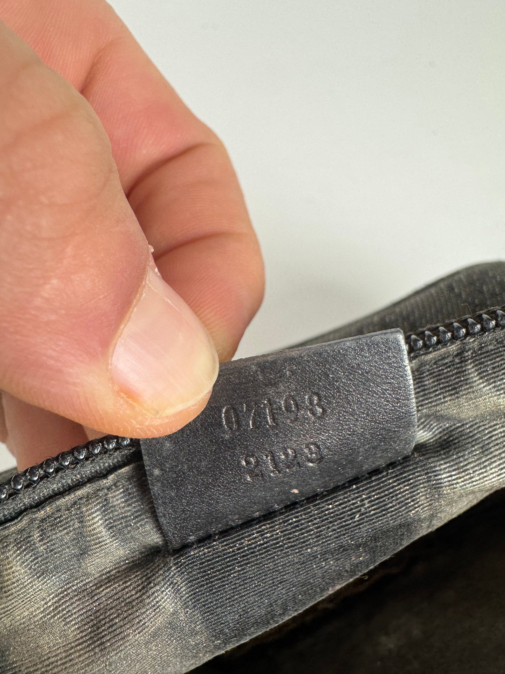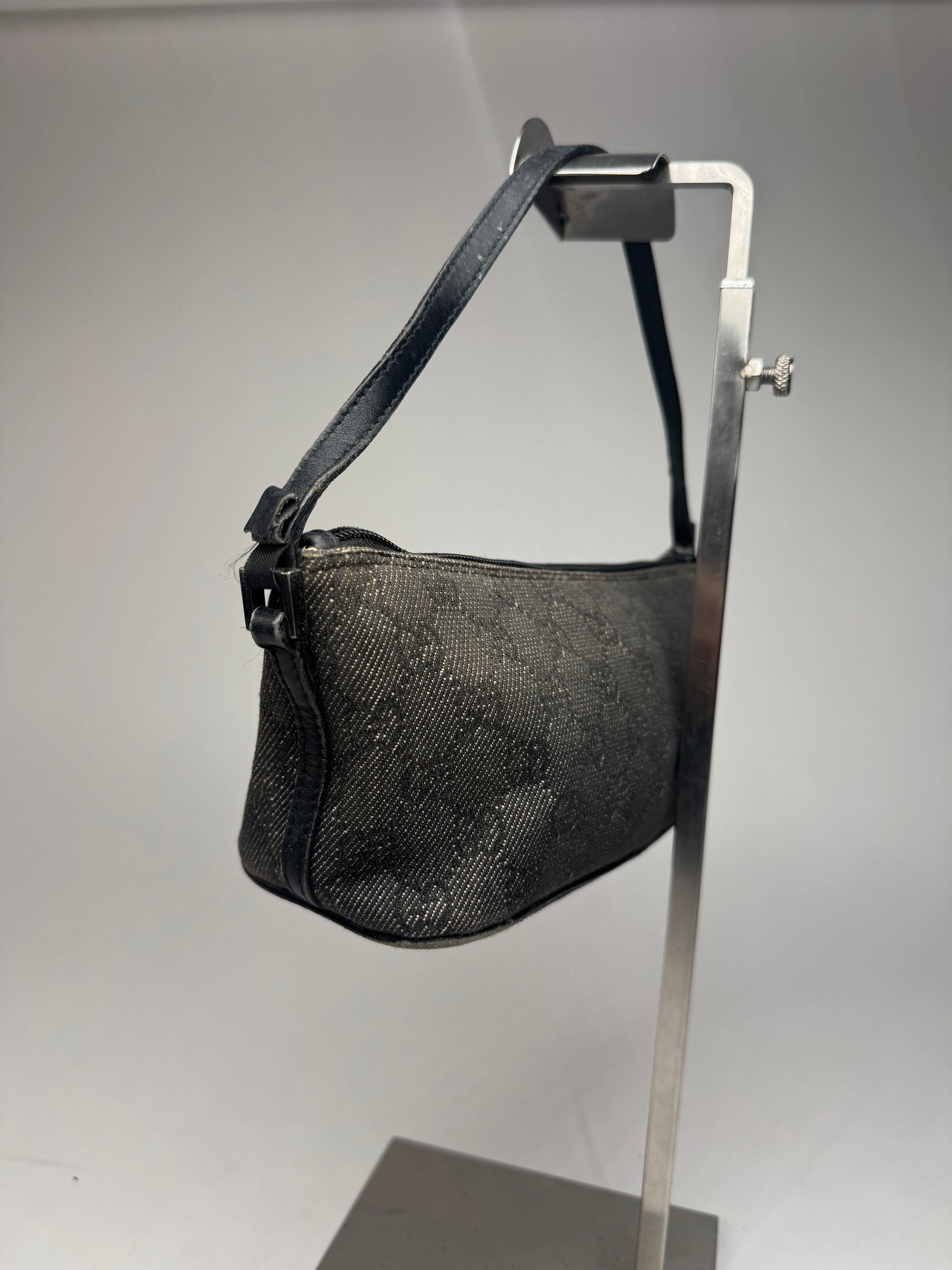 This elegant vintage baguette handbag is finely crafted from black Gucci Monogram canvas. It features a black leather handle and a matching leather base, adding a touch of sophistication to its design. The hardware is silver-toned steel, perfectly complementing the dark tones. The interior is lined with black canvas and offers a compact yet practical space. Proudly made in Italy.