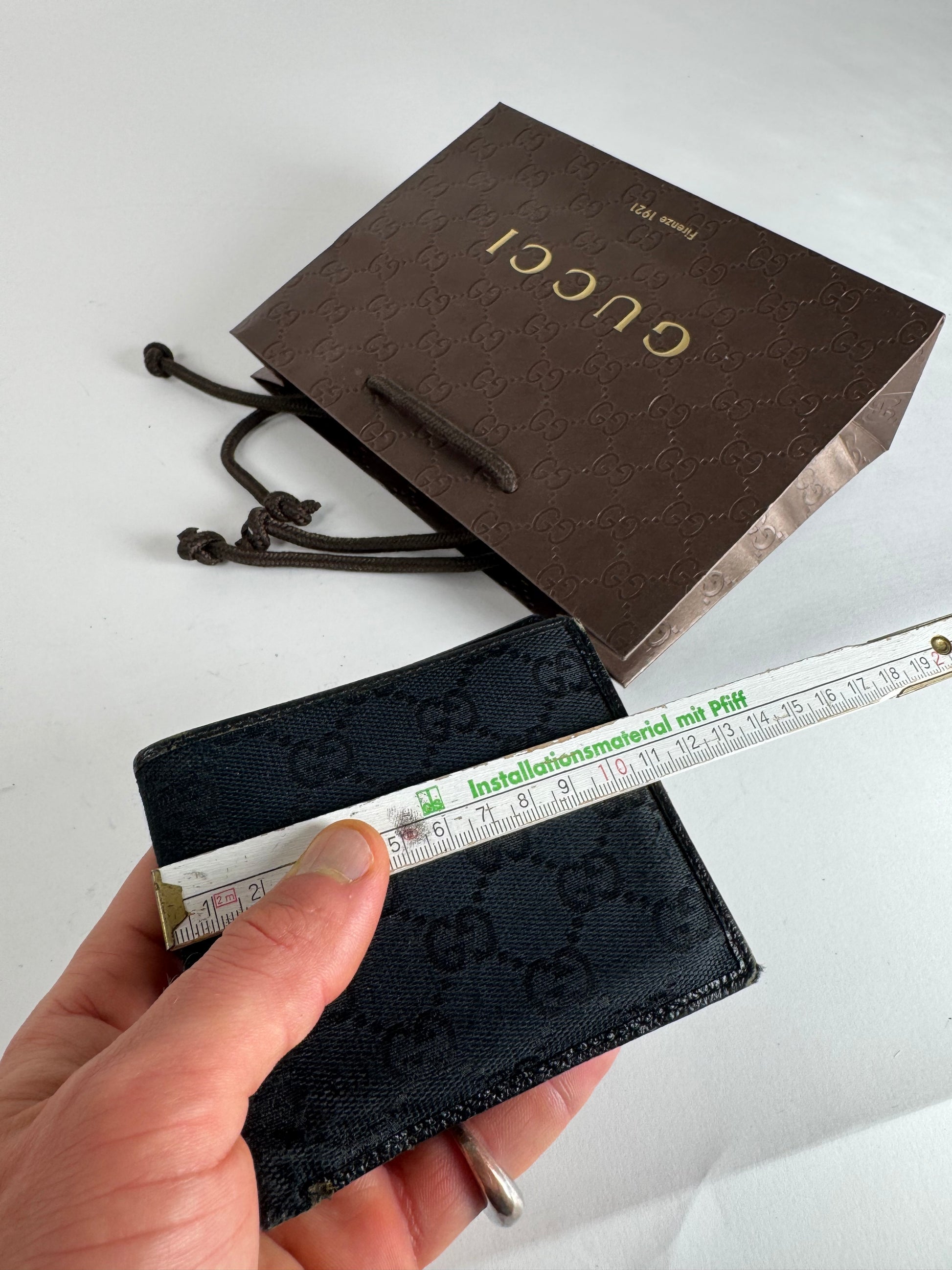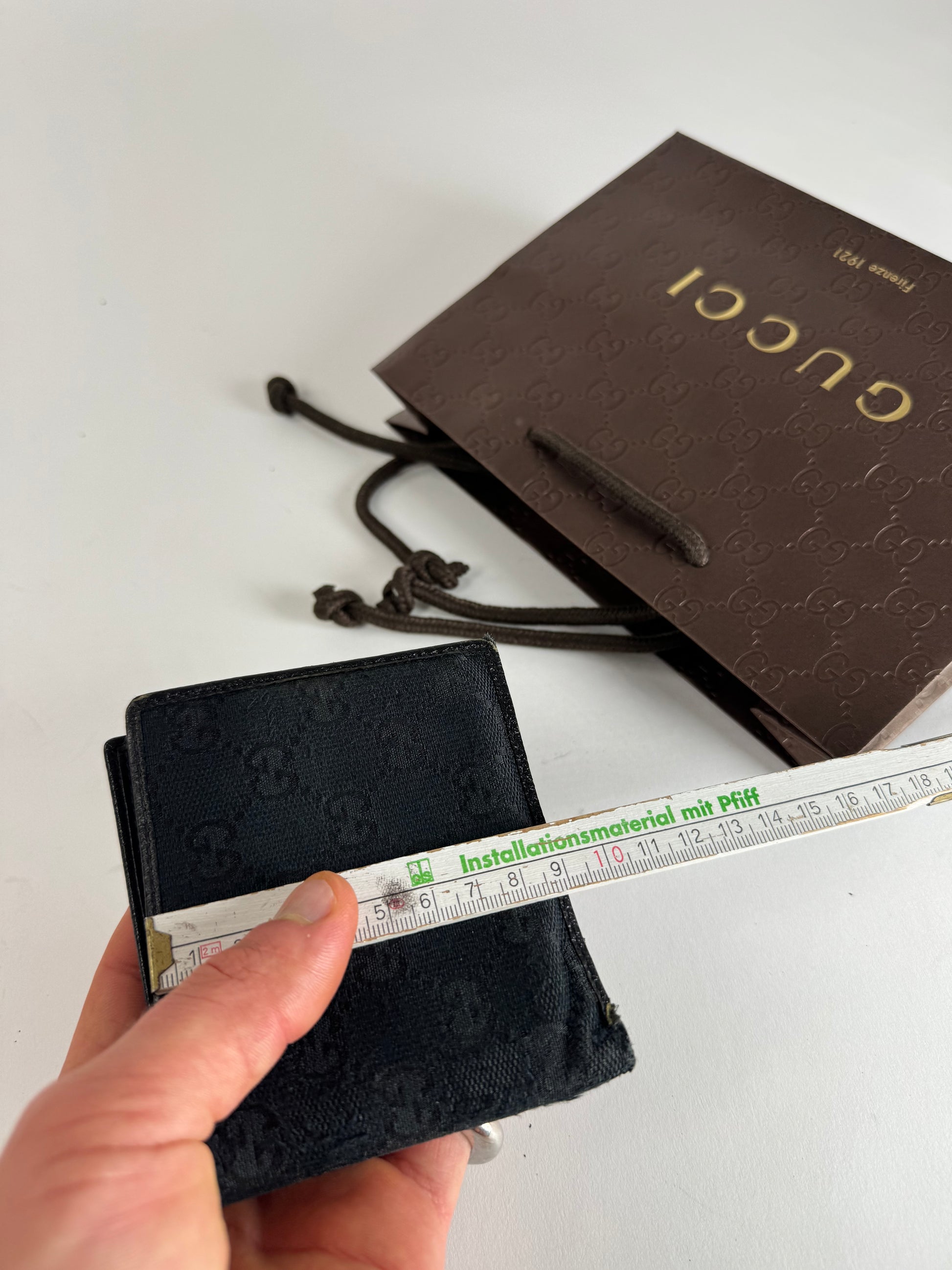 GUCCI Vintage Zumi Flap Wallet. This stylish vintage Zumi wallet from Gucci is crafted from black canvas featuring the iconic Gucci monogram, offering a timeless and sophisticated design. The interior is lined with black leather, providing a sleek and refined contrast. Made in Italy, this unisex wallet is both functional and elegant.