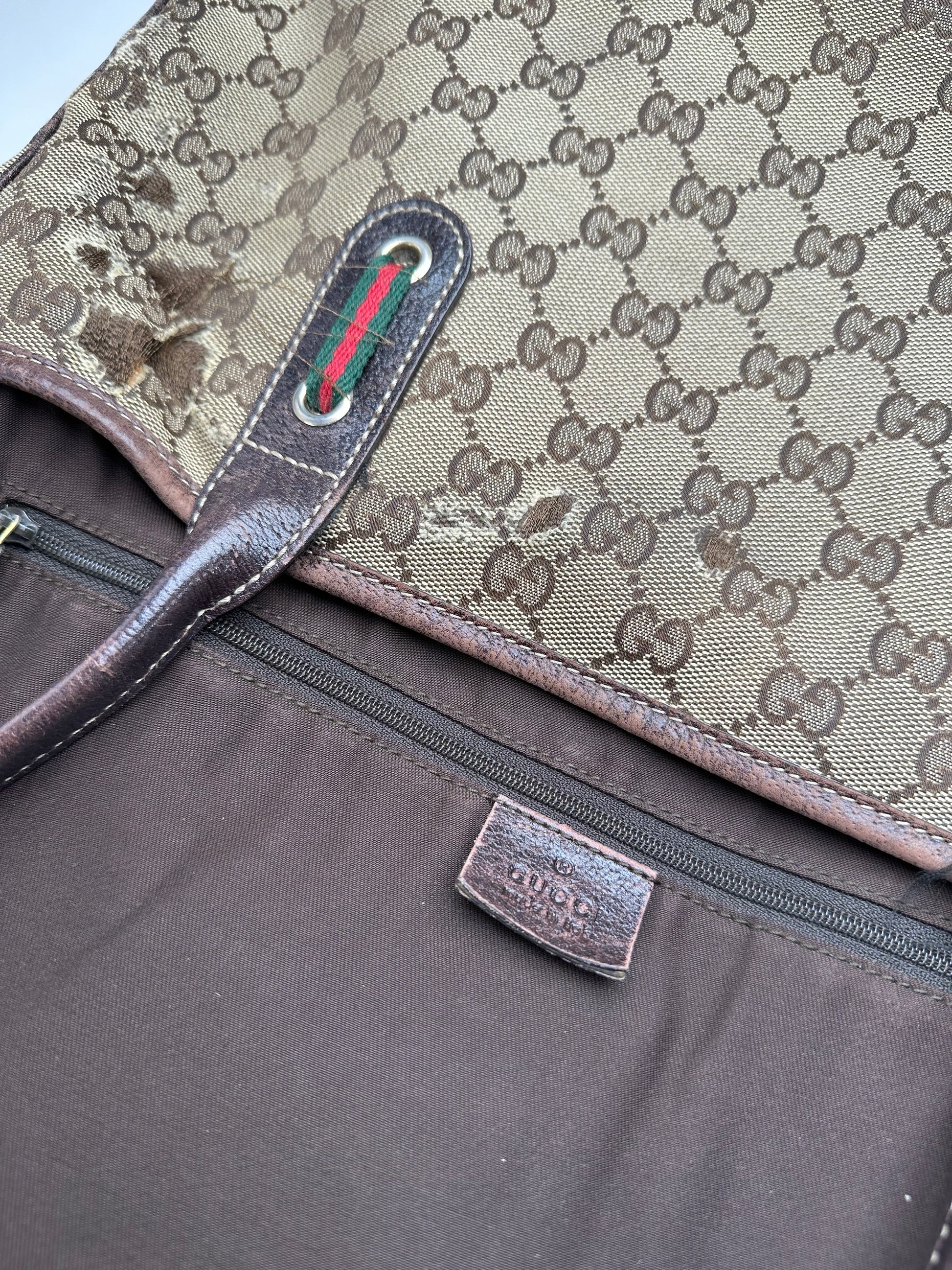 Condition Details: The exterior canvas and leather show visible signs of wear with damaged material and loose threads present. The gold-tone hardware remains bright with surface scratches. The interior lining shows signs of usage. Authenticity code reads: 163805213042.