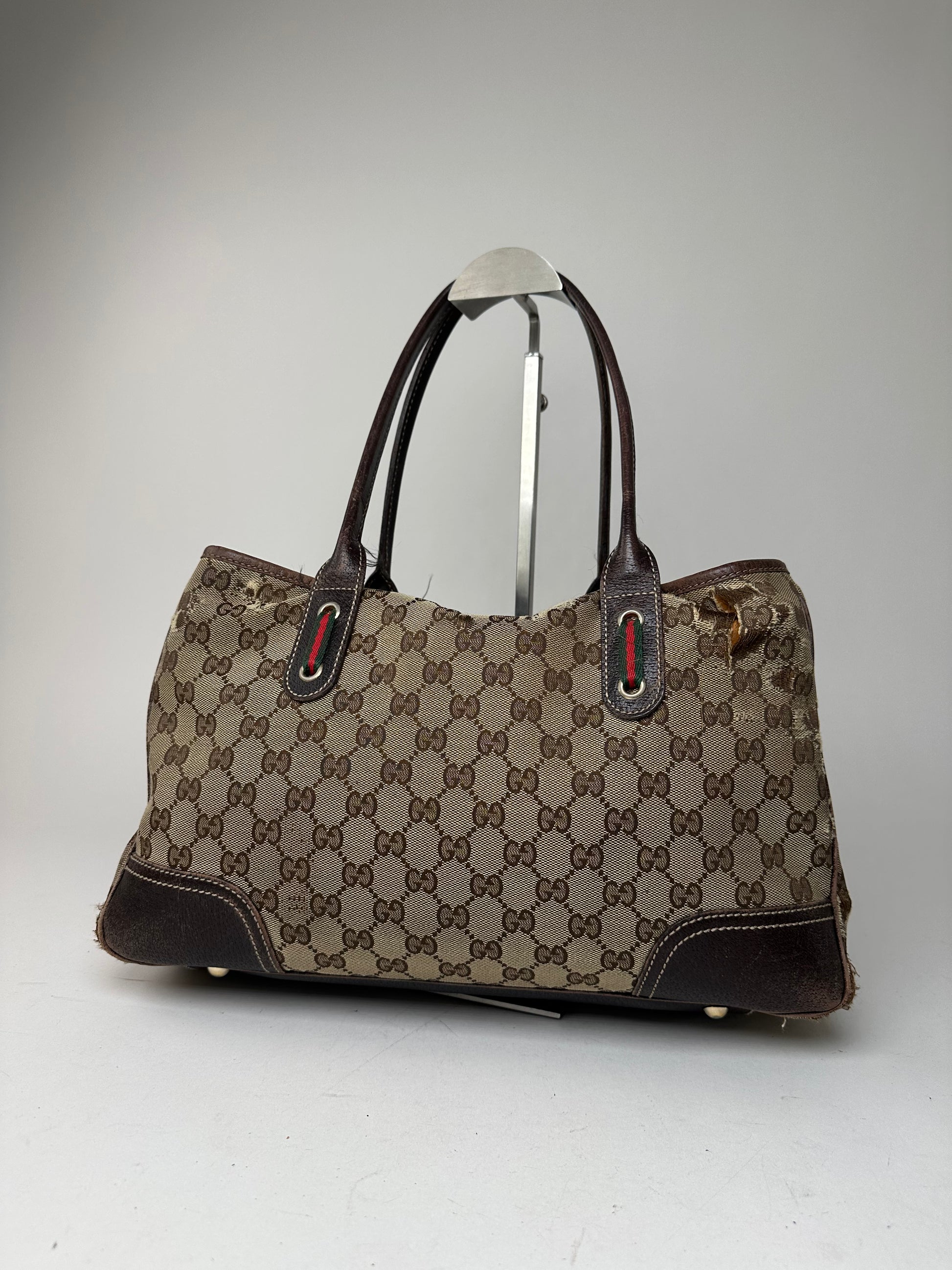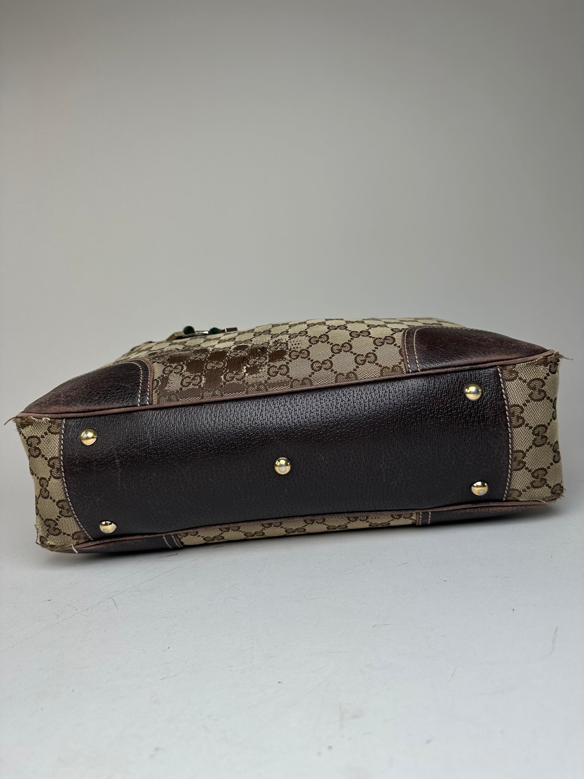 Vintage Gucci Monogram Canvas Leather Handbag Beige Brown