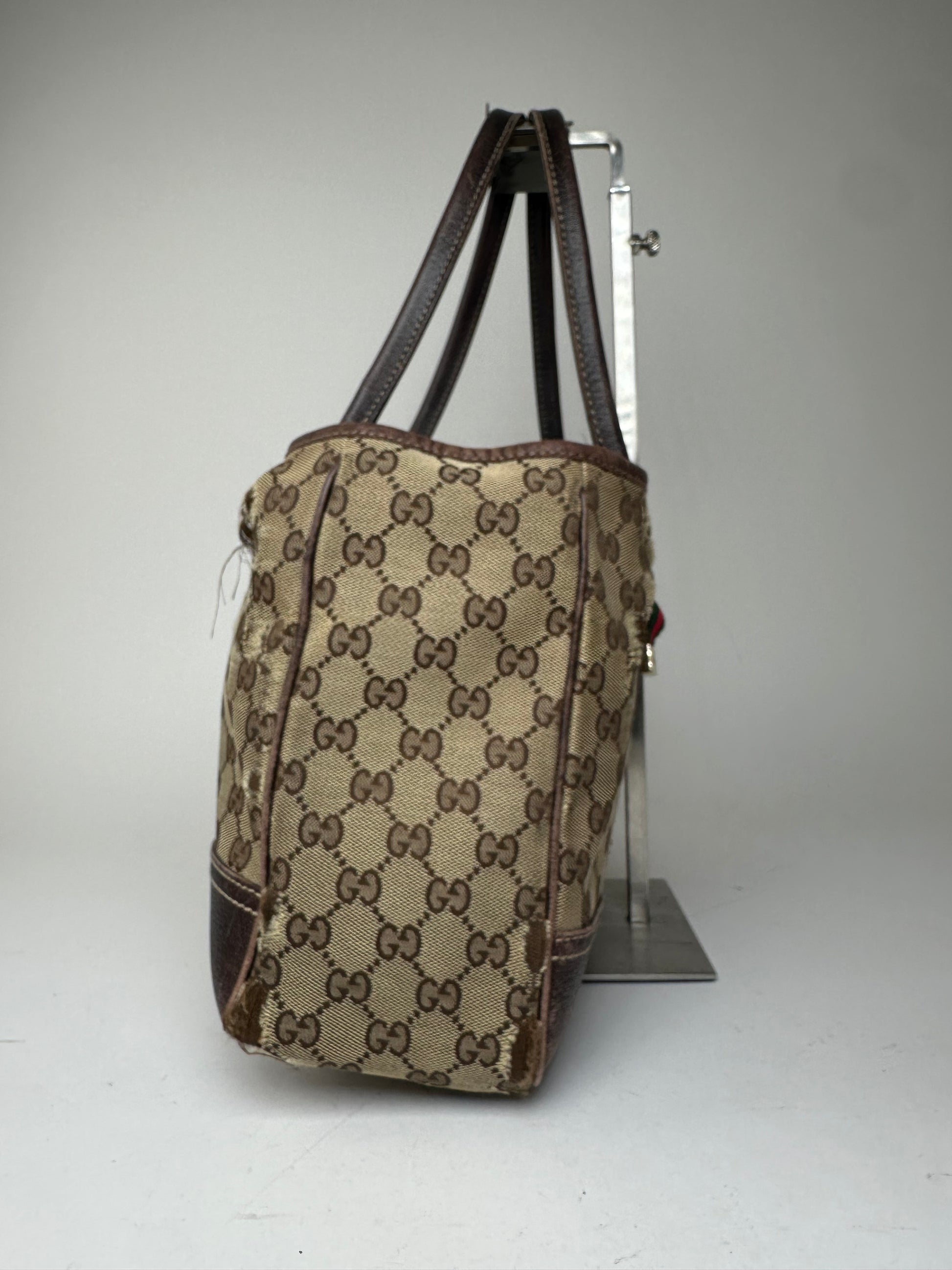GUCCI Vintage Tote Bag. This classic tote bag is finely crafted of beige-brown canvas with the iconic Gucci monogram and features brown leather trimming and handles. The bag has an open top design for easy access and opens to a brown canvas interior. Made in Italy.