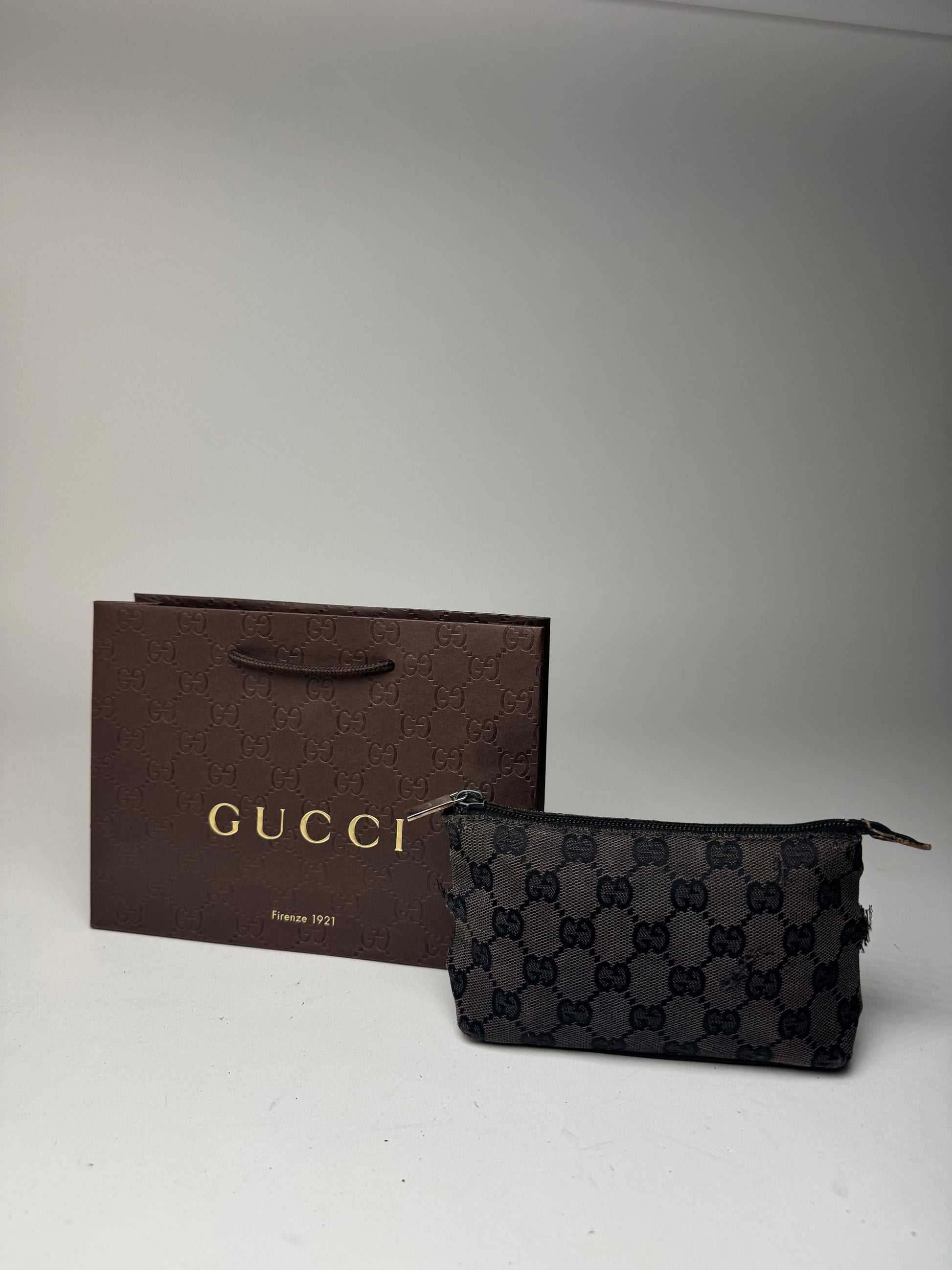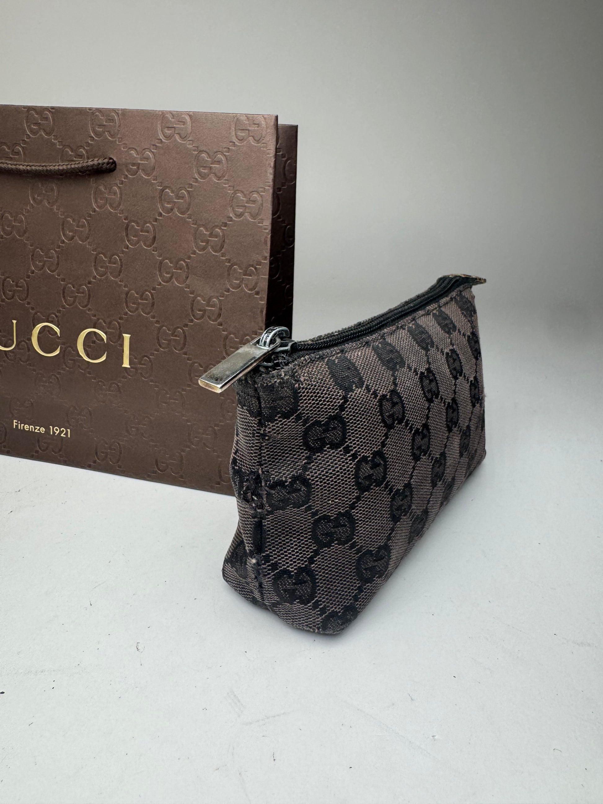 GUCCI Monogram Canvas Mini Bag. This chic mini bag is finely crafted of brown and black Gucci monogram canvas with black leather trimming. It features silver-tone steel hardware and a compact silhouette. The interior is lined with black canvas.