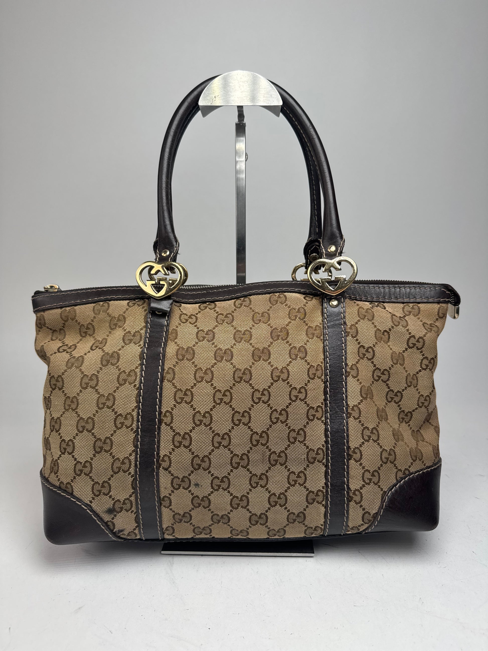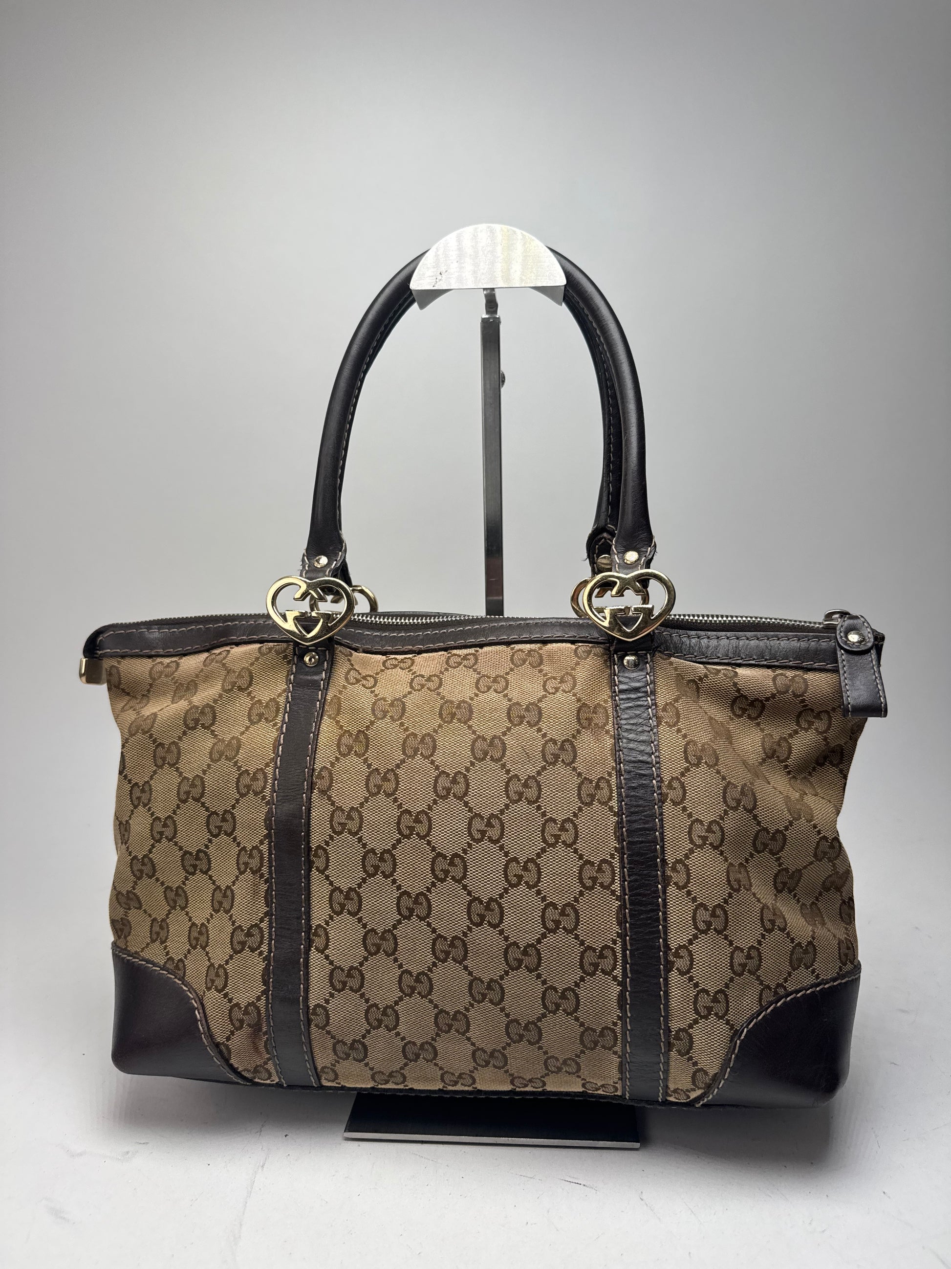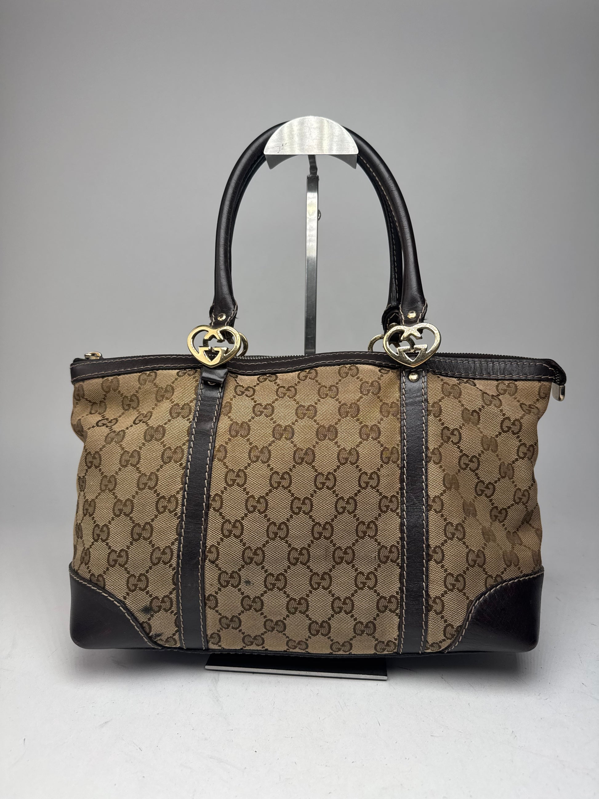 This classic vintage handbag is crafted from beige and brown canvas featuring the iconic Gucci monogram, complemented by brown leather handles, corners, and trim. The transitions from the bag to the handles are adorned with gold-tone steel GG appliqués, highlighting Gucci’s timeless craftsmanship and luxurious detailing. The bag closes securely with a top zipper and is made in Italy. Authenticity code reads: 257 069 520 981.