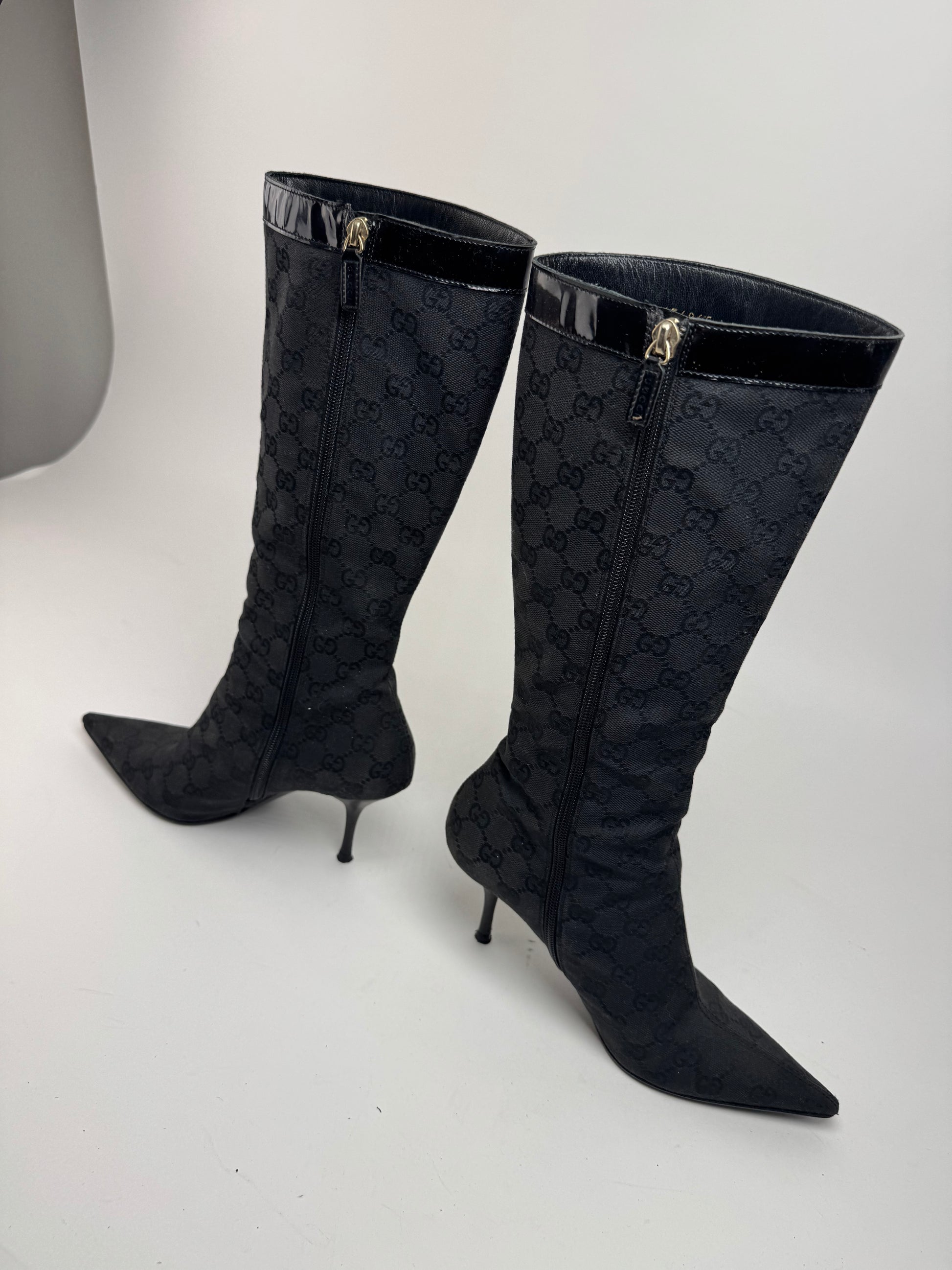 GUCCI Vintage Boots. These chic boots are finely crafted of black patent leather, black leather, and black canvas featuring an all-over Gucci monogram. They feature pointed toes and a full-length side zipper.