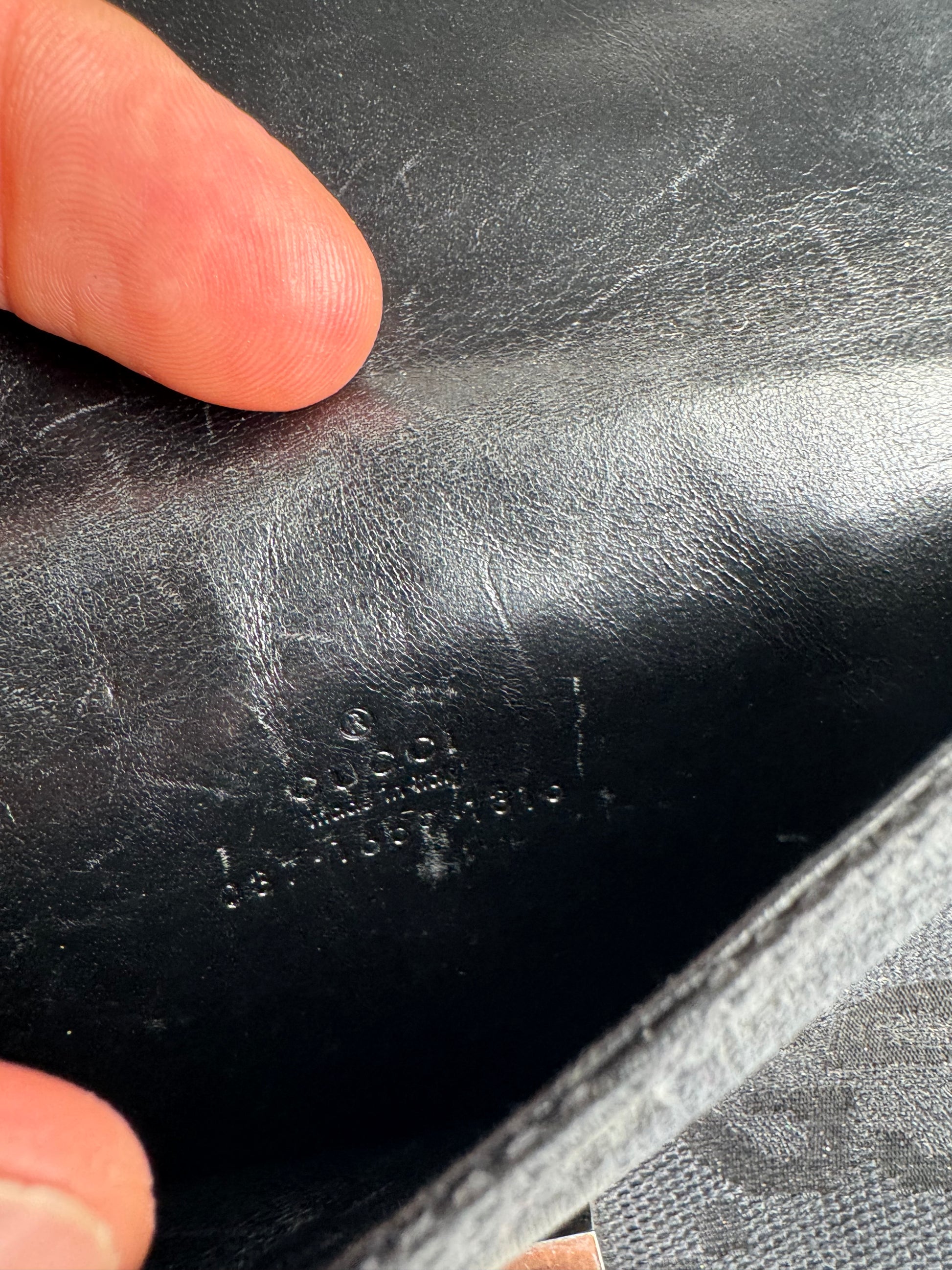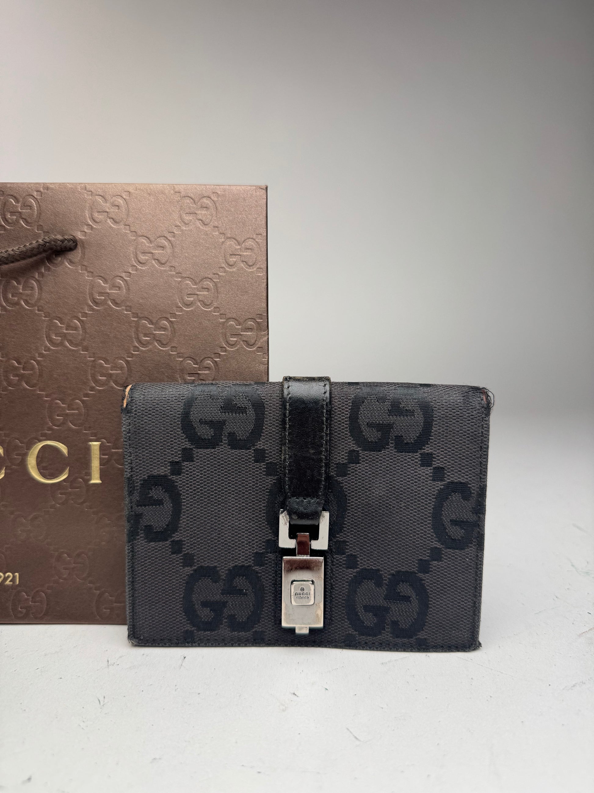 This elegant cardholder is finely crafted of brown and black Gucci monogram canvas with dark brown leather trim. It features silver-tone steel hardware. The interior is lined in black leather. The piece is from Gucci’s iconic Jackie line, originally introduced in the 1960s and named after Jackie Kennedy, symbolizing timeless elegance and sophistication. The cardholder comes with a Gucci shopping bag.