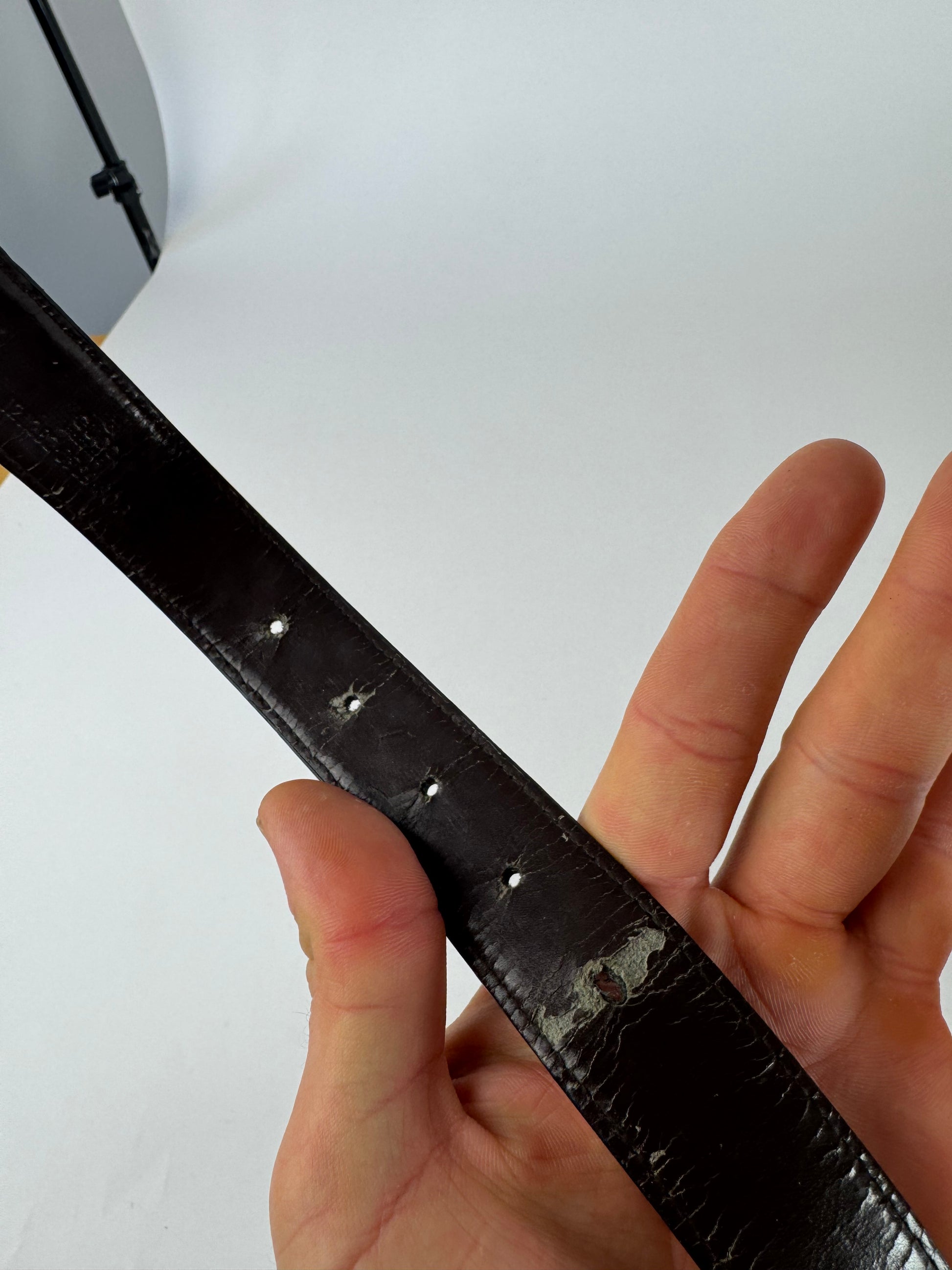 Condition Details: The belt shows heavy wear around the holes and discoloration on the buckle, but remains in good overall condition.