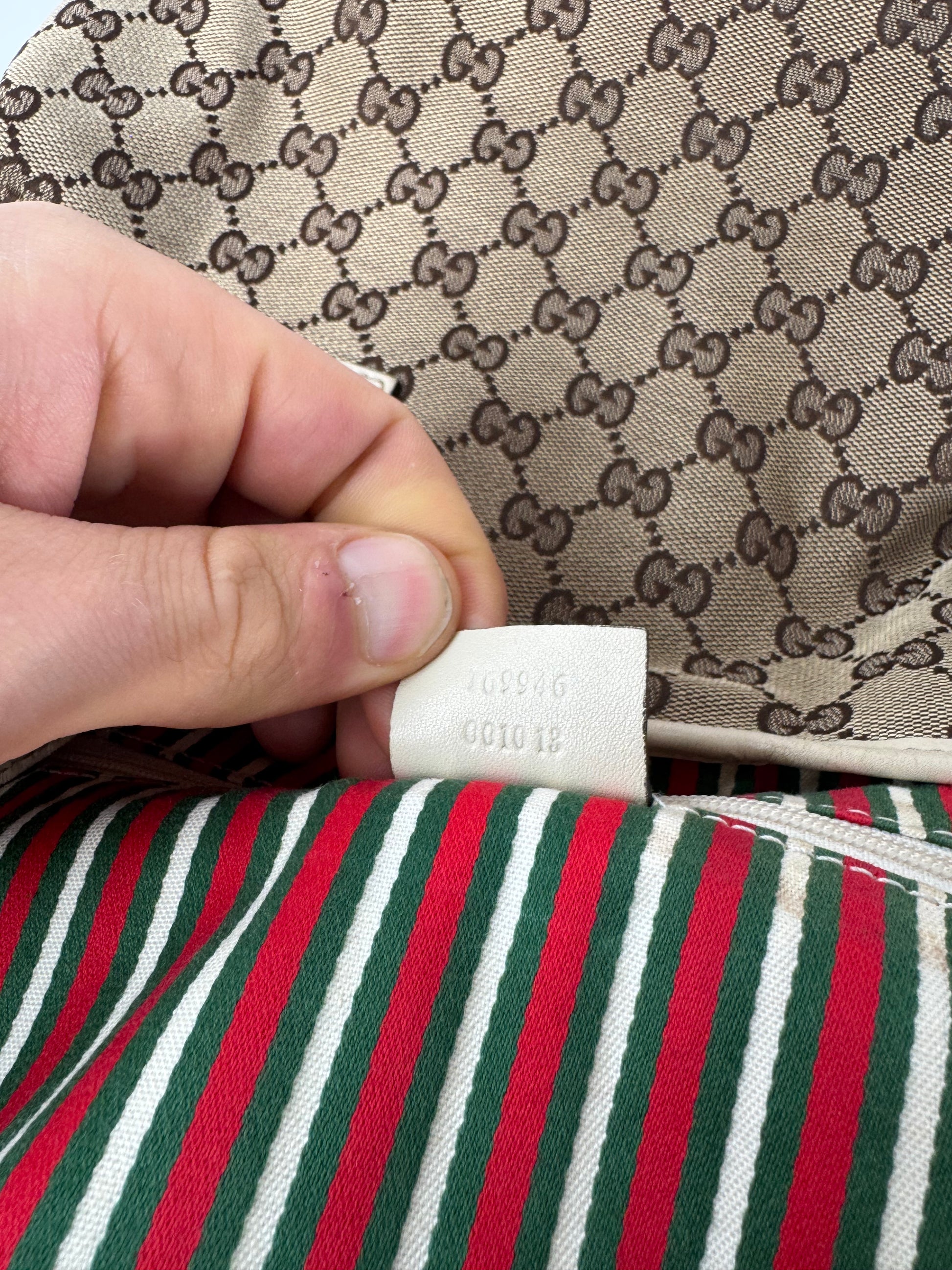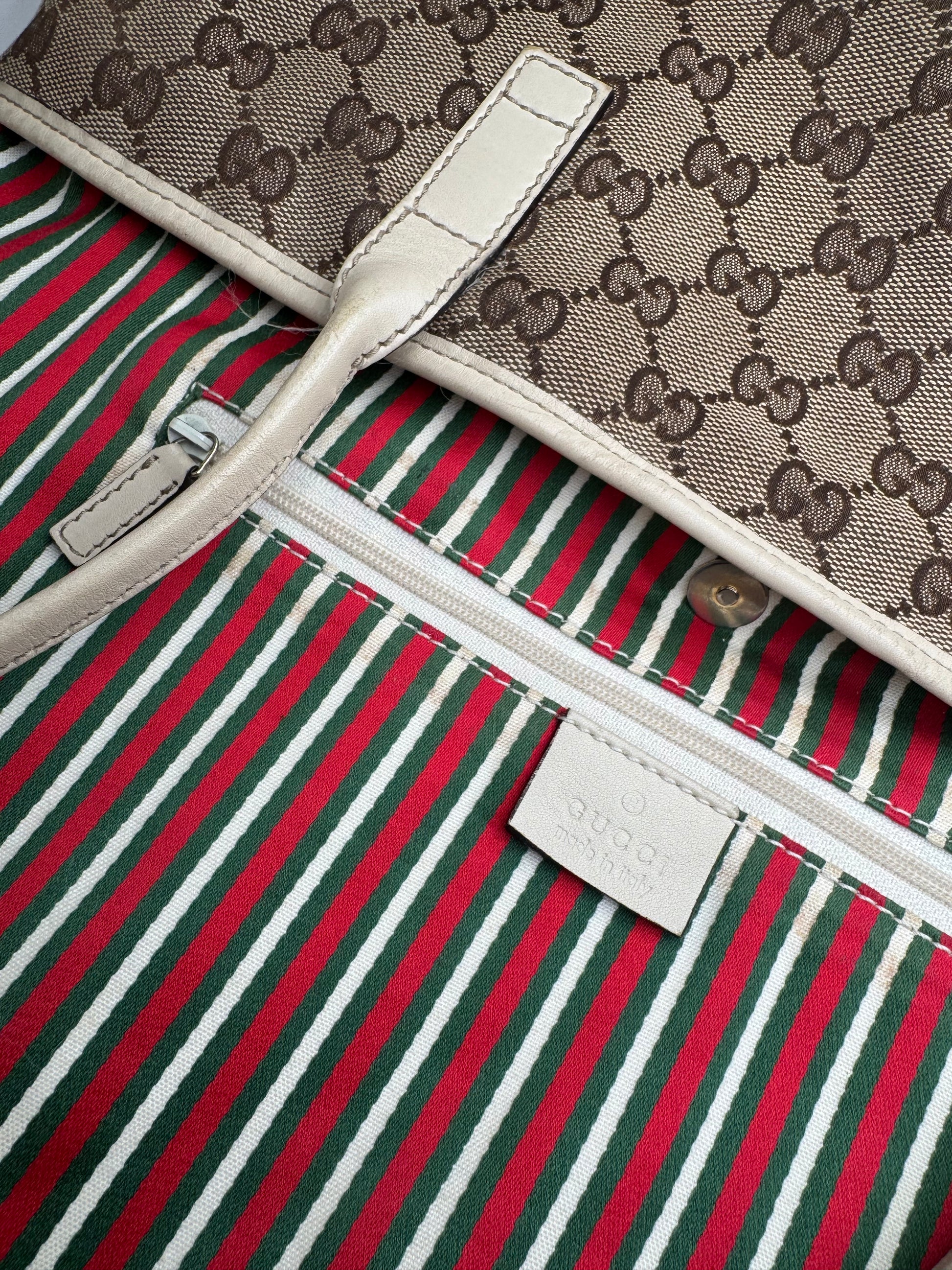 This elegant vintage tote bag is finely crafted from beige and brown Gucci monogram canvas. The bag features white leather handles and trim, a gold-tone steel GG logo appliqué on the lower right front corner, and matching gold-tone hardware throughout. The interior is lined with Gucci’s signature red, white, and green striped canvas, embodying the brand’s timeless Italian craftsmanship.