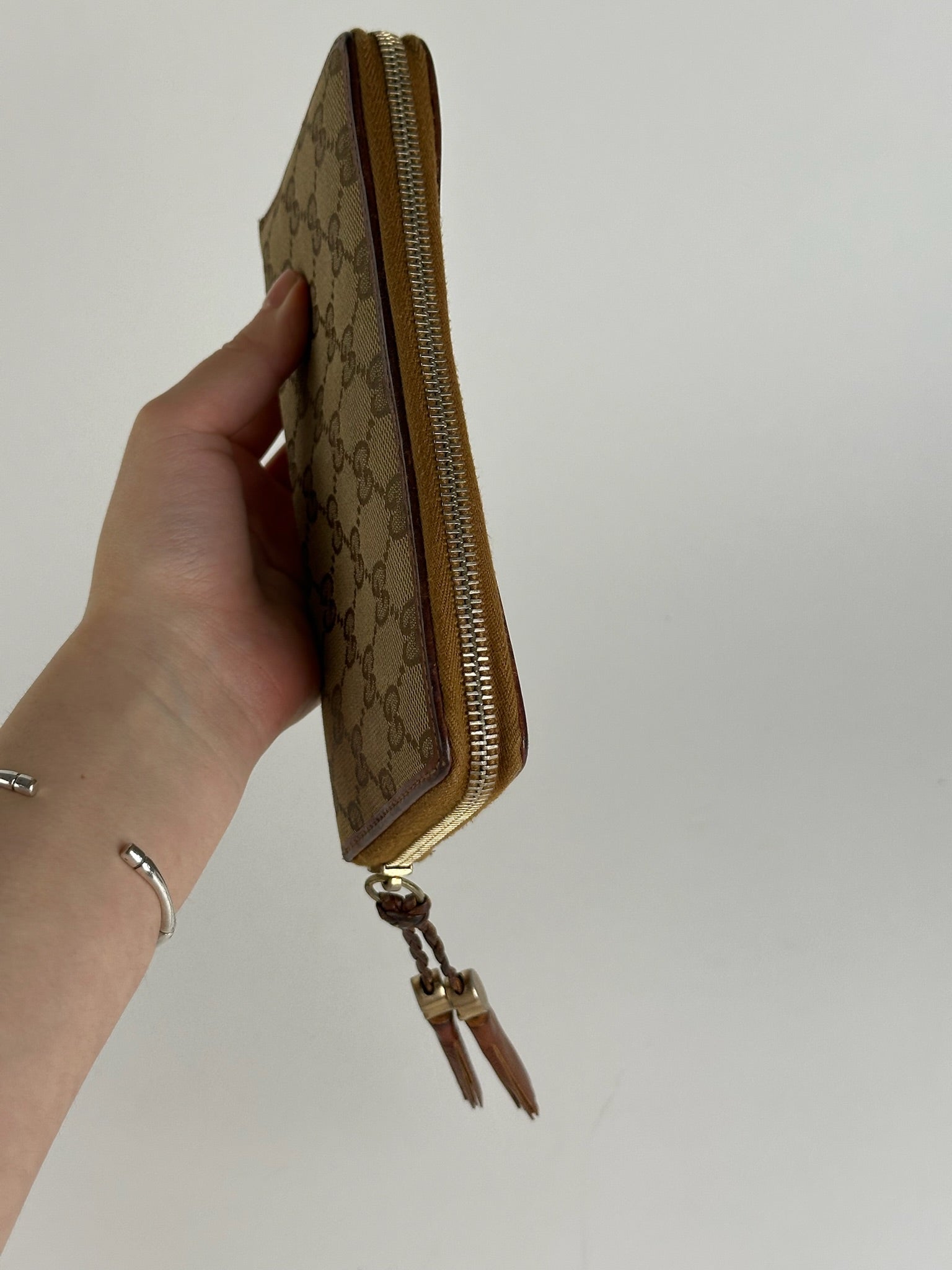 GUCCI GG Monogram Vintage Wallet. This elegant wallet is finely crafted of beige and brown GG monogram canvas with brown leather trim. The GG monogram, introduced in the 1960s as a tribute to founder Guccio Gucci, has since become one of the most recognizable symbols in luxury fashion. The top zipper features two leather tassels attached to a gold-tone Gucci “G” charm.