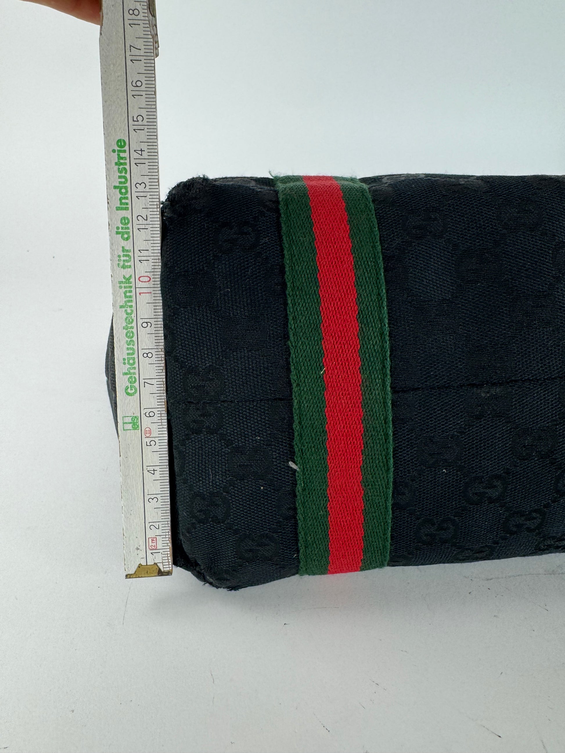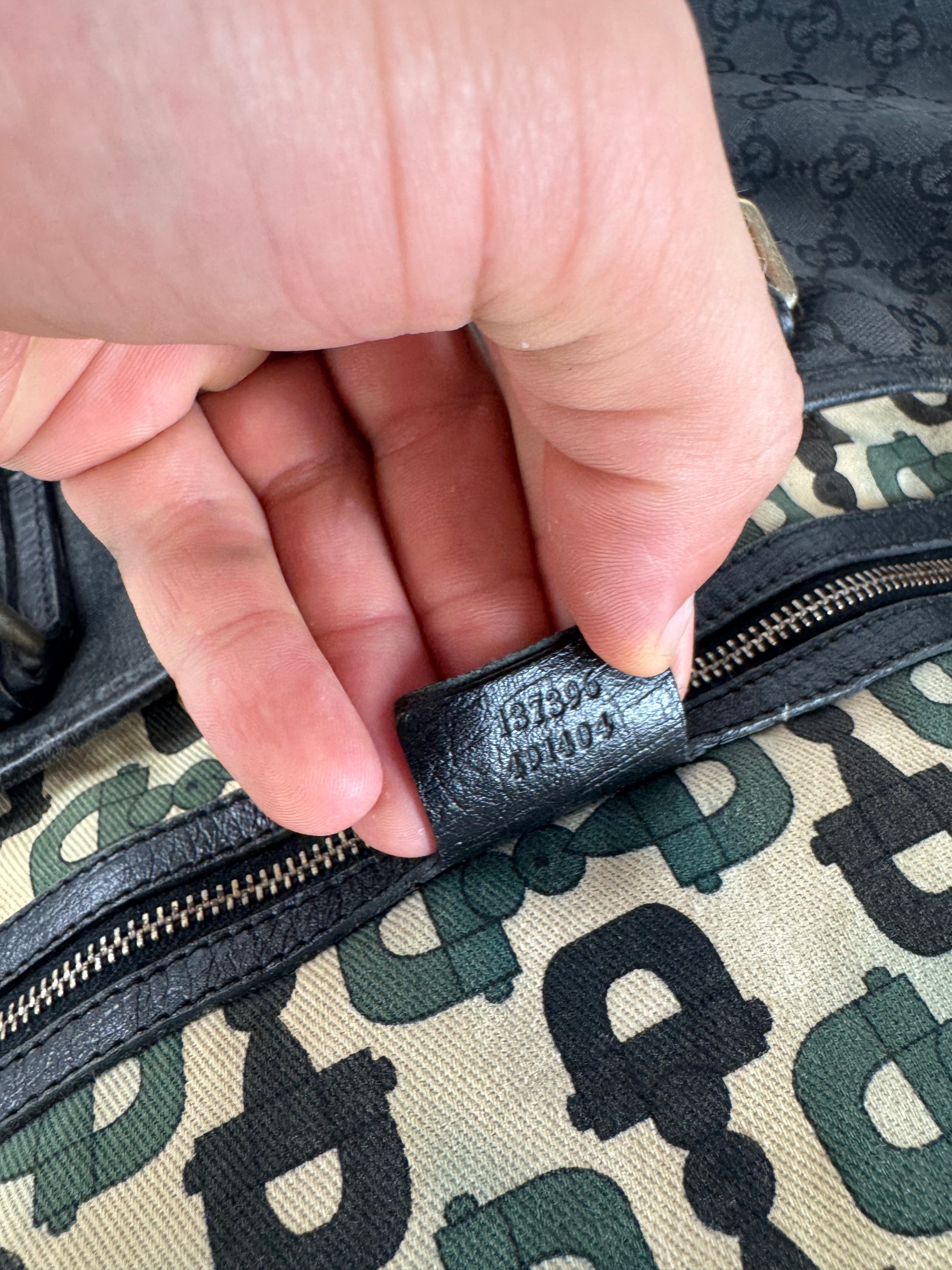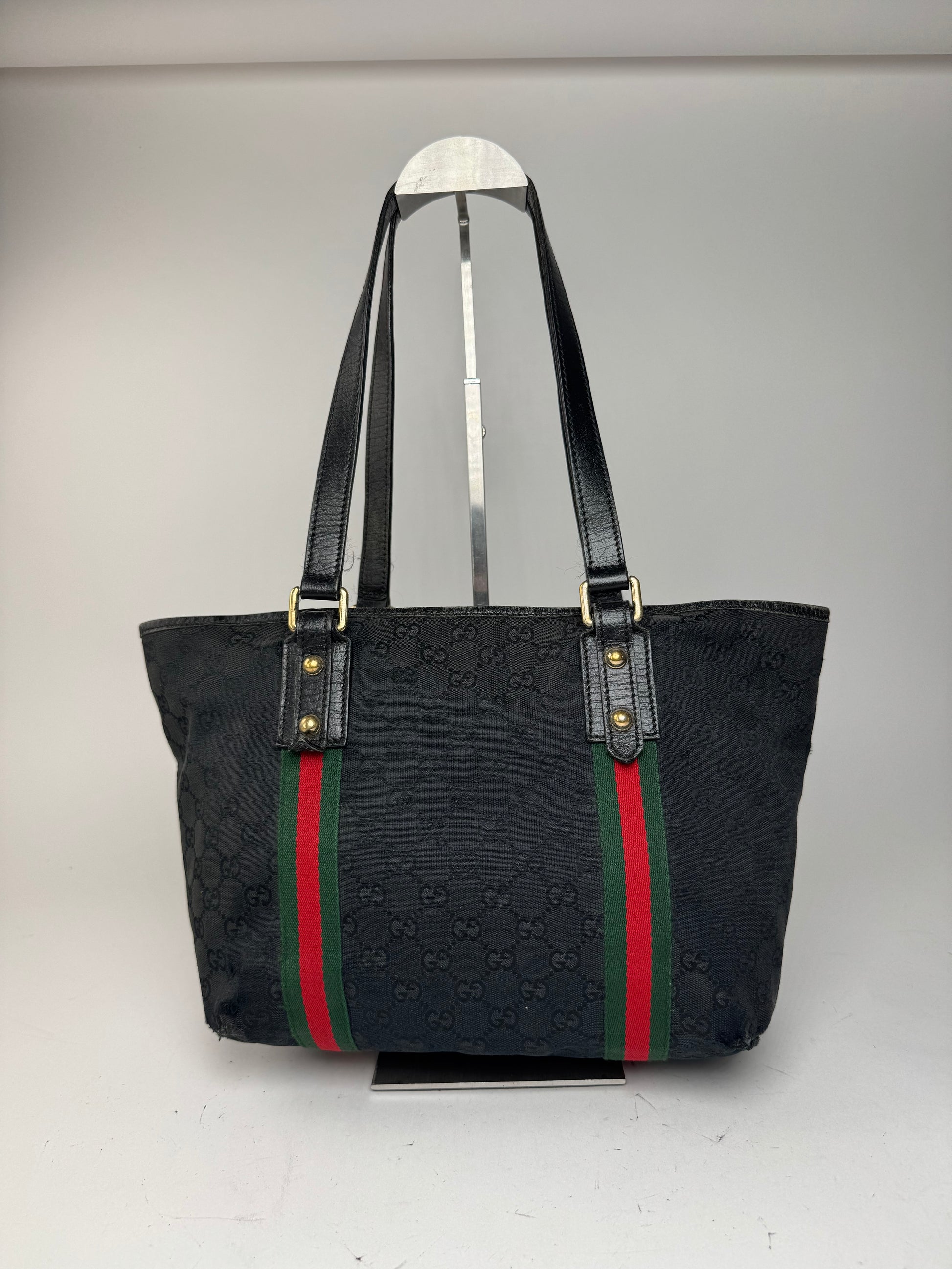 GUCCI Monogram Canvas Tote Bag. This vintage tote bag is crafted from black GG monogram canvas and features black leather handles with the classic green-red-green web stripe detailing. The piece is finished with gold-tone steel hardware. The interior is lined with beige canvas printed with black and green horseshoe logos. This tote is made in Italy and carries the serial number 137396491404.
