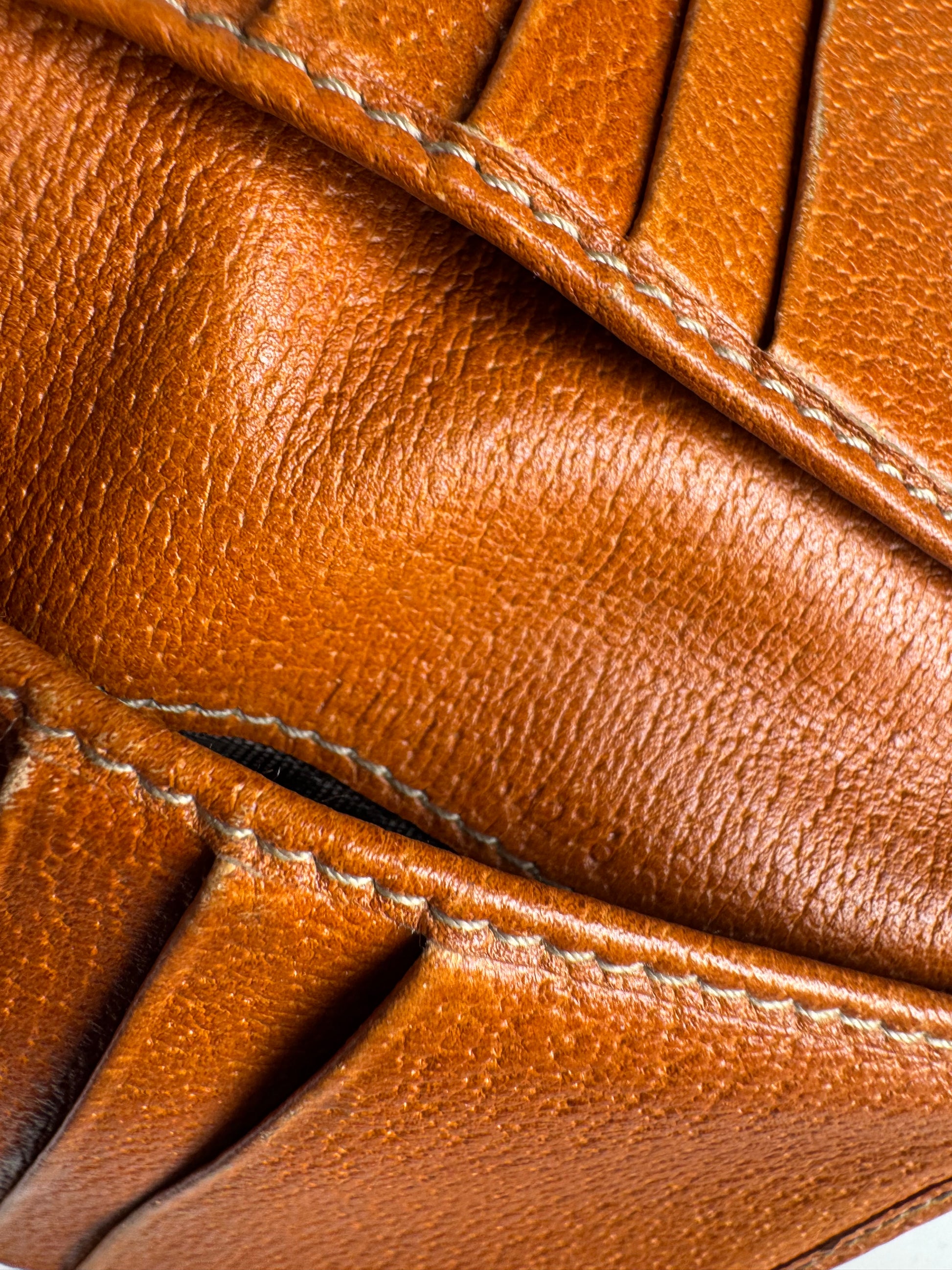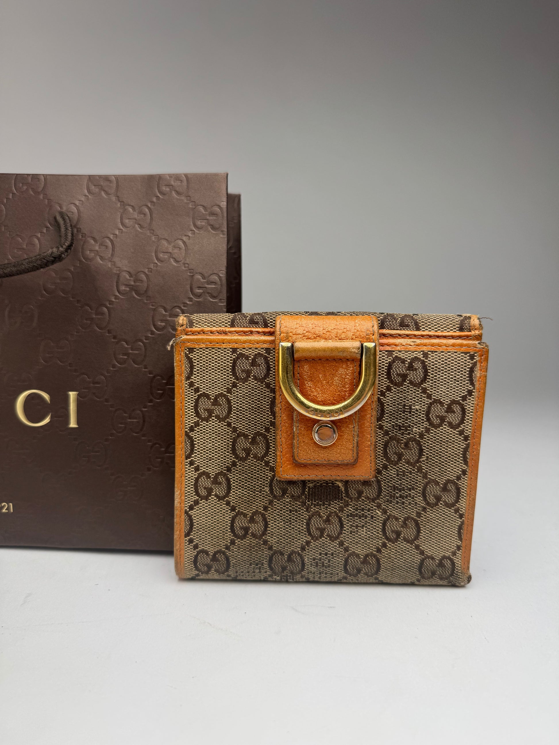 Dieses Vintage-Portemonnaie ist aus beigem Canvas mit dem charakteristischen Gucci-Monogramm gefertigt und verfügt über orangebraune Lederbesätze. Die goldfarbene Hardware aus Stahl ergänzt das klassische Design. Trotz kleiner Flecken und leicht beschädigtem Material befindet sich das Portemonnaie in einem sehr guten Zustand. Das Innere ist mit orangebraunem Leder ausgekleidet. Der Verkauf erfolgt inklusive einer Gucci-Tüte.