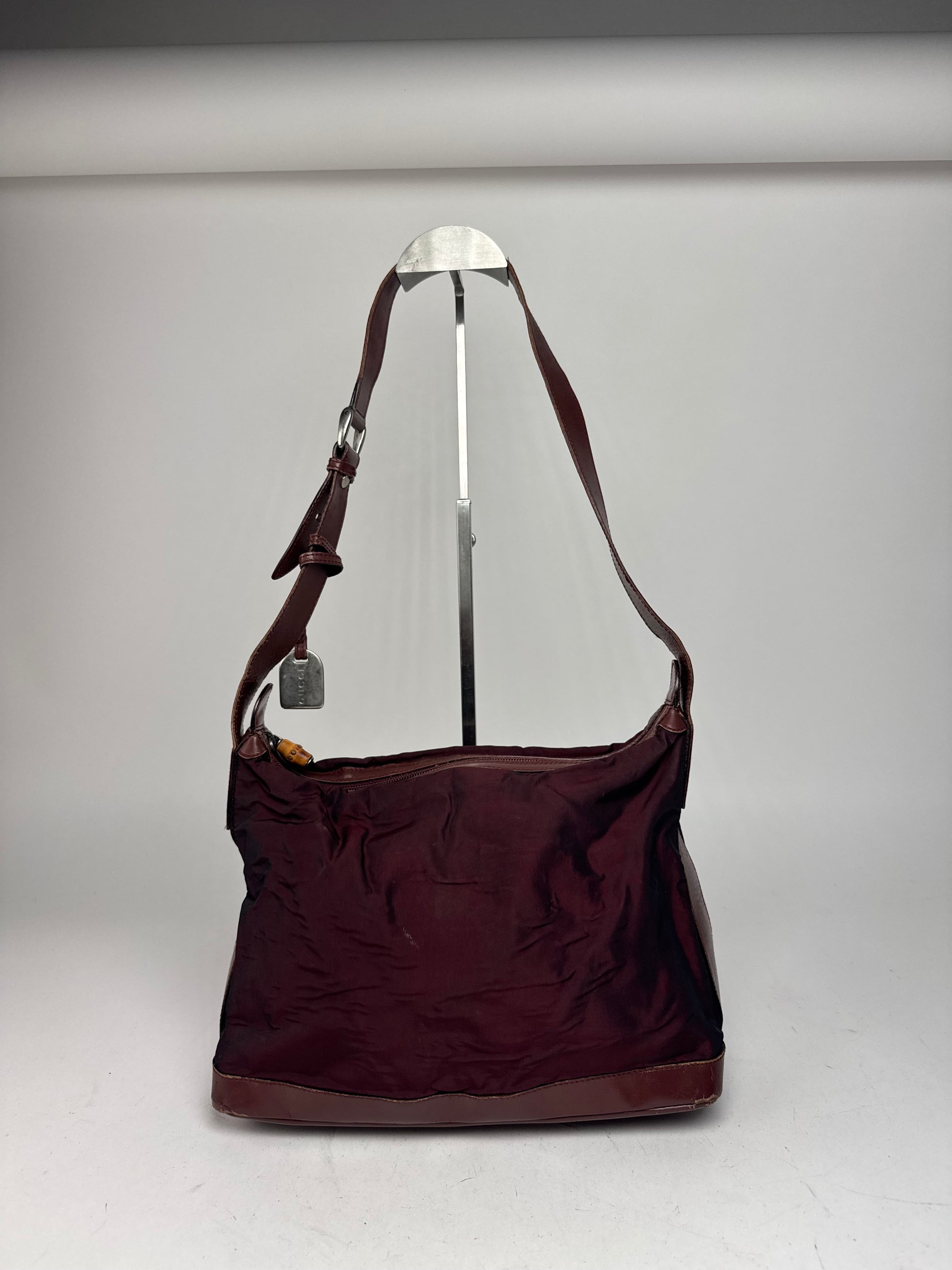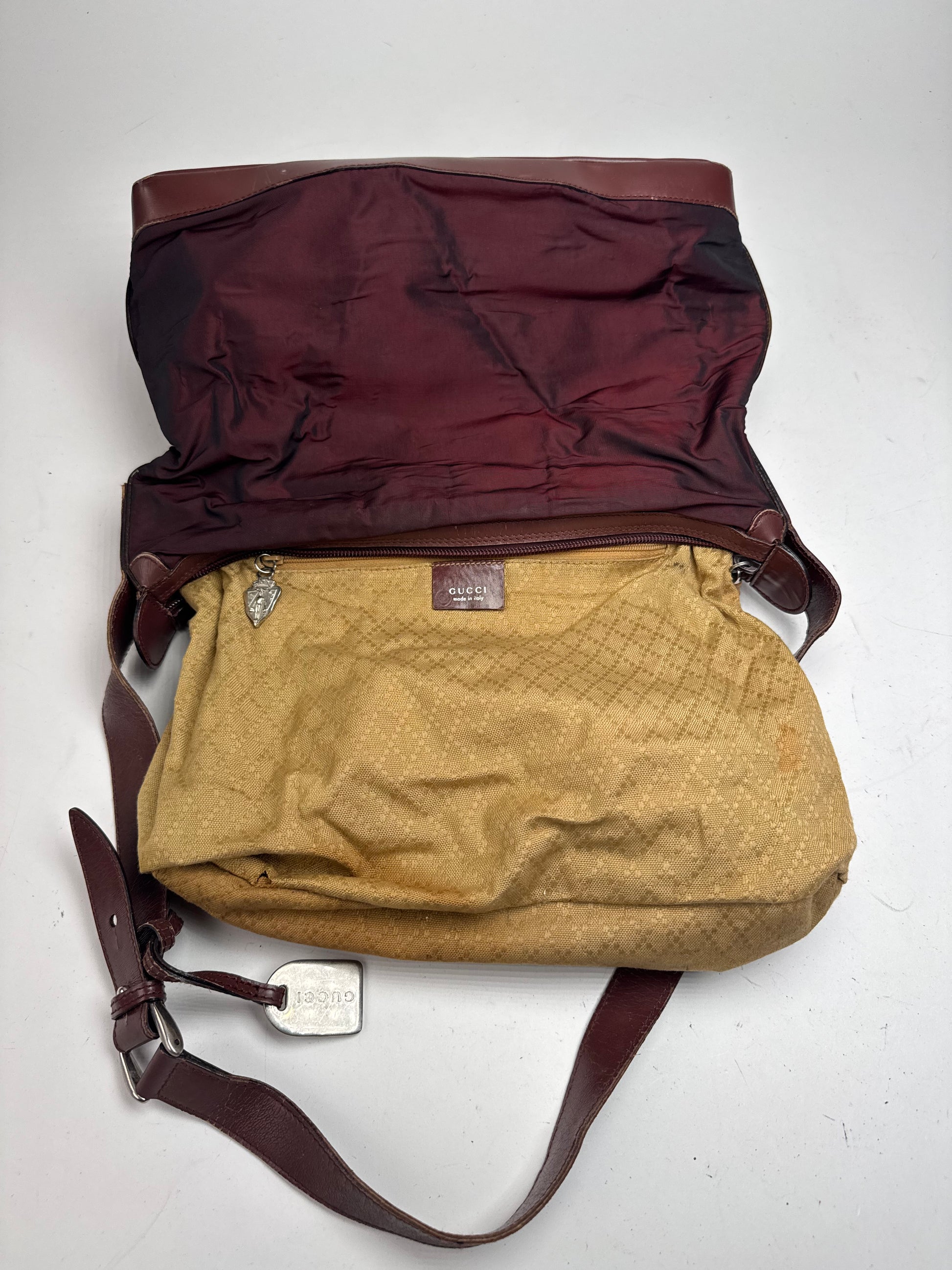 Condition Details: The material is wrinkled and shows minor scratches and scuffs, but overall the bag remains in good vintage condition. Hardware is bright and intact.