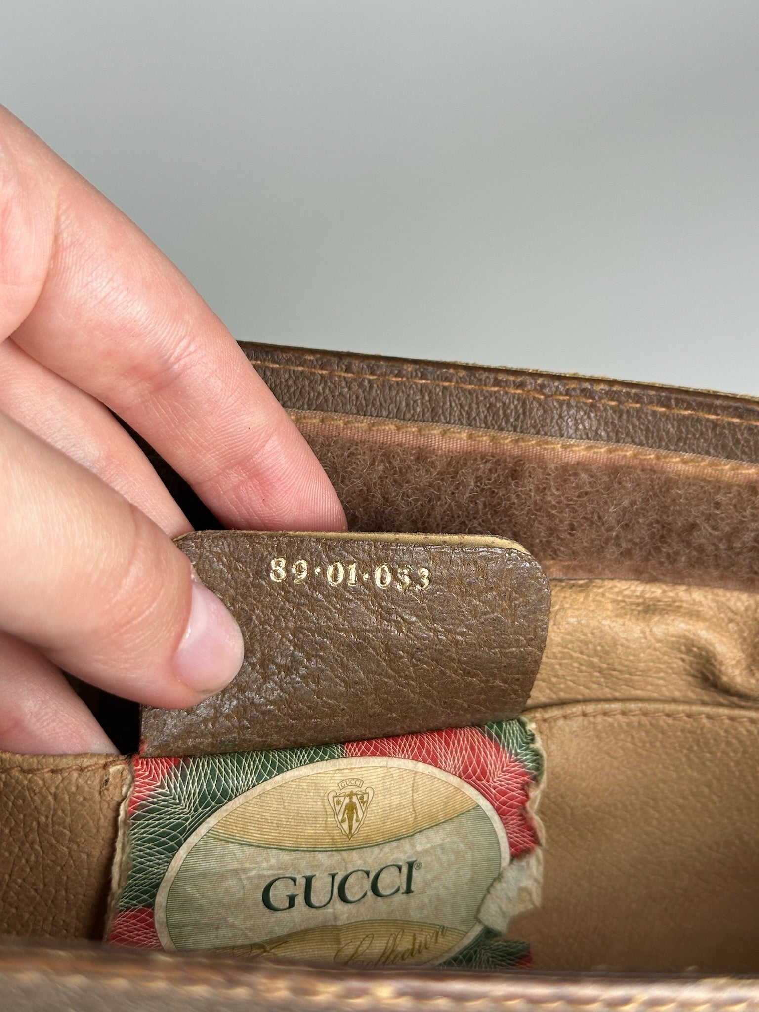 GUCCI Ophidia Vintage Clutch. This chic accessory is finely crafted of grey and brown leather in the classic Gucci monogram. It features gold-tone steel hardware and a structured silhouette, perfect for day or evening wear.