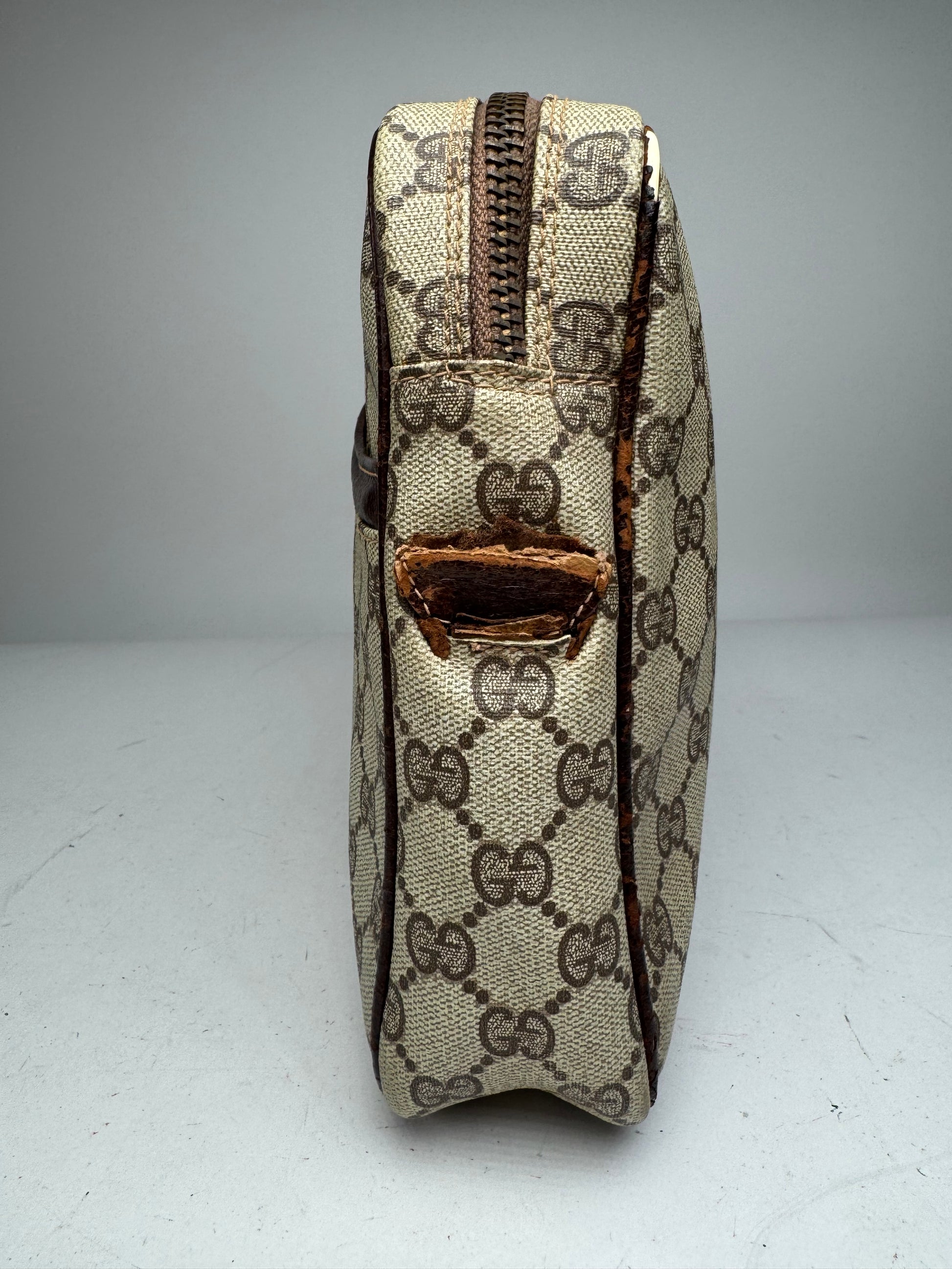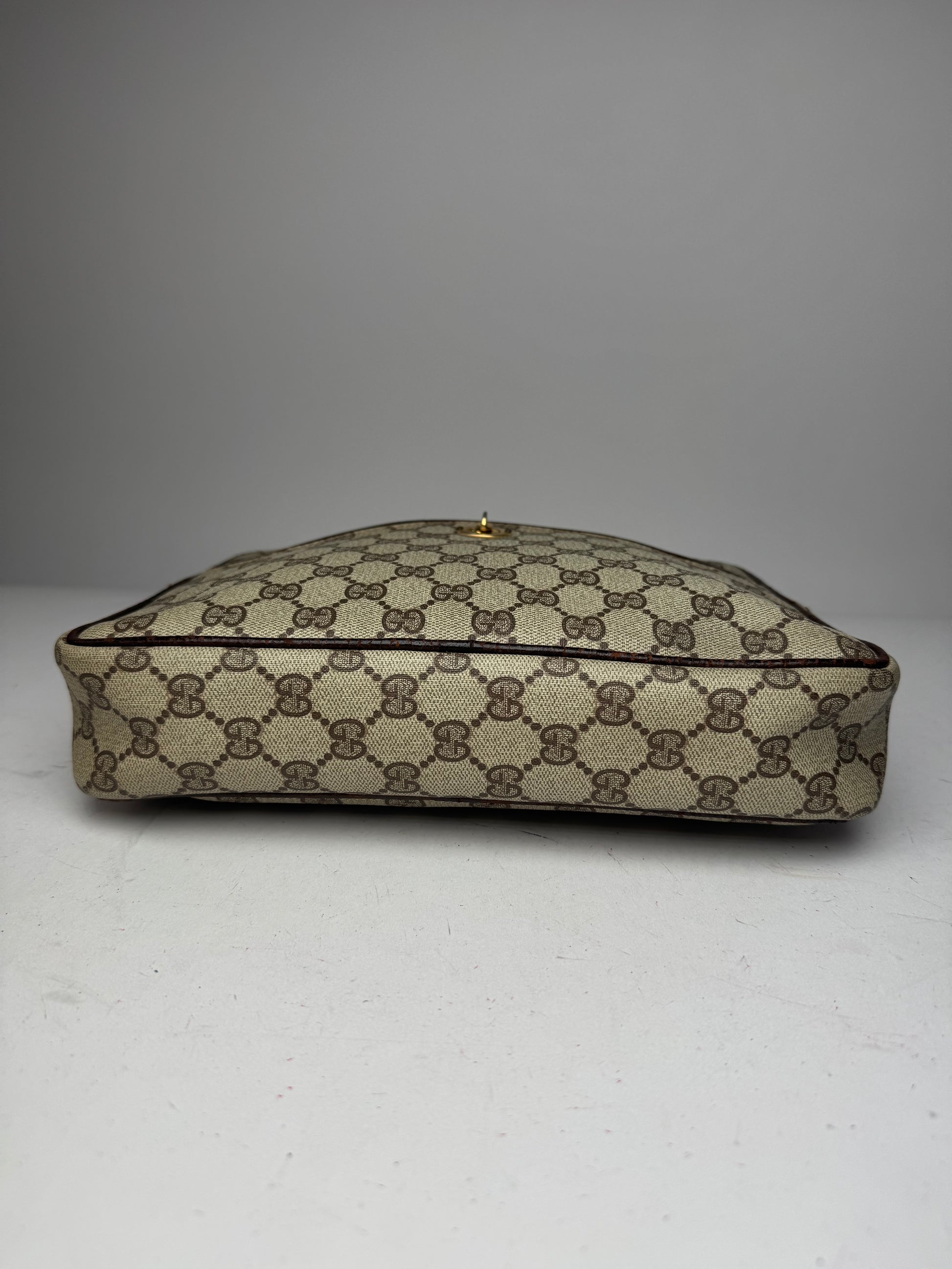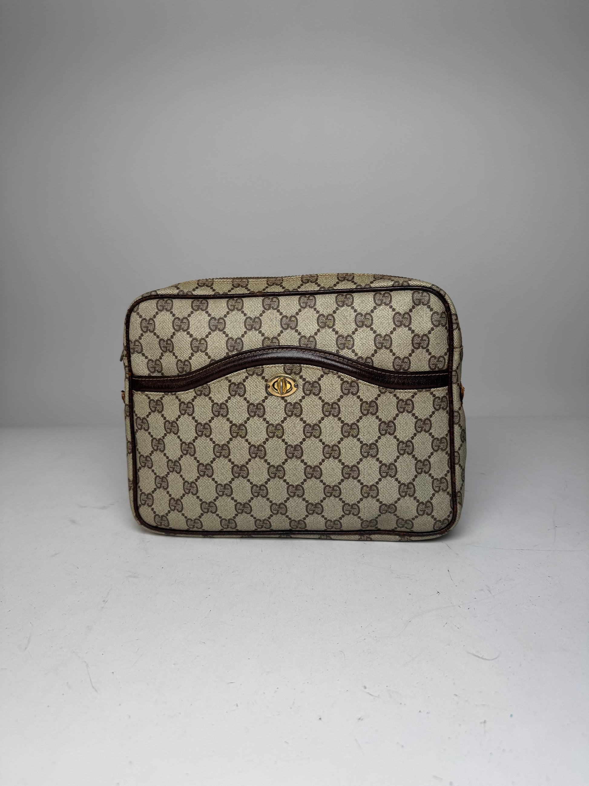 This vintage Gucci clutch features the classic grey-brown Ophidia monogram canvas with a gold-tone twist-lock closure on the front and a zipper along the top edge. Originally designed as a messenger bag, the handles were removed due to wear, giving it a new life as a stylish clutch while retaining its authentic archival character. The interior is lined in gold-brown canvas. Made in Italy, likely from the 1970s–1980s.