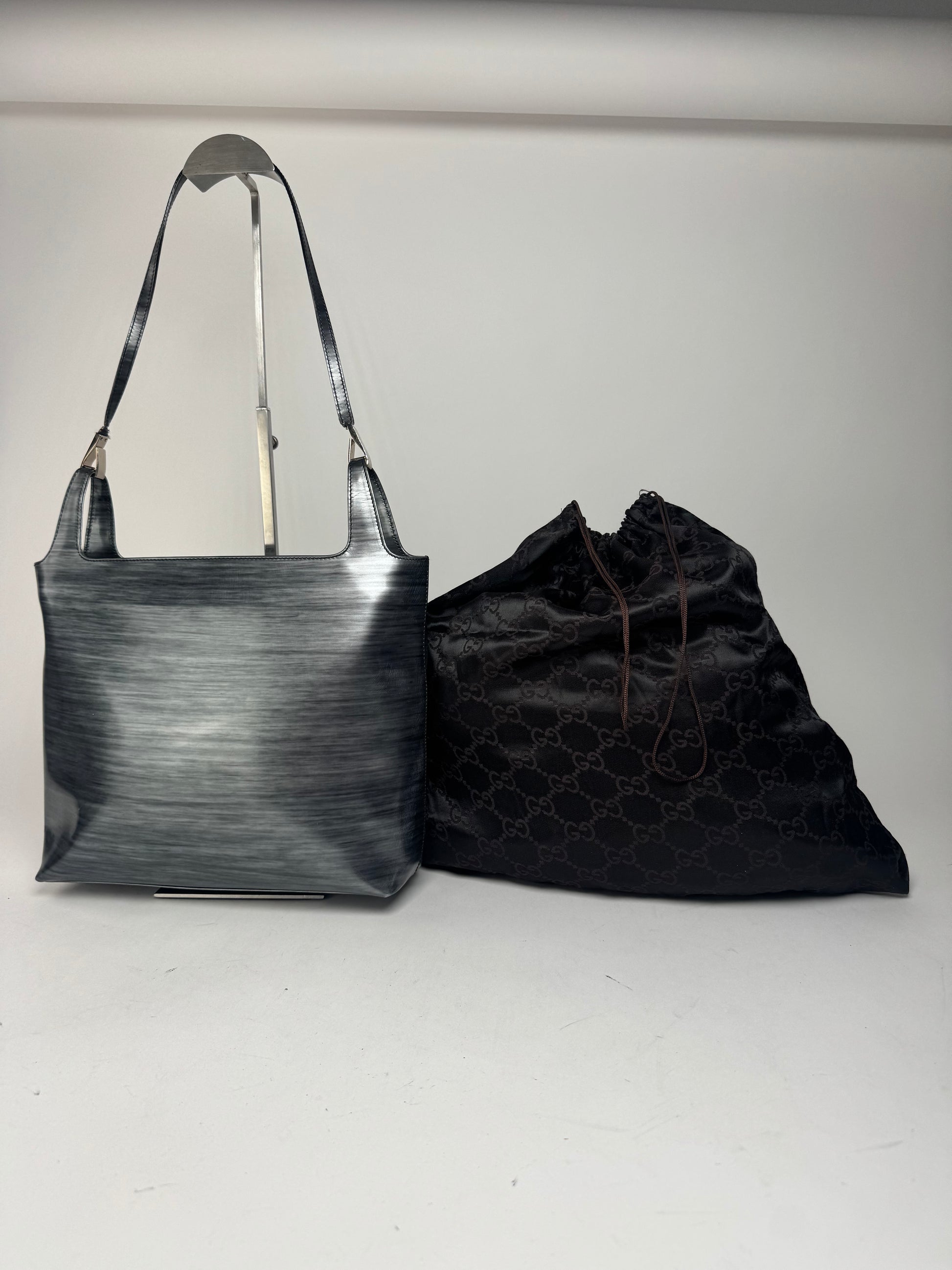 This chic handbag is finely crafted of grey and black striped leather. The bag features a medium-length handle, silver-tone steel hardware, and a top zipper closure. It can be comfortably carried over the shoulder. The interior is lined in black leather.
