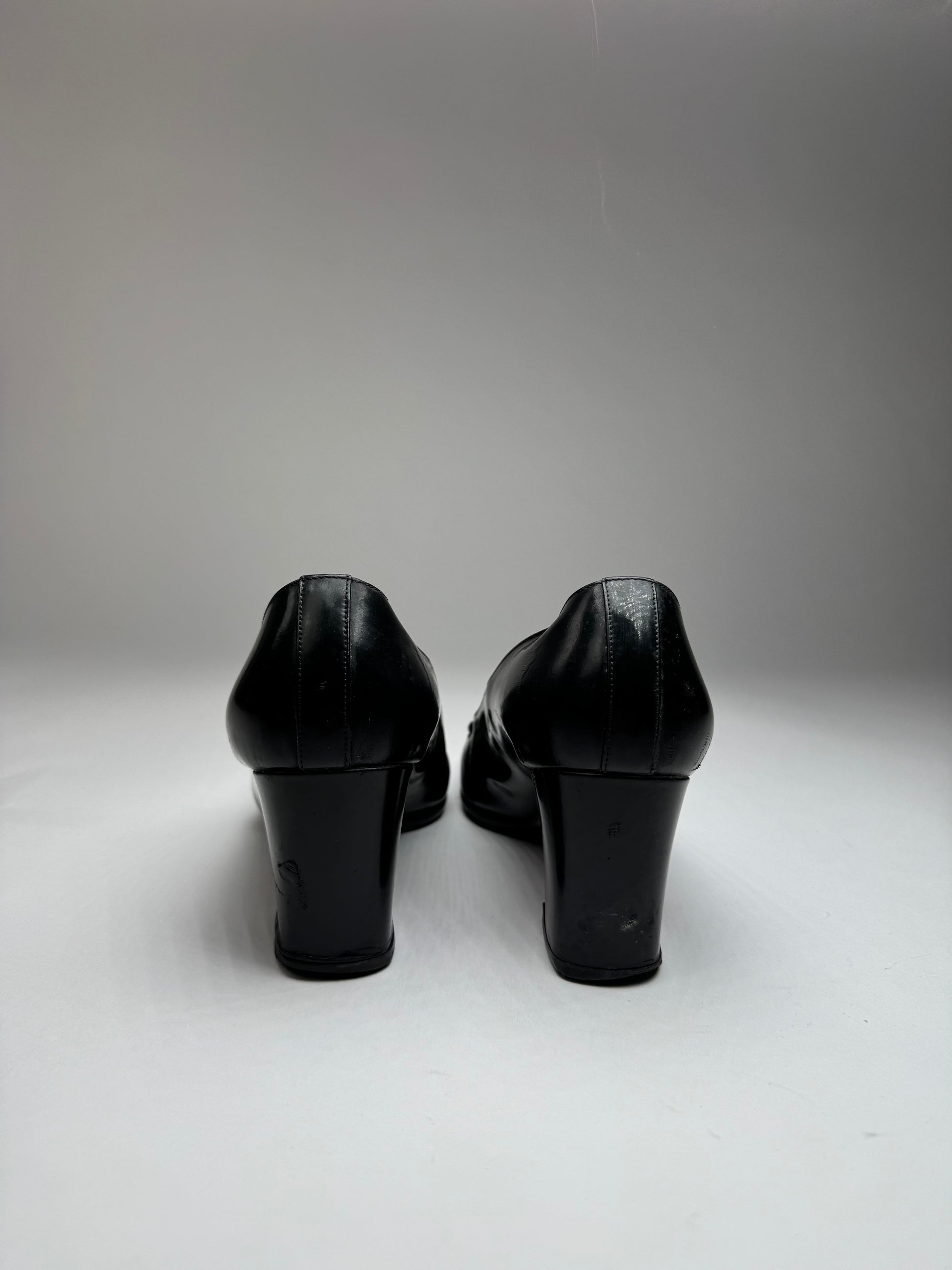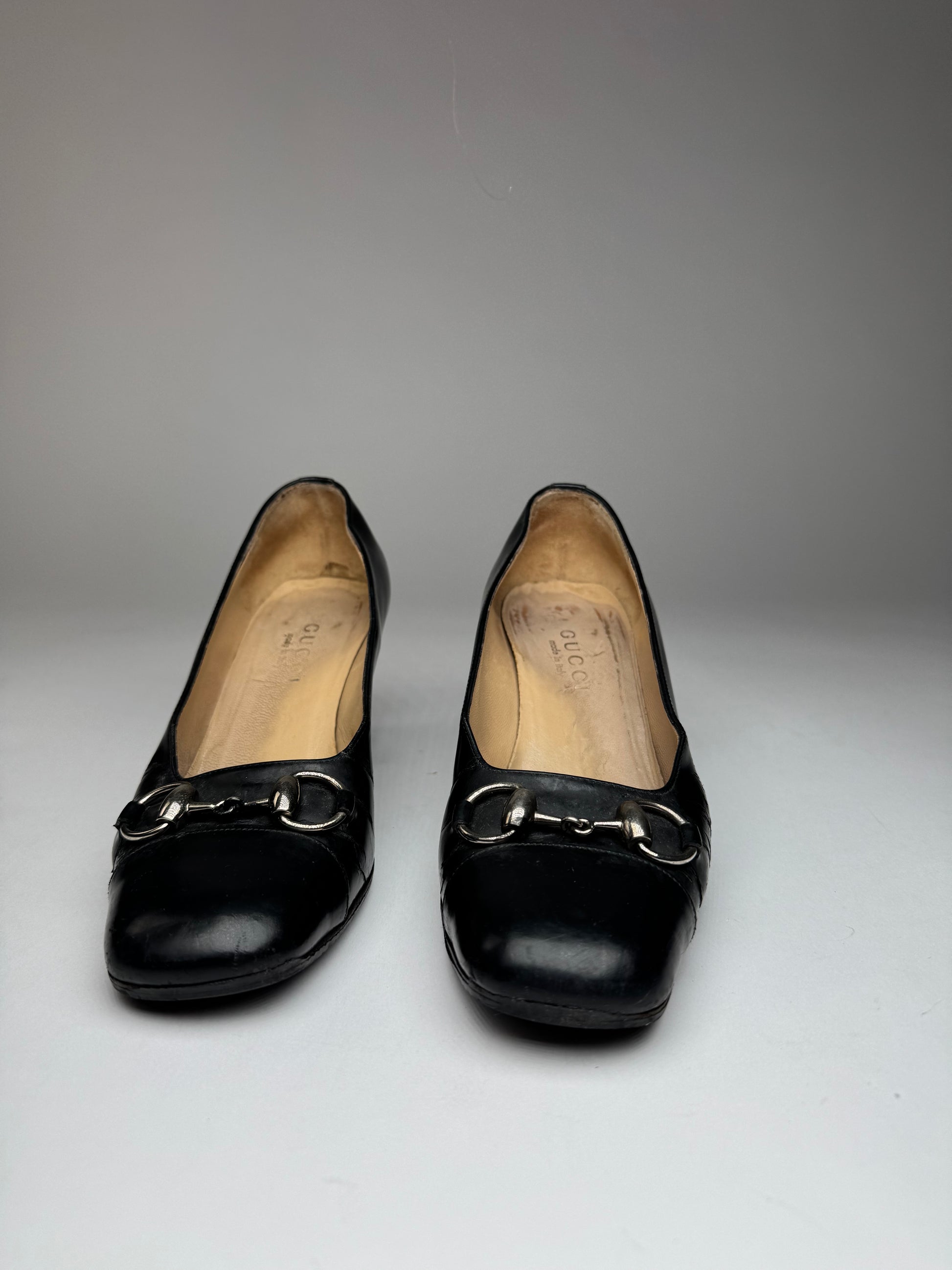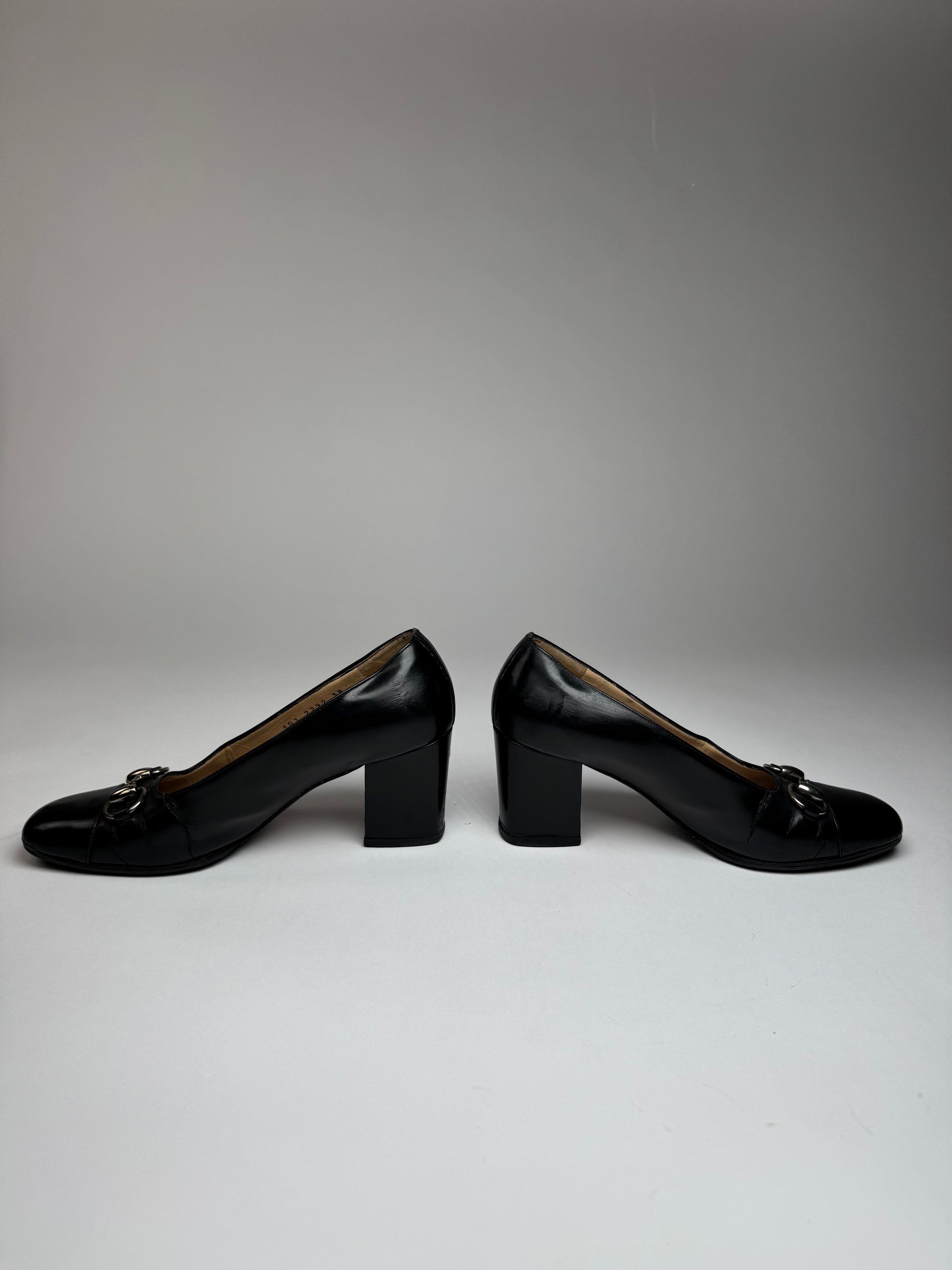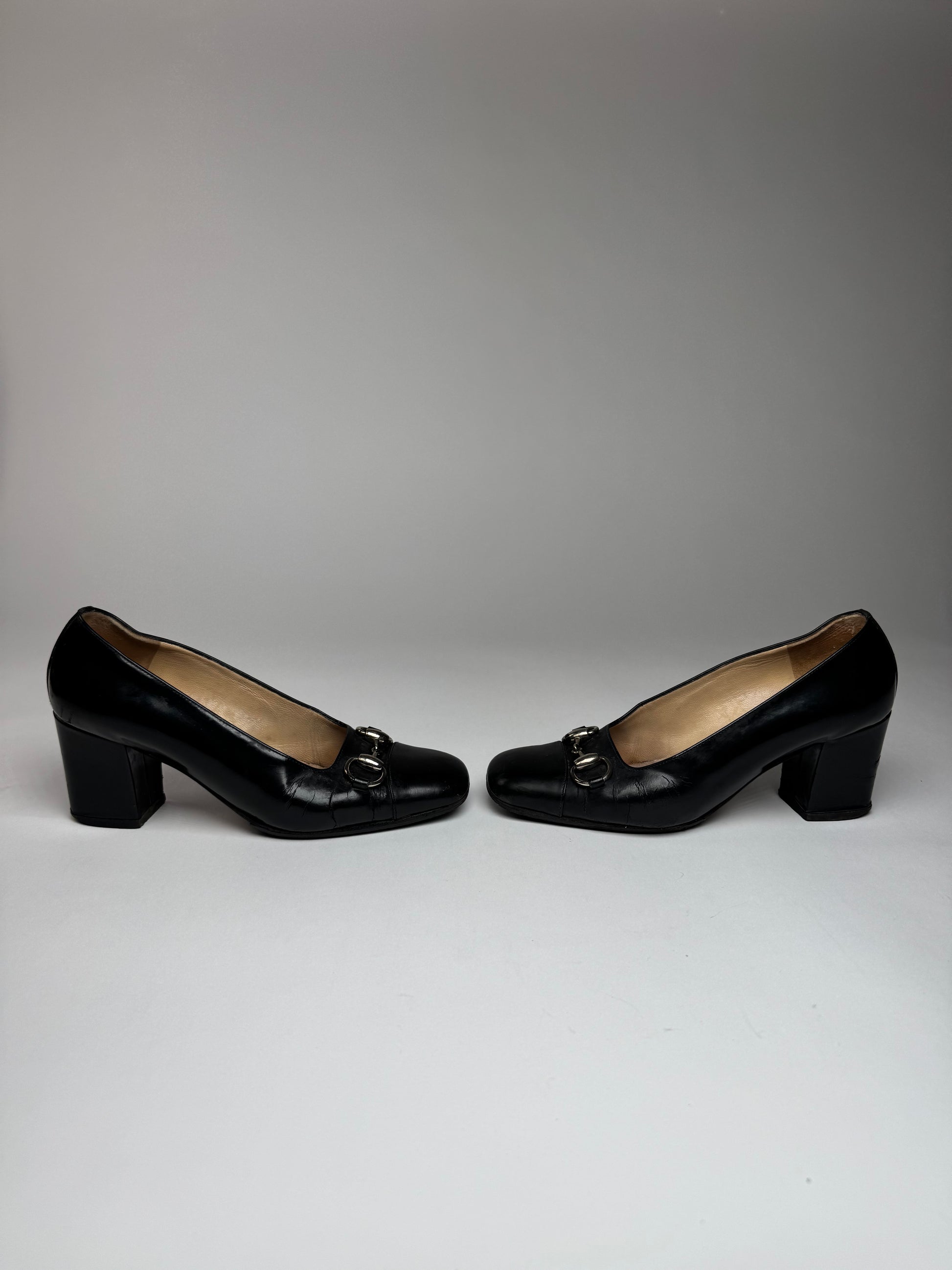 GUCCI Vintage Marmont Pumps. These elegant vintage Marmont pumps from Gucci are crafted from black patent leather, offering a sleek and sophisticated look. The design is complemented by silver-toned steel hardware, adding a refined touch.