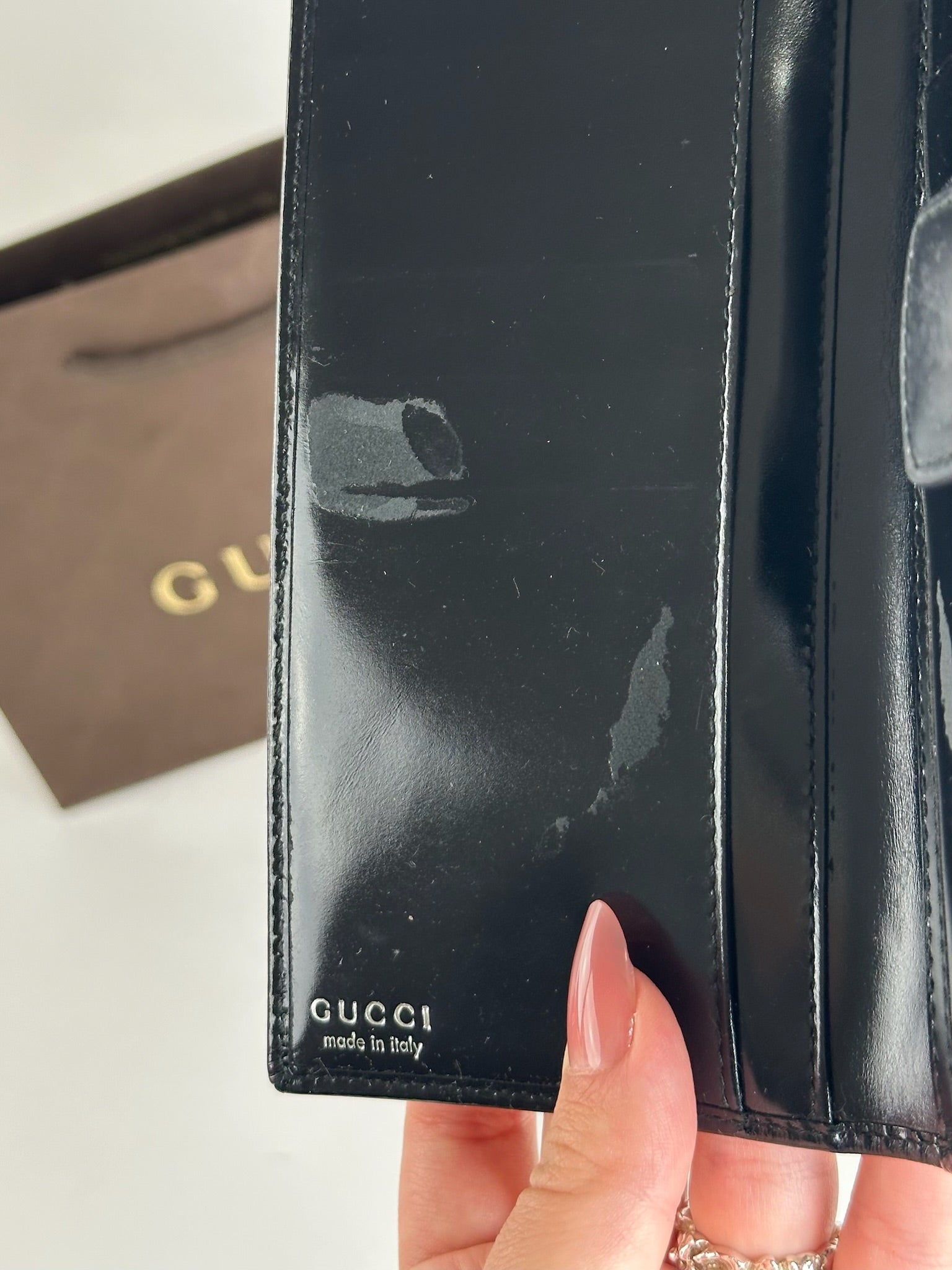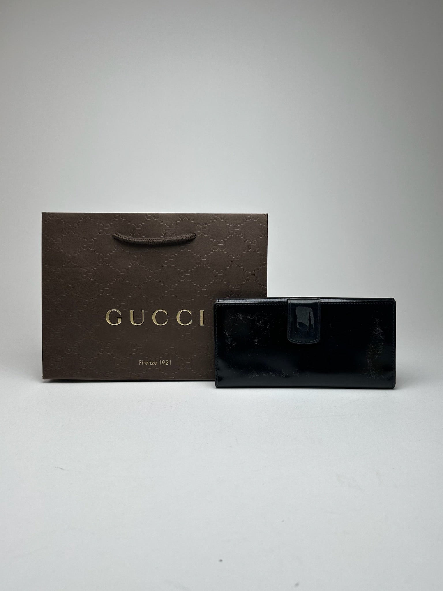 GUCCI Vintage Patent Leather Wallet. This chic wallet is finely crafted of black patent leather with snap closures on both front and back. It features a gold-tone steel strap detail. The interior is finished in matching black patent leather.