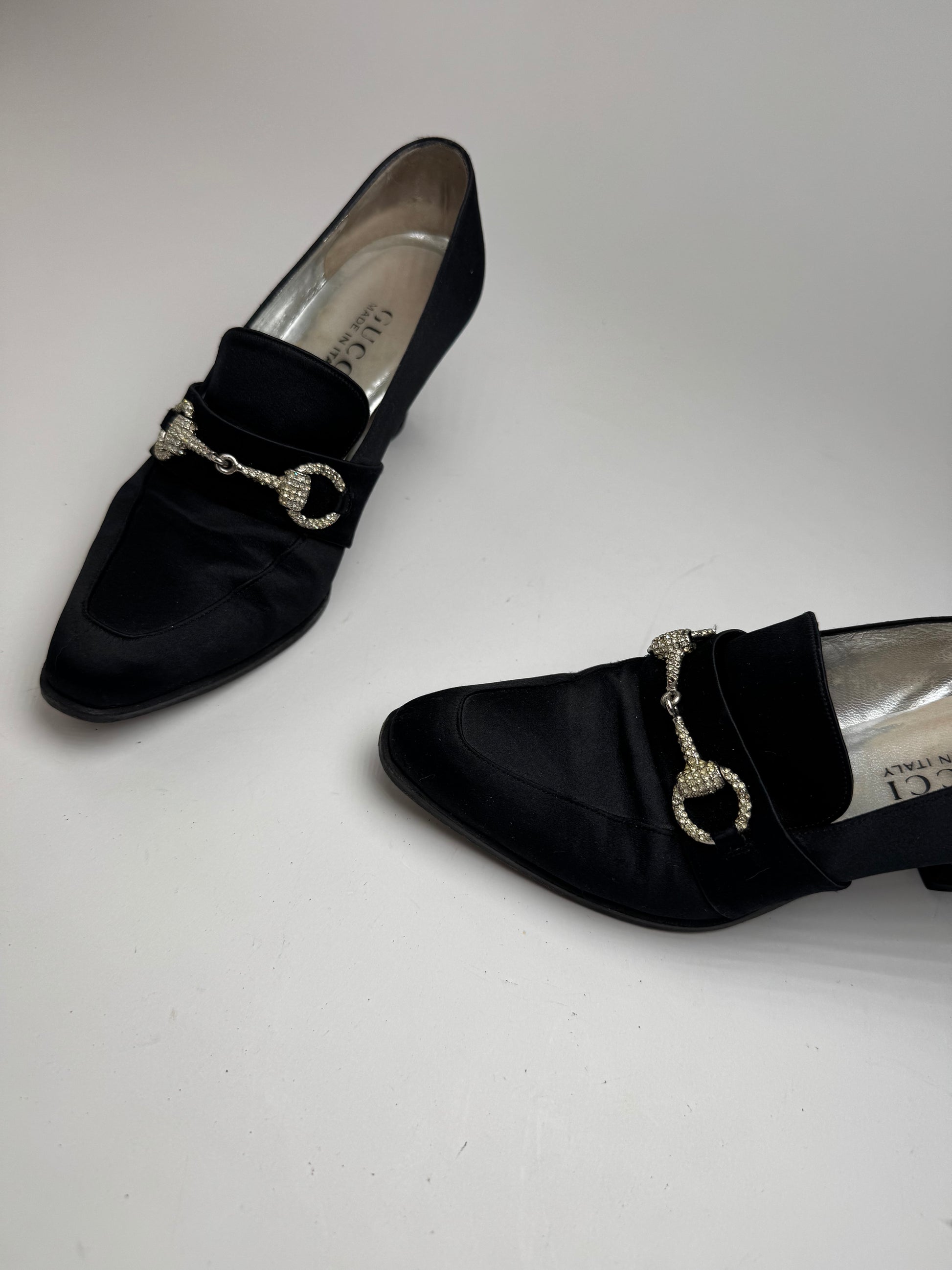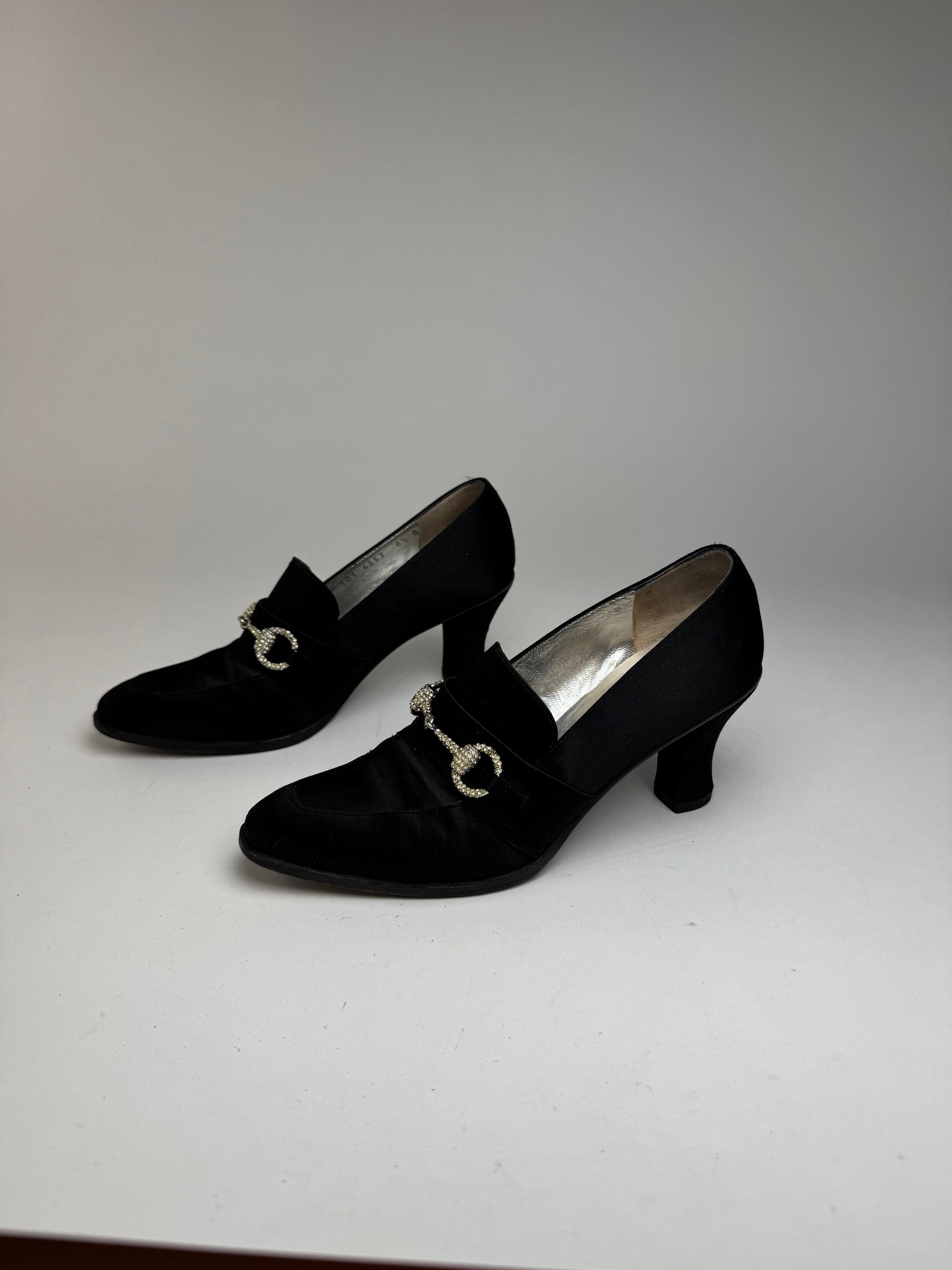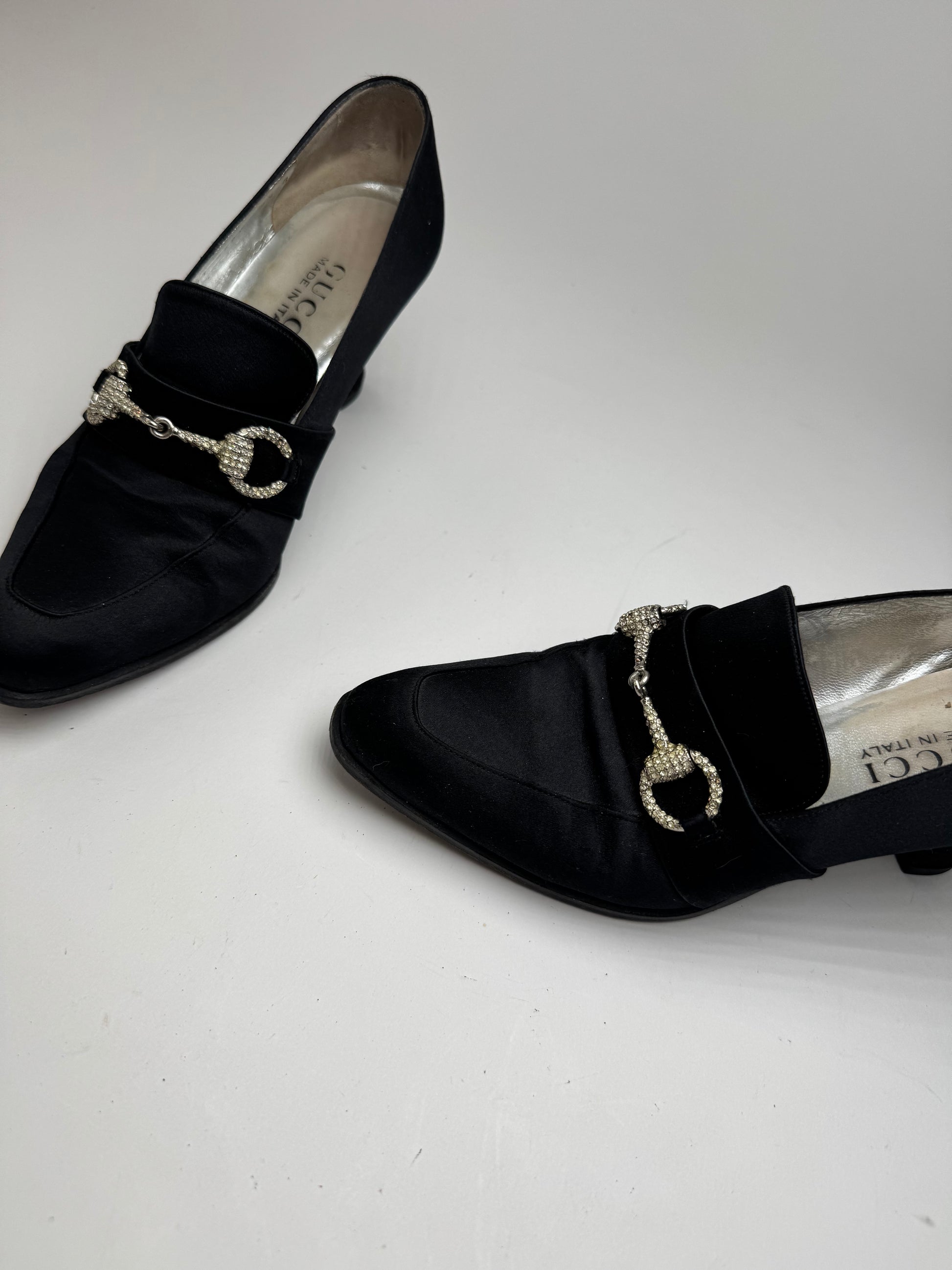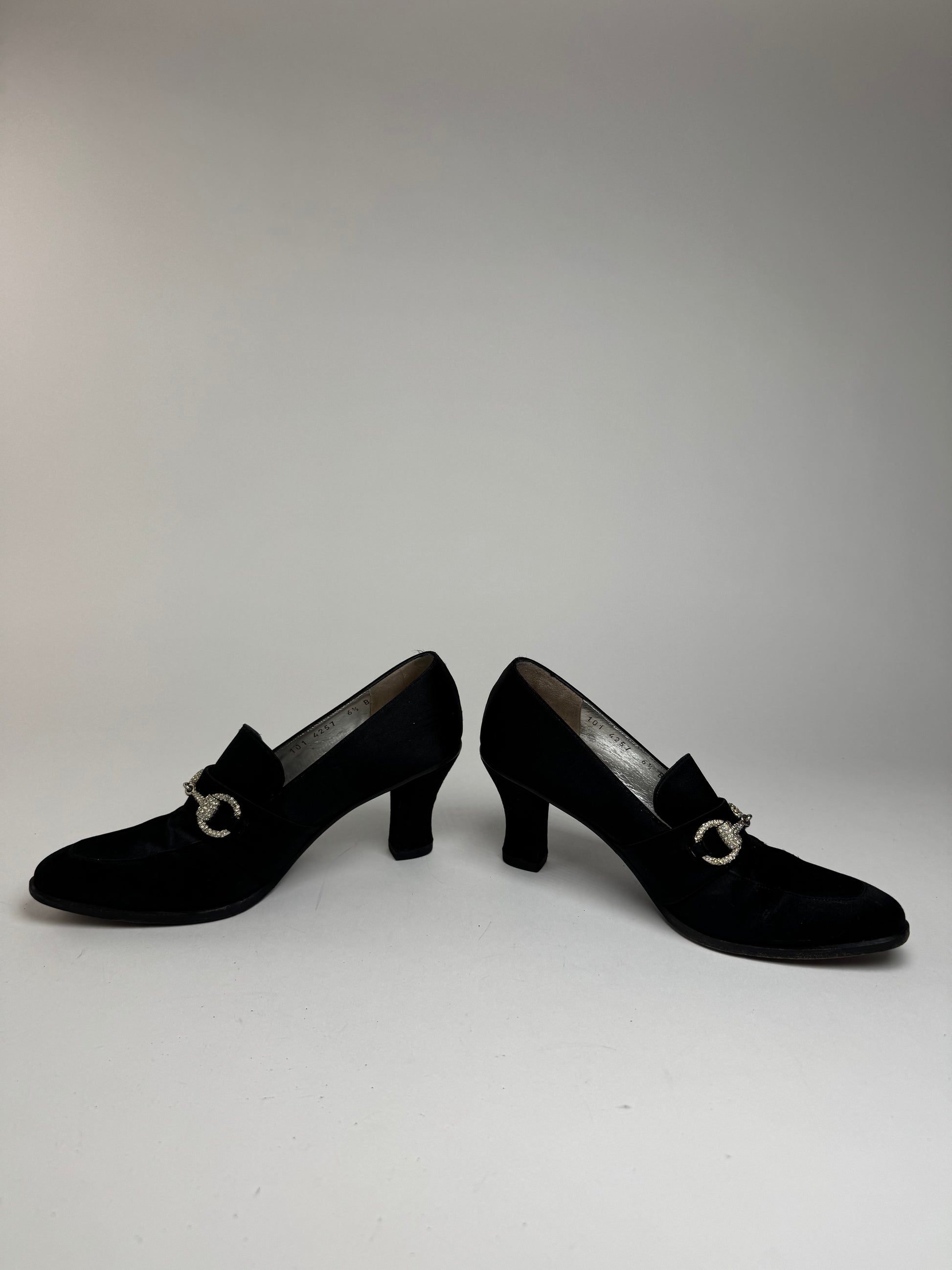 These elegant vintage pumps are crafted from smooth leather overlaid with a velvet-like fabric in classic black. They feature Gucci’s iconic Horsebit hardware—first introduced in the 1950s as a nod to the brand’s equestrian heritage—rendered here in silver-tone steel and adorned with sparkling Asparovski crystals. Displayed in size 6.5 (EU 37).