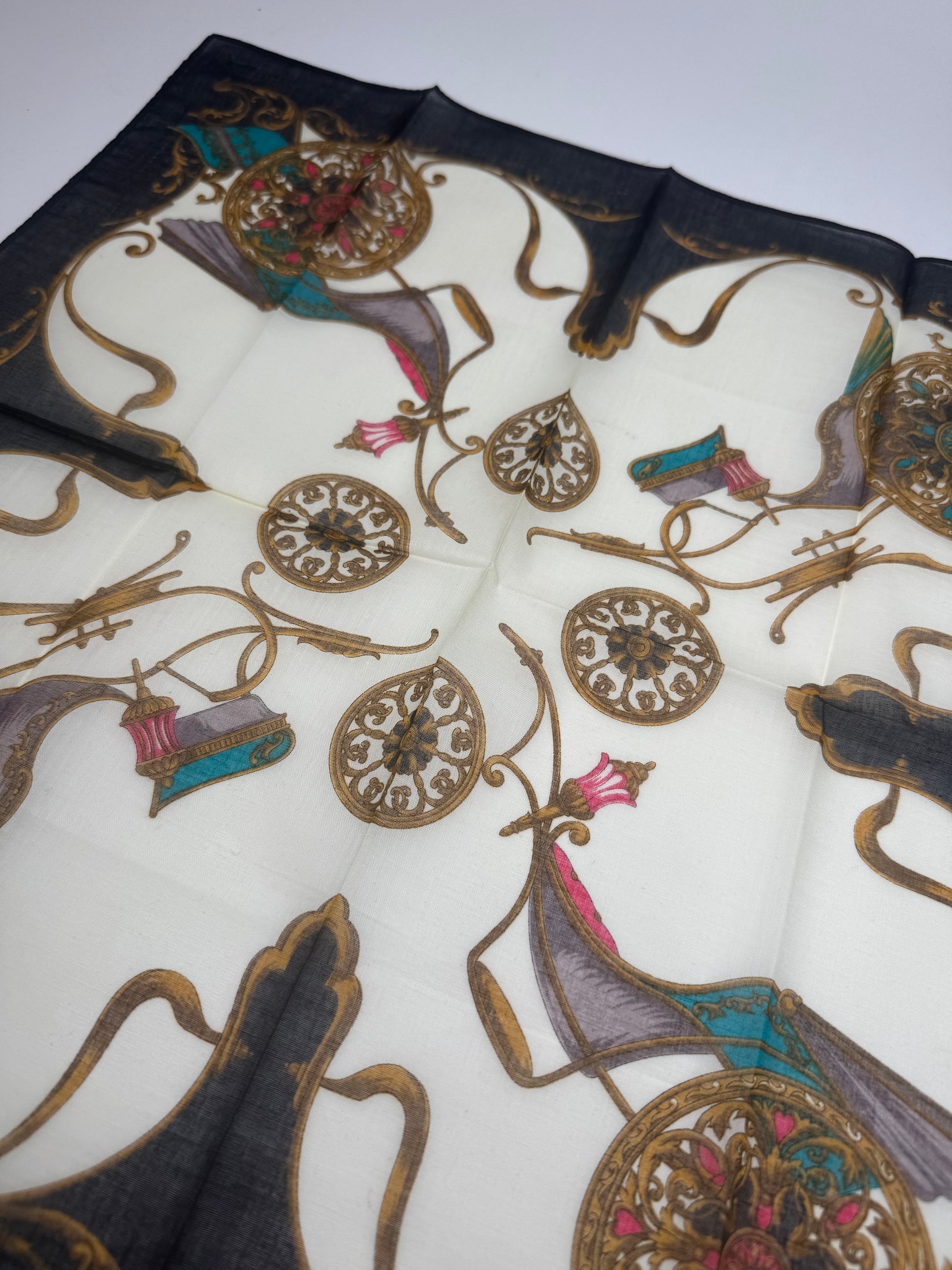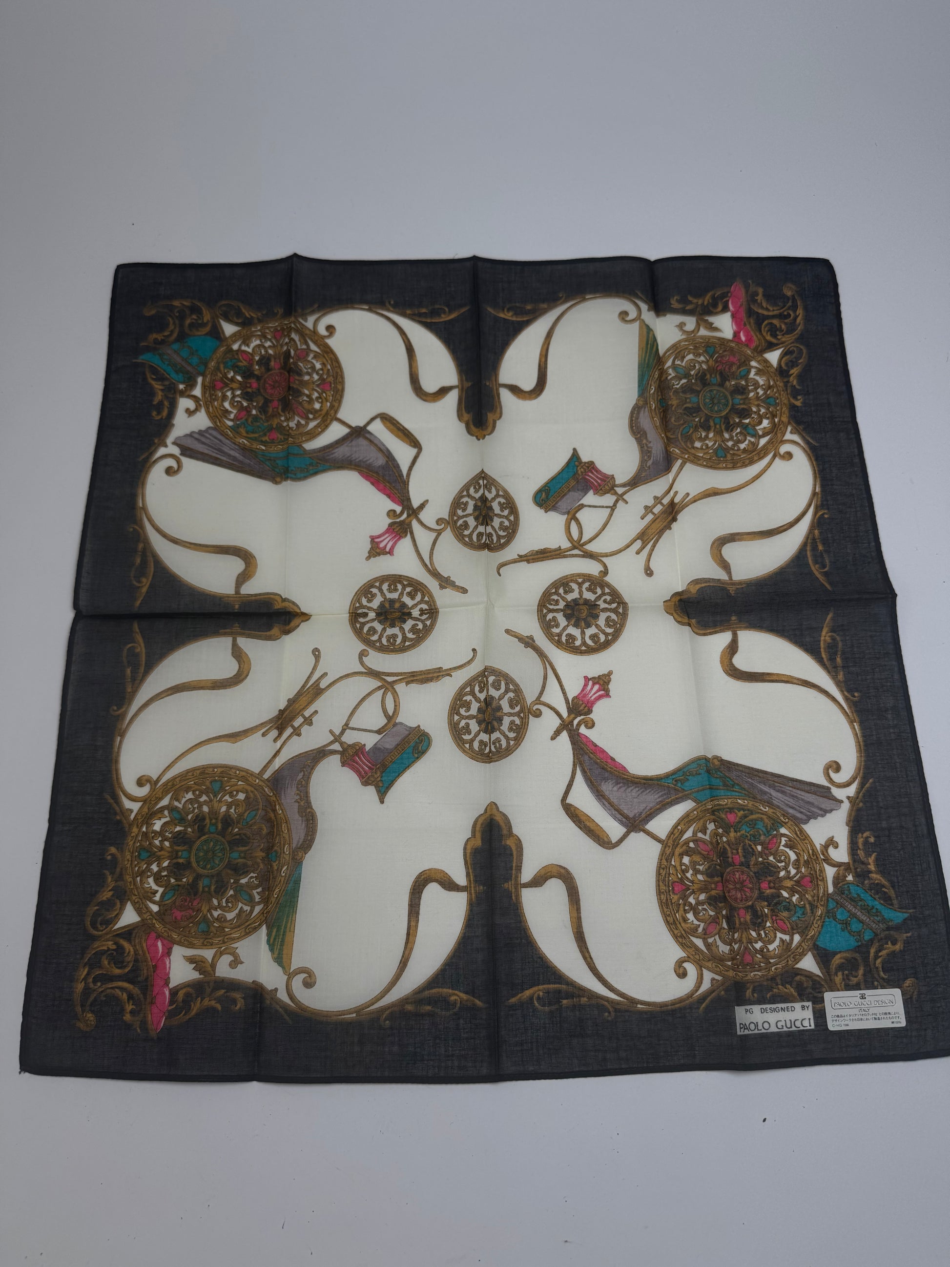 GUCCI Paolo Gucci Baroque Silk-Cotton Scarf. This striking scarf is finely crafted of a silk and cotton blend and features a baroque-inspired design in black, gold, green, and red with abstract forms and ornate jewelry motifs. Designed by Paolo Gucci—grandson of founder Guccio Gucci—who was known in the 1980s and early 1990s for infusing Gucci pieces with bold colors and opulent prints that stood apart from the brand’s classic aesthetic.