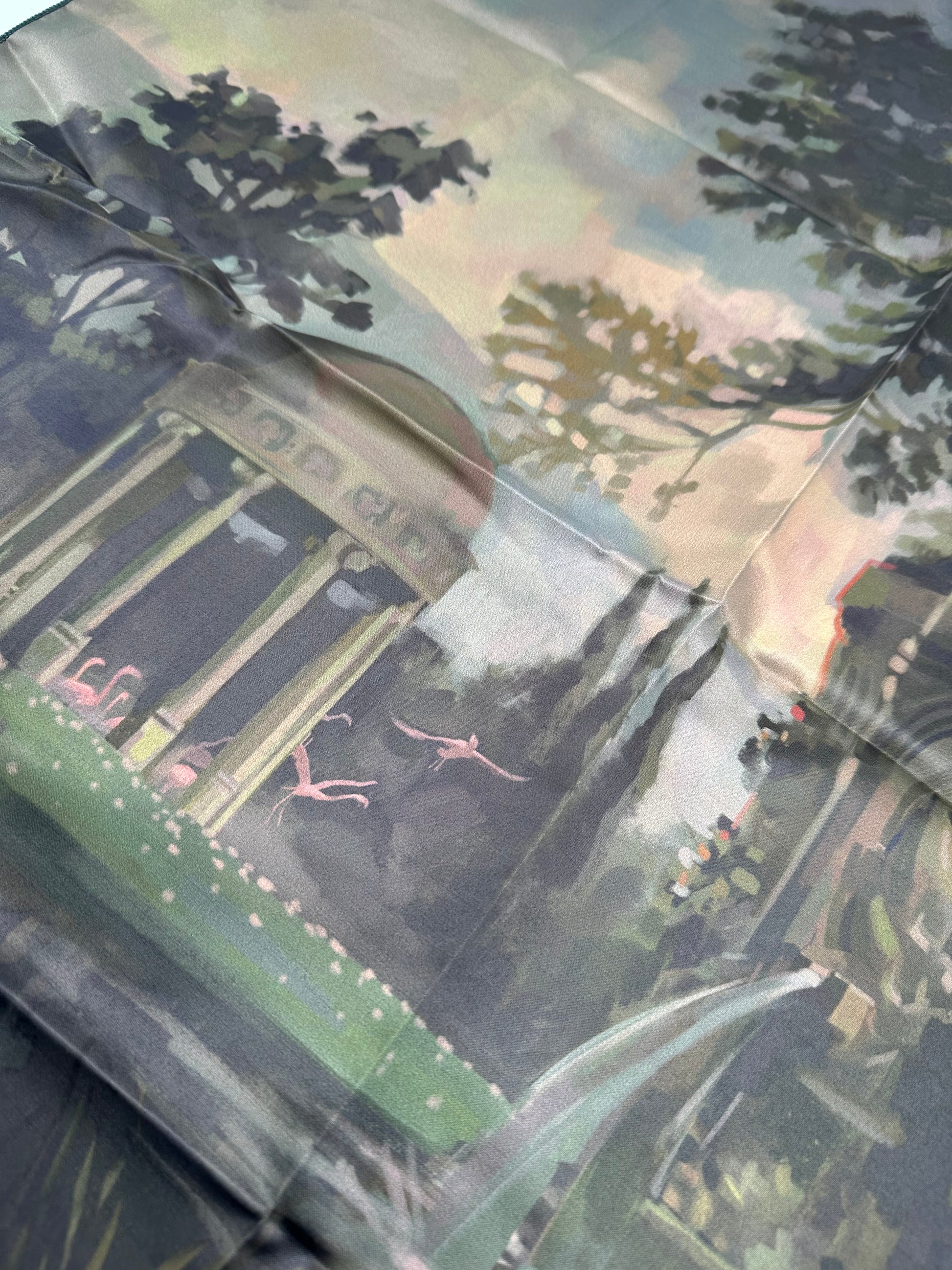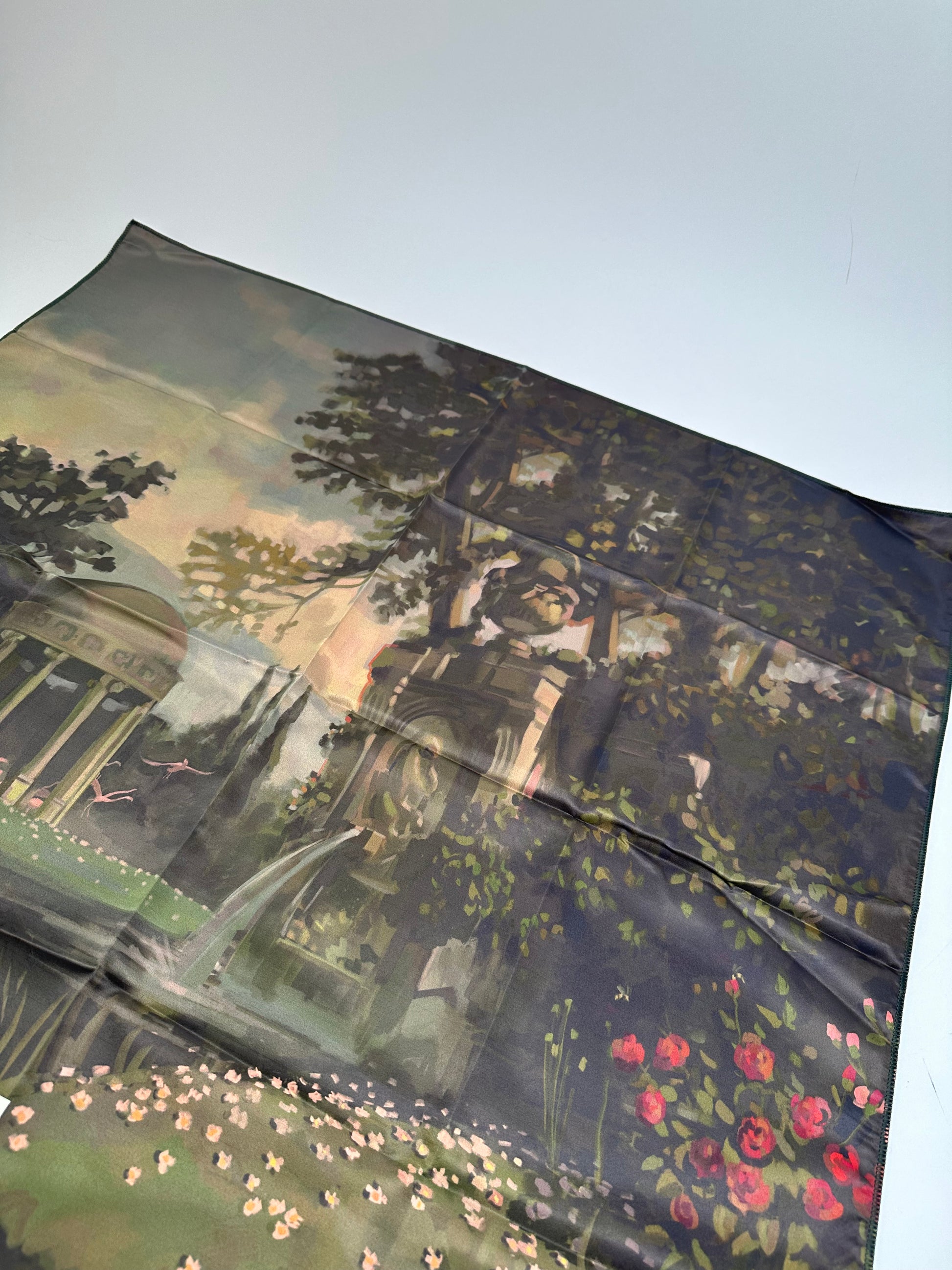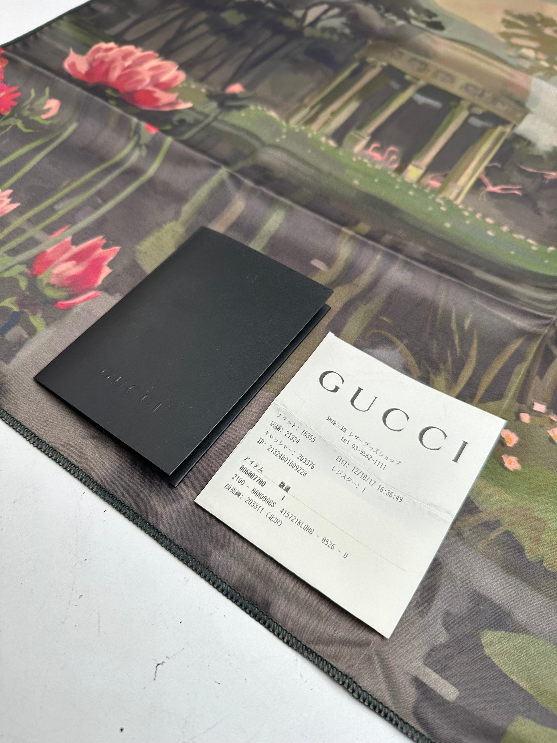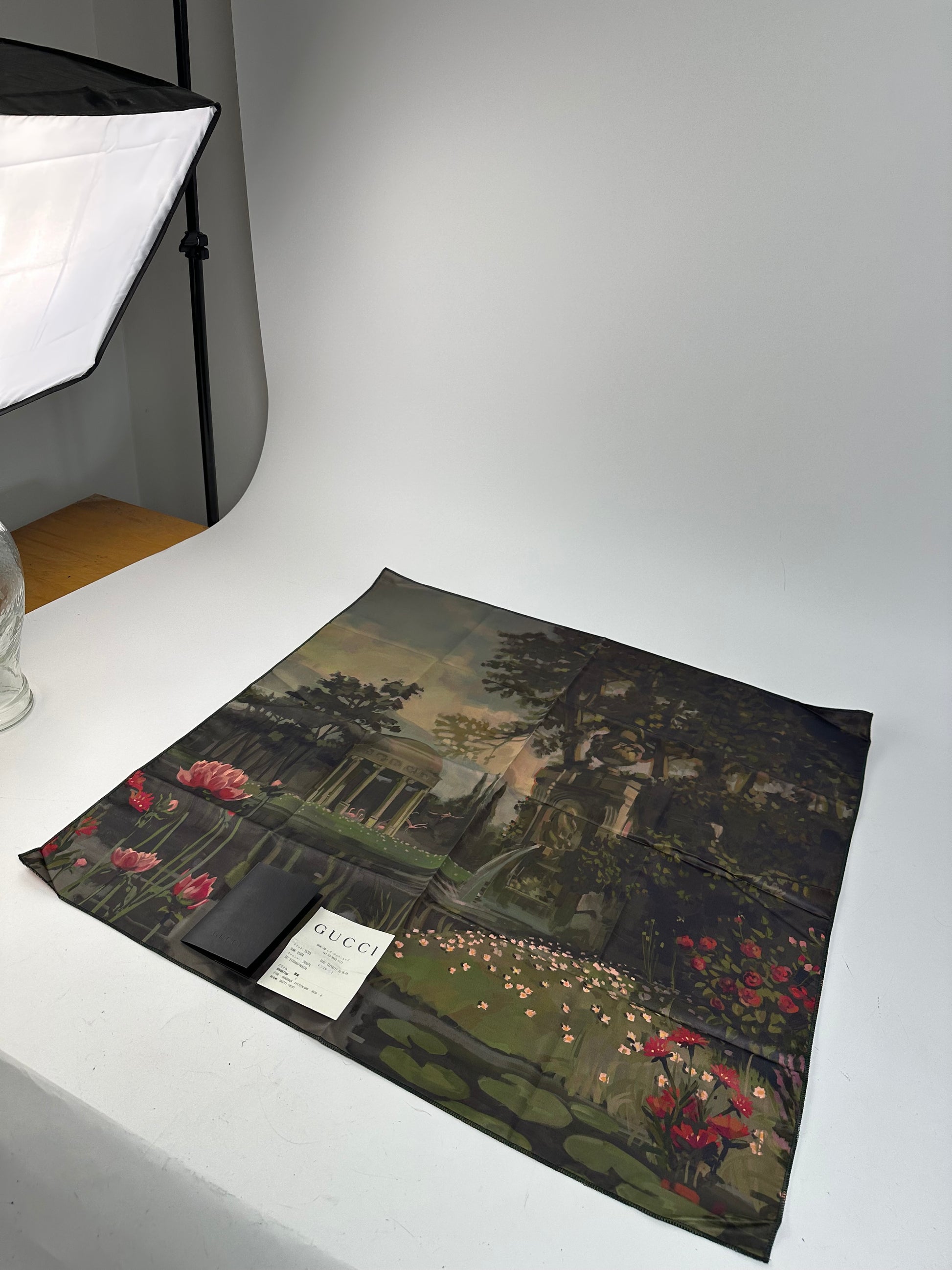 GUCCI Vintage Silk Scarf. This artistic scarf is crafted of 100% silk and features a vibrant multicolor landscape motif with a lake, flowers, and Roman-style buildings set behind a forest with a pond. The reverse side is designed in a bold red tone, creating a striking contrast.